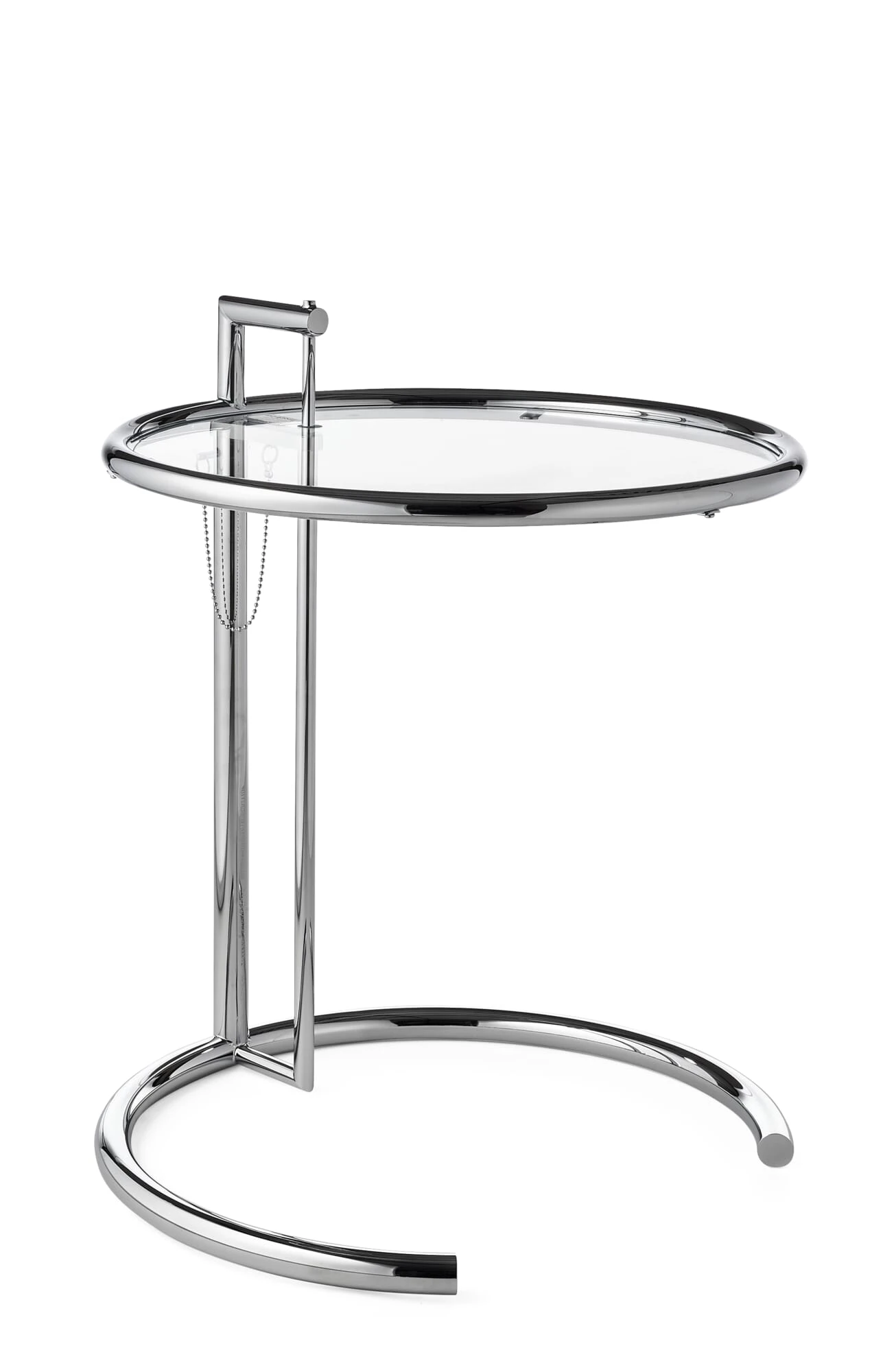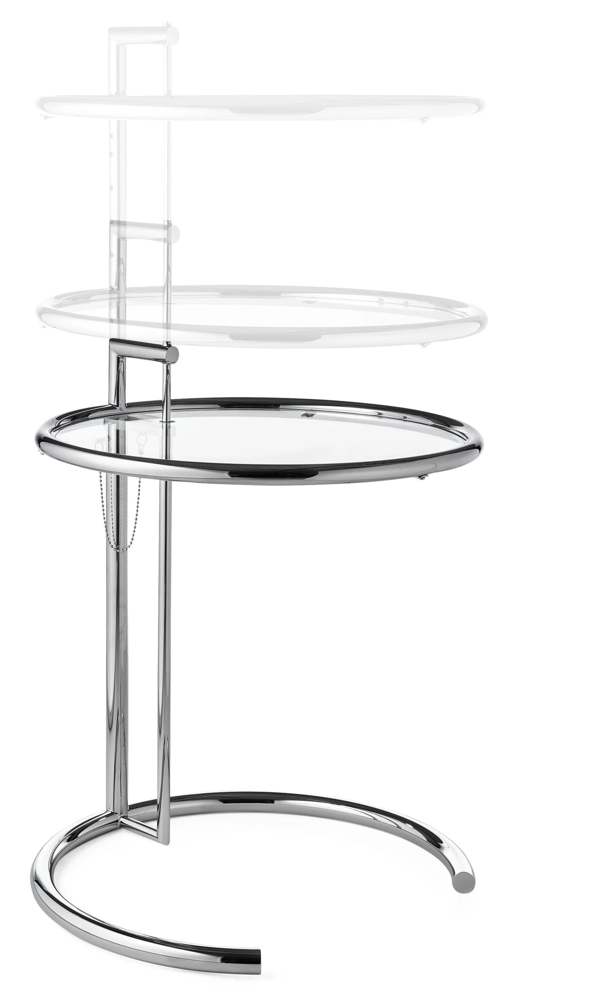 Er zählt zu den bekanntesten wie auch am häufigsten kopierten Möbelstücken der Designgeschichte: der Adjustable Table E 1027 von Eileen Gray (1878–1976). Wie viele ihrer Entwürfe konstruierte die irische Designerin und Architektin auch diesen Beistelltisch zunächst für den eigenen Gebrauch. Gedacht war der variable wie auch variabel einsetzbare Tisch ursprünglich für das Frühstück im Bett. Diesem Anspruch nach Funktionalität entsprechend lässt sich der Tisch aufgrund der einseitigen Stütze und des offen gestalteten Auflagebogens nahezu unter jedes Bett schieben, was allzu ausladende Bewegungen des Nutzers überflüssig macht – sei es beim morgendlichen Griff nach Kaffeetasse und Croissant oder bei der abendlichen Suche nach dem Weinglas oder der Fernbedienung. Mittels eines an einer Kette befestigten Stifts kann die Glasplatte in verschiedenen Höhen arretiert werden und der ganze Tisch am Stahlrohr-Rahmen oberhalb der Glasplatte – wie an einem Griff – gefasst und versetzt werden.