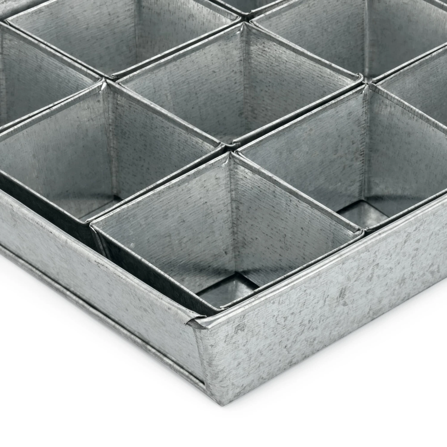 Bei der Jungpflanzen-Anzucht leistet es gute Dienste: Dieses „Tablett“ mit erhöhtem Rand kann je nach Ausführung bis zu 70 kleine Rahmen aus Stahl (Einzeltöpfe ohne Boden) aufnehmen. Es wird mit Erde befüllt, damit direkt hineingesät werden kann. Stecklinge oder vereinzelte Jungpflanzen lassen sich ebenfalls einsetzen. Da die Rahmen nur lose auf der Platte stehen, können sie jederzeit leicht entnommen werden, ohne dass dabei die empfindlichen Wurzelballen beschädigt würden; die konische Form erleichtert das Herausdrücken der Ballen im Ganzen – und somit auch das Umpflanzen in Beet oder Topf.