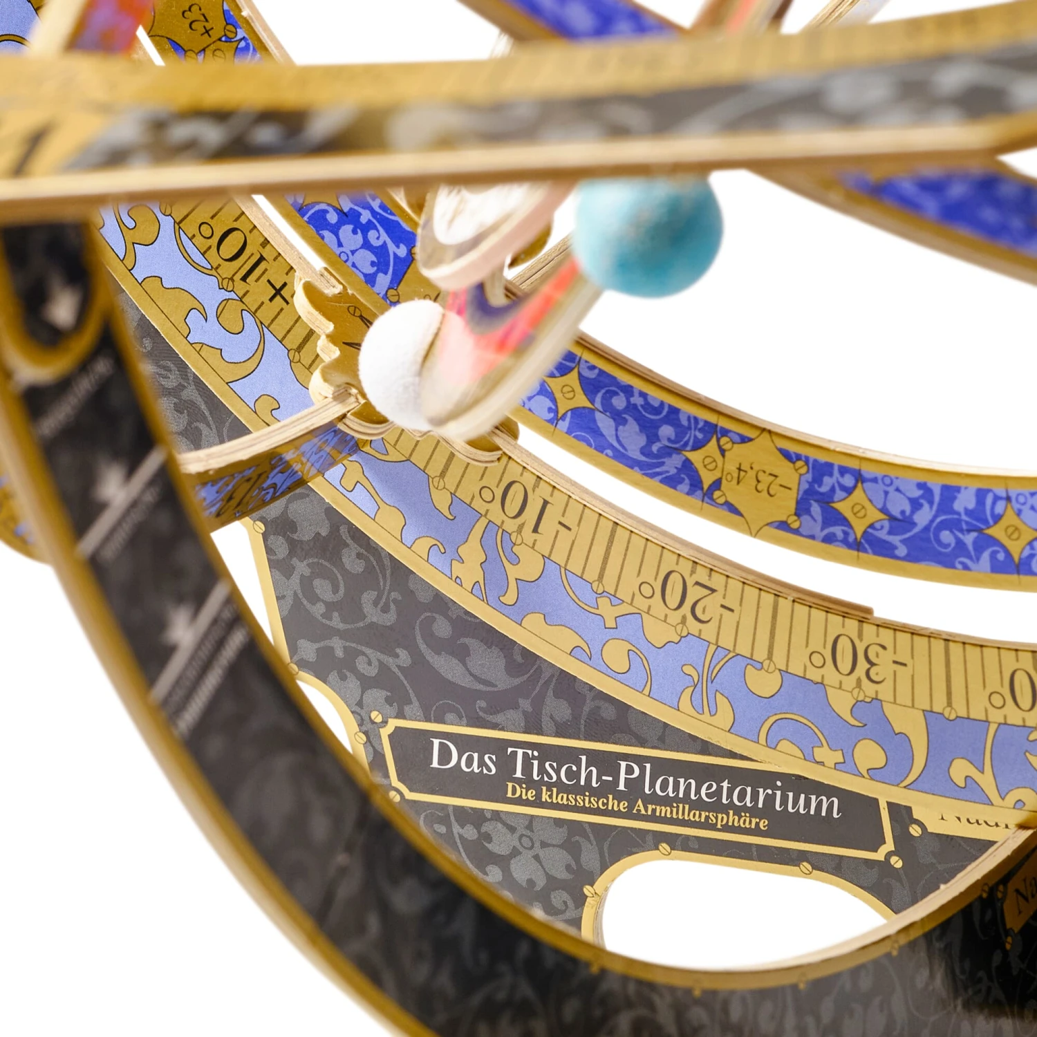 Am besten legen Sie schon einmal Lackstifte oder Deckfarbe bereit, um Sonne und Planetenkugeln anzumalen, bevor Sie mit dem Zusammenbau beginnen. Zusätzlich benötigen Sie Alleskleber, ein Bastelmesser und etwas feines Sandpapier. Eine verständliche Bauanleitung liegt dem Tisch-Planetarium bei, darin wird auch ausführlich erklärt, wie Sie die Armillarsphäre einstellen und anwenden.