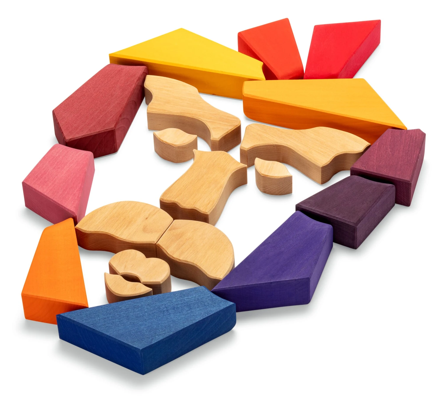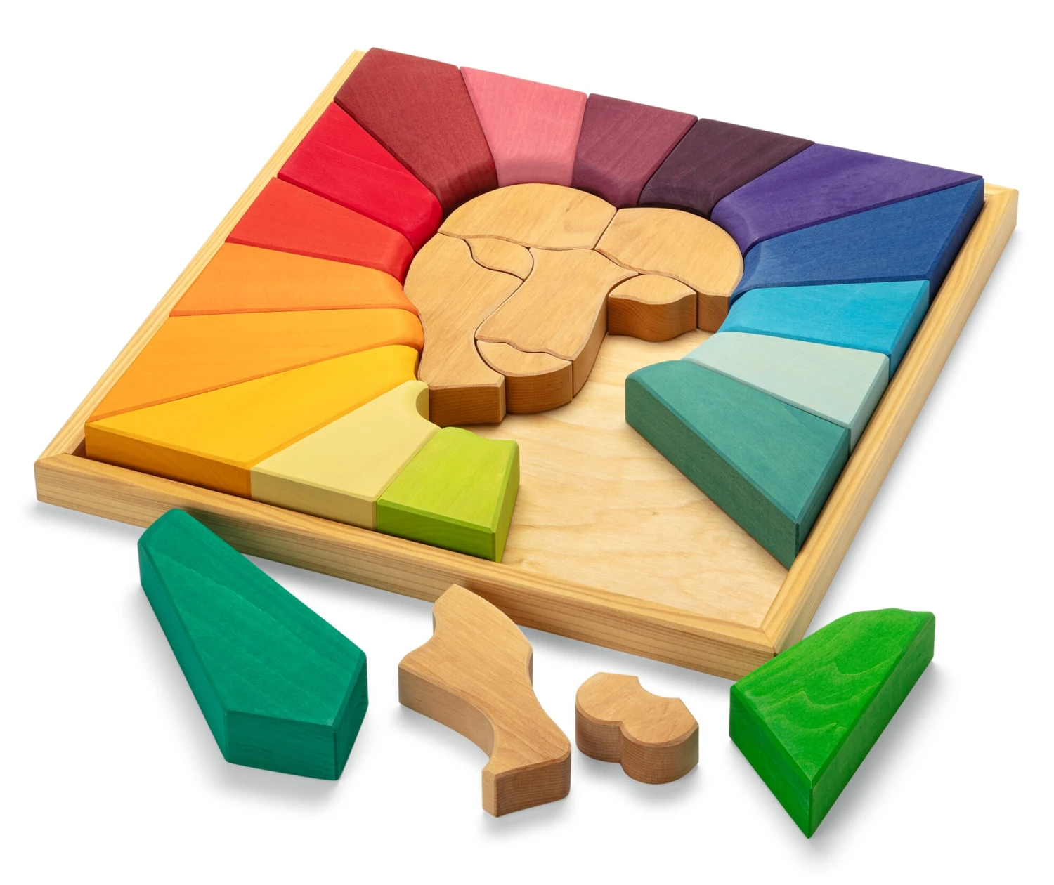 Ein Baukasten, dem die natürliche Stärke eines Löwen innewohnt – und der eine neue Sicht auf die Dinge herausfordert. Denn die teils organisch, teils streng geometrisch geformten Bauteile lassen sich nicht nur wie ein Puzzle zum farbenfrohen König der Löwen zusammensetzen. Vielmehr wohnt jedem Element eine Vielseitigkeit inne, aus der sich weitere Welten erschaffen lassen: Da fügen sich Nase und Brauen des Löwen zu einem Baum mit ausladender Krone, die Wangen entpuppen sich als Schafe, in anderer Kombination schaut einem das Gesicht eines Zauberers unter spitzem Hut entgegen und die Mähne verwandelt sich in eine vieltürmige Regenbogenburg.
