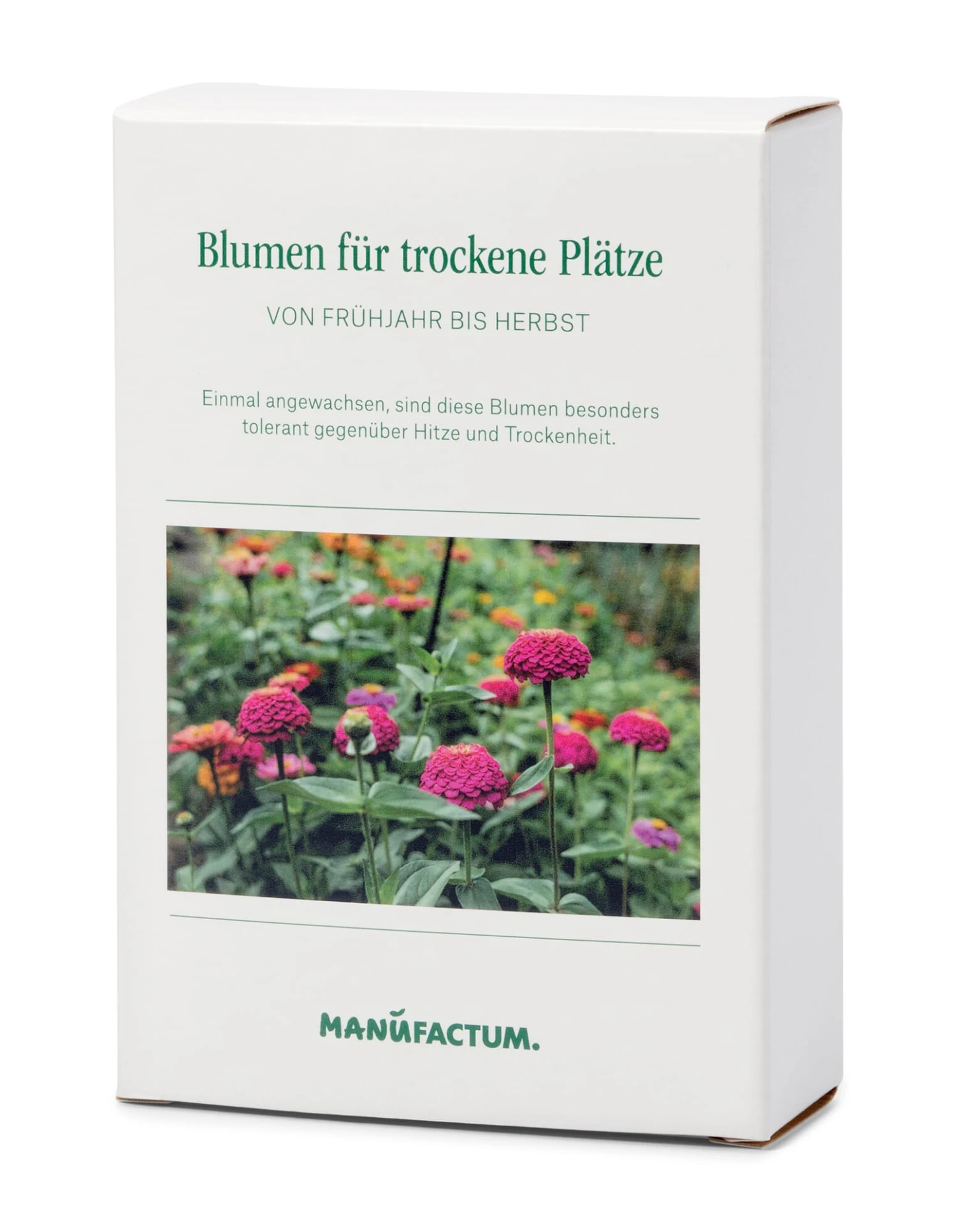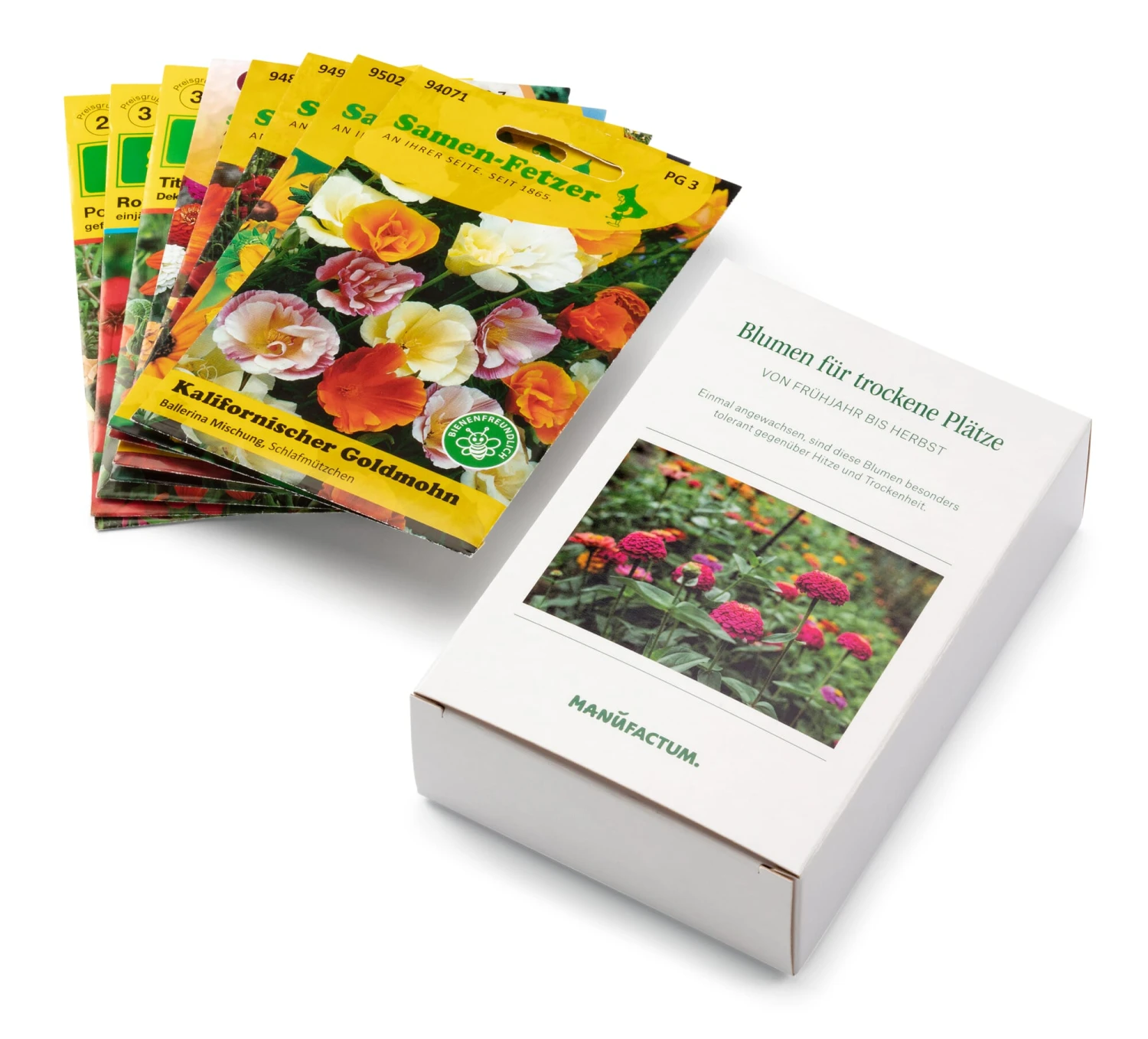 Und womit? Na, ganz einfach! Mit Blumen, und zwar solchen, denen Wärme und längere Regenpausen nichts ausmachen. Denn wenn wir einmal ehrlich sind: Auch in unseren Gärten ist der Klimawandel bereits spürbar angekommen. Zumindest an den zunehmenden Trockenphasen kommen wir nicht mehr vorbei, da schon die Frühjahrsmonate April und Mai inzwischen meist so warm sind wie der Sommer selbst und es in dieser Zeit auch kaum nennenswerte Regenfälle zu verzeichnen gibt. So setzt es sich die Saison über fort – häufig ist es einfach zu trocken. An heißen Standorten im Garten oder auf dem Balkon muss daher umgedacht werden, möchte man als Gärtner*in nicht ständig Verluste in Form von Vertrocknen beklagen – und mit den Gießwasservorräten in der Regentonne dennoch möglichst sparsam umgehen. Für unser exklusives Blumensämereien-Set haben wir acht Arten ausgewählt, die trockenheitsverträglich sind. Mexikanische Sonnenblume, Zinnie, Sonnenhut, Roter Lein und Kalifornischer Goldmohn, um nur einige zu nennen, erfreuen auch in heißen Sommern mit einem ausgesprochenen Blütenreichtum. Alle lassen sich einfach im eigenen Garten ziehen – einmal angewachsen, sind sie auch recht pflegeleicht. Beachten Sie nur, dass Sie in der Phase der Aussaat und nach dem Auspflanzen der Sämlinge in Ihre Beete zunächst regelmäßig gießen.
