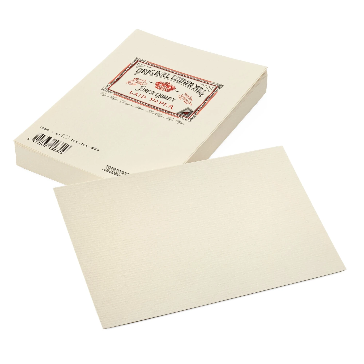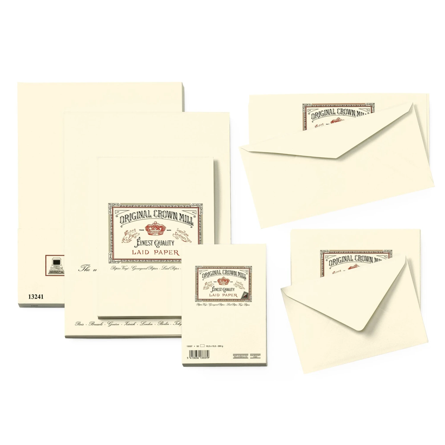 Neben dem Briefpapier (100 g/qm) – in A4 als Briefblock oder Einzelbogen mit Wasserzeichen „Original Crown Mill“ oder in A5 als Briefblock ohne Wasserzeichen erhältlich – bieten wir jeweils die passenden Briefkarten (280 bzw. 300 g/qm) mit einer festeren Struktur sowie gefütterte Kuverts in zwei Formaten an.