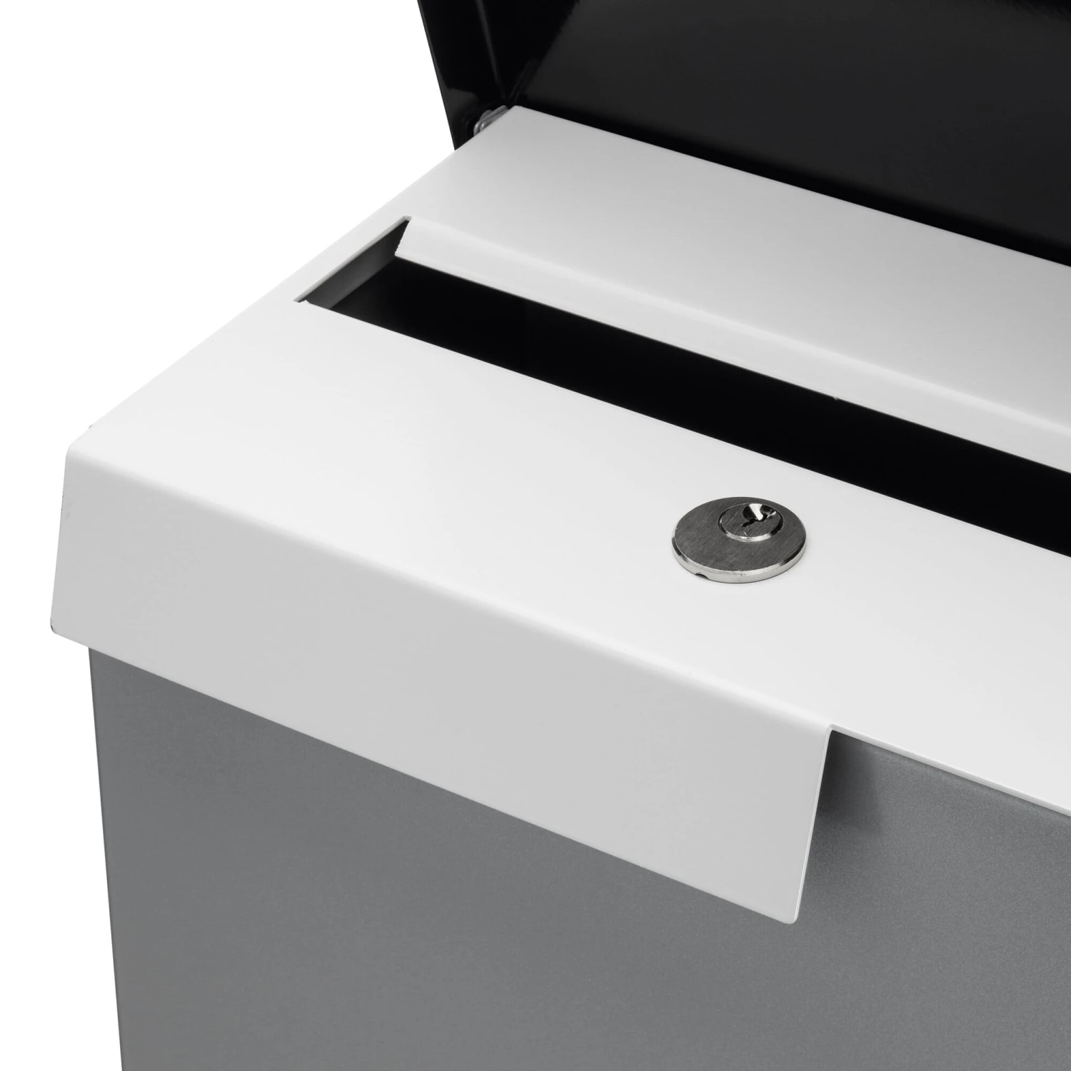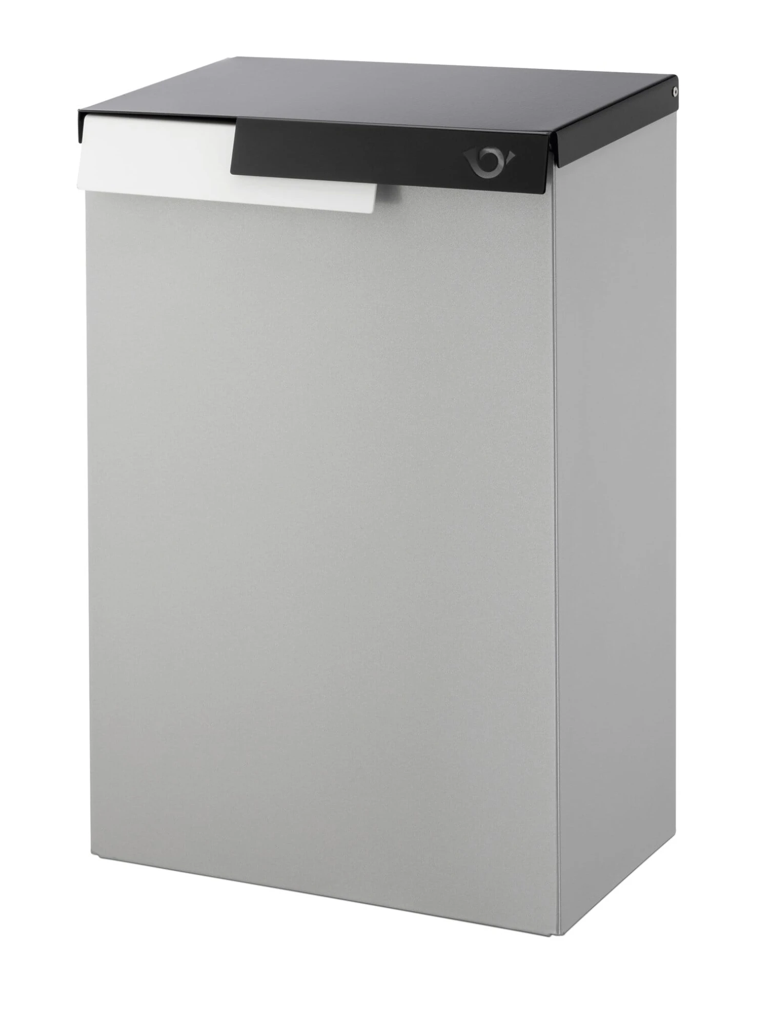 Wir liefern den Briefkasten wie abgebildet dreifarbig (Weißaluminium RAL 9006 / Verkehrsweiß RAL 9016 / Schwarzgrau RAL 7021).