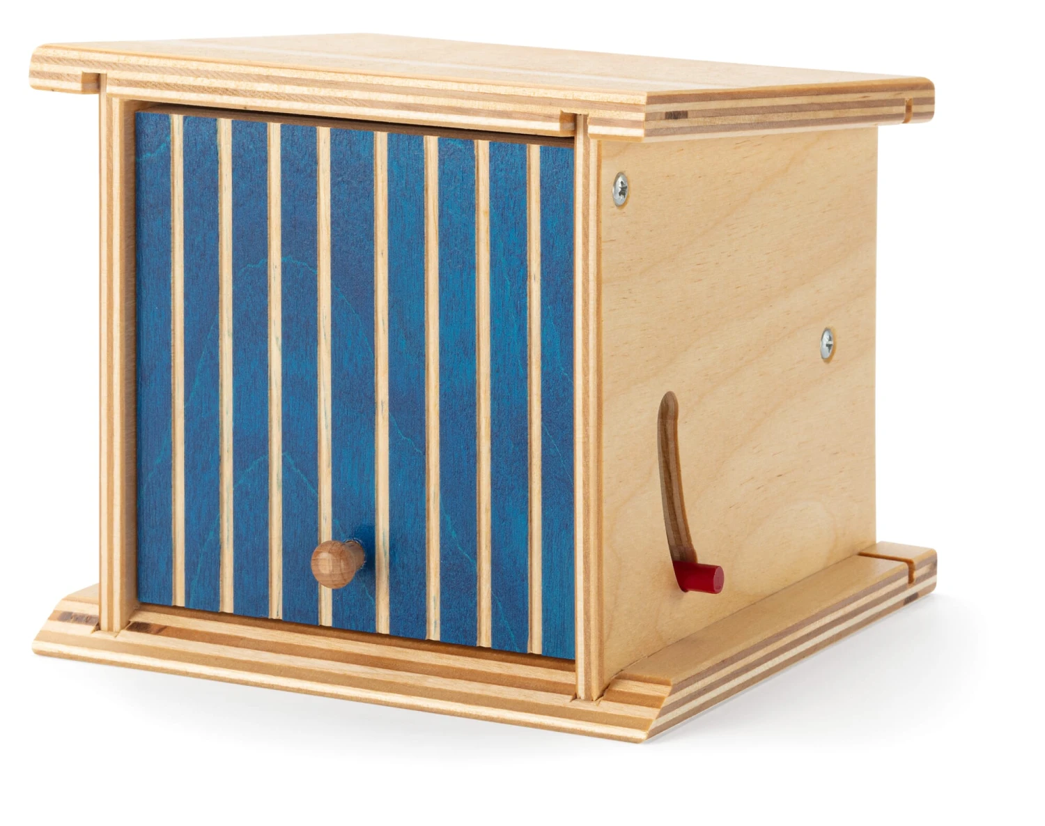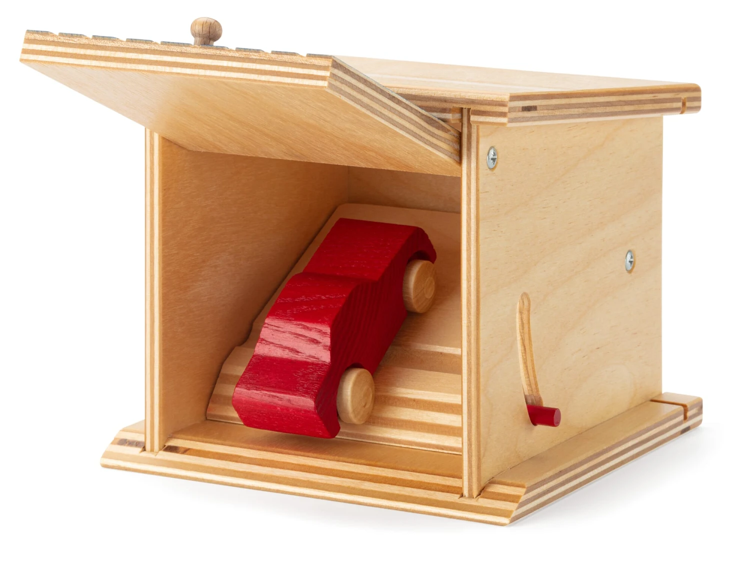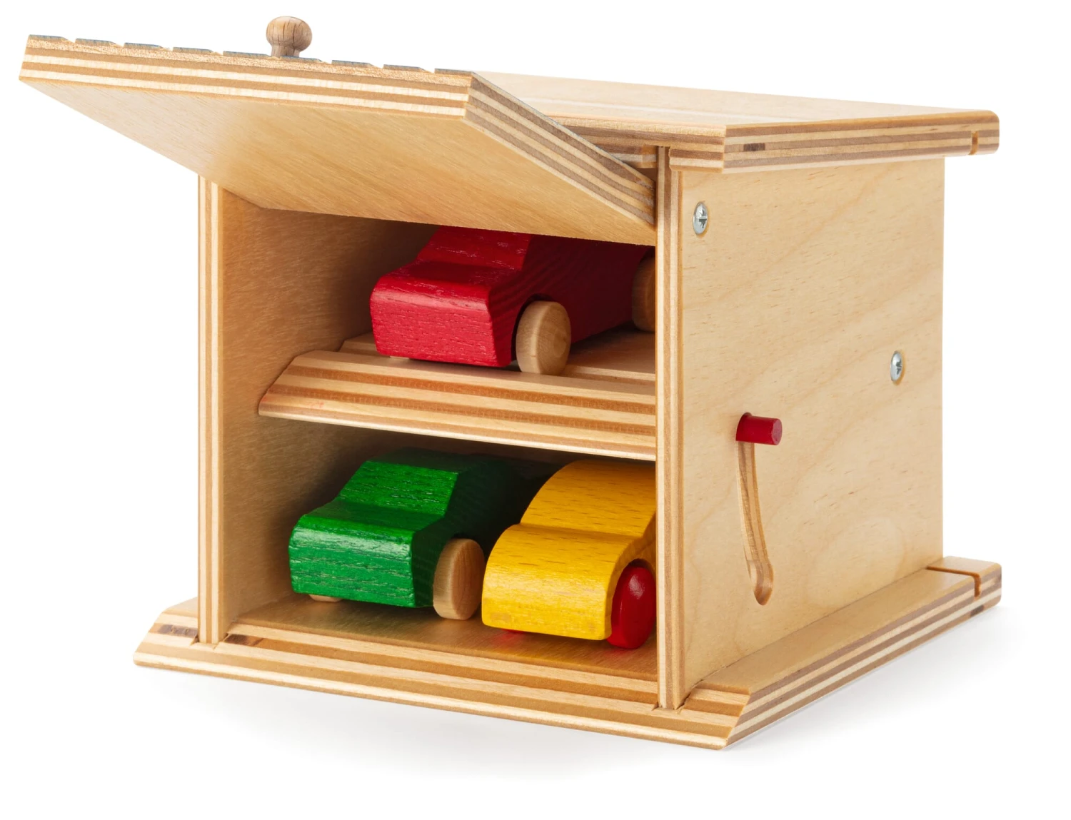 Natürlich ist es ein verführerischer Gedanke, das geliebte Holzspielauto im eigenen Bett schlafen zu lassen – doch was, wenn das Auto lebhaft träumt und im Traum anfängt zu hupen? Oder wenn ich mich versehentlich aufs Auto wälze und es keine Luft mehr bekommt? Also doch lieber einen Schlafplatz in der Doppelgarage freiräumen. Dort kann sich das Spielauto, sollten es bei Vollmond schlaflose Nächte plagen, sogar mit seinen Verwandten unterhalten, denn in dieser Doppelgarage können bis zu vier kleine Fahrzeuge, auf zwei Ebenen verteilt, geparkt werden. Dazu wird der Zwischenboden einfach per seitlich eingelassenem Hebel als Rampe heruntergelassen und schwupps können zwei Autos in die obere Parkebene einfahren. Aus allen Nähten platzen wird die Garage ohnehin nicht, dazu ist sie viel zu solide gebaut: aus Birkensperrholz, das mit seiner hervorragenden Festigkeit und Steifigkeit auch den ersten ungelenken Einparkversuchen mühelos standhält.