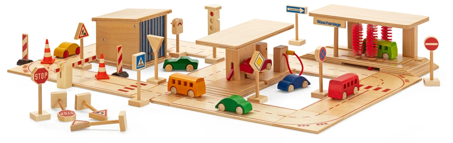 Für allzu rücksichtsvolles Fahrverhalten sind Kinder weniger bekannt, Spielzeugstraße und Holzauto, Ampel und Tankstelle müssen einiges an Widerstandsfähigkeit aufbieten können. Die besondere Robustheit seiner Holzspielzeuge ist ein zentrales Anliegen des am Rande der Schwäbischen Alb ansässigen Herstellers unserer Verkehrsspielstraßen-Sets. Verwendet werden ausschließlich hochwertige Hölzer, gefertigt wird mit hoher handwerklicher Sorgfalt und Qualität, produziert wird allein in Deutschland. Präzise Verarbeitung, sauberer Schliff, unbedenkliche Beizen und Lacke gehören zu den Standards des 1946 gegründeten, mittlerweile in dritter Generation geführten kleinen Familienunternehmens. So entstehen unter den Händen der versierten Mitarbeiter langlebige Holzspielzeuge mit dem Potenzial, von Generation zu Generation weitergegeben zu werden.