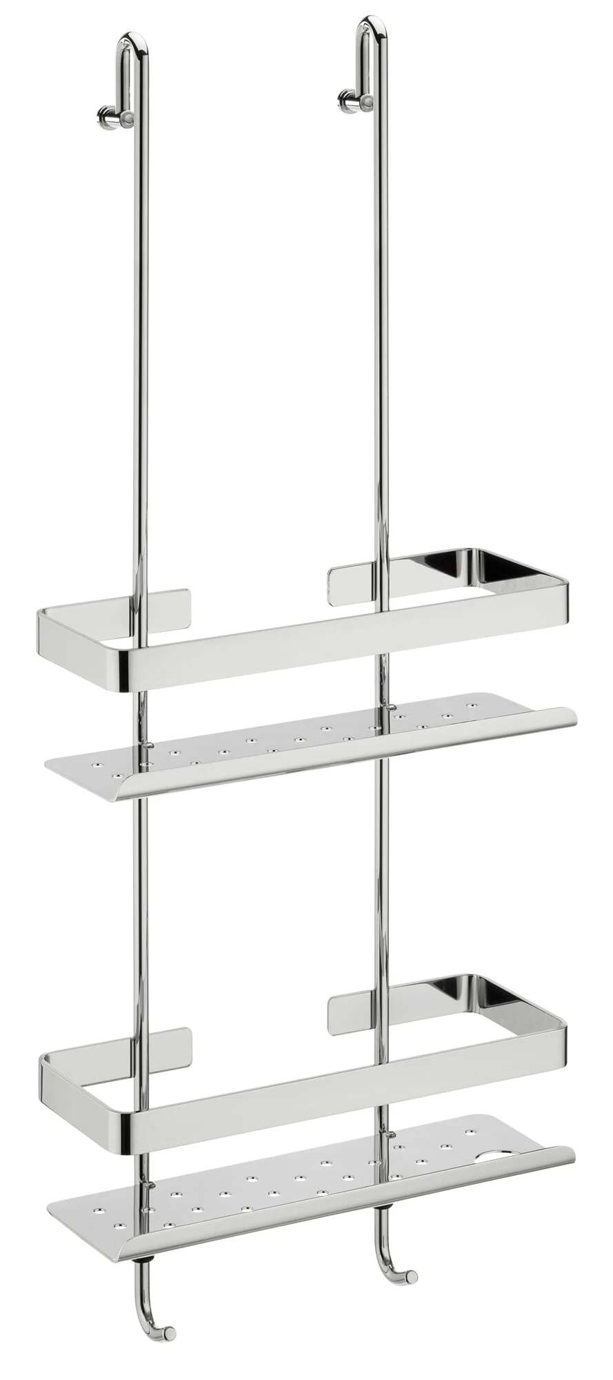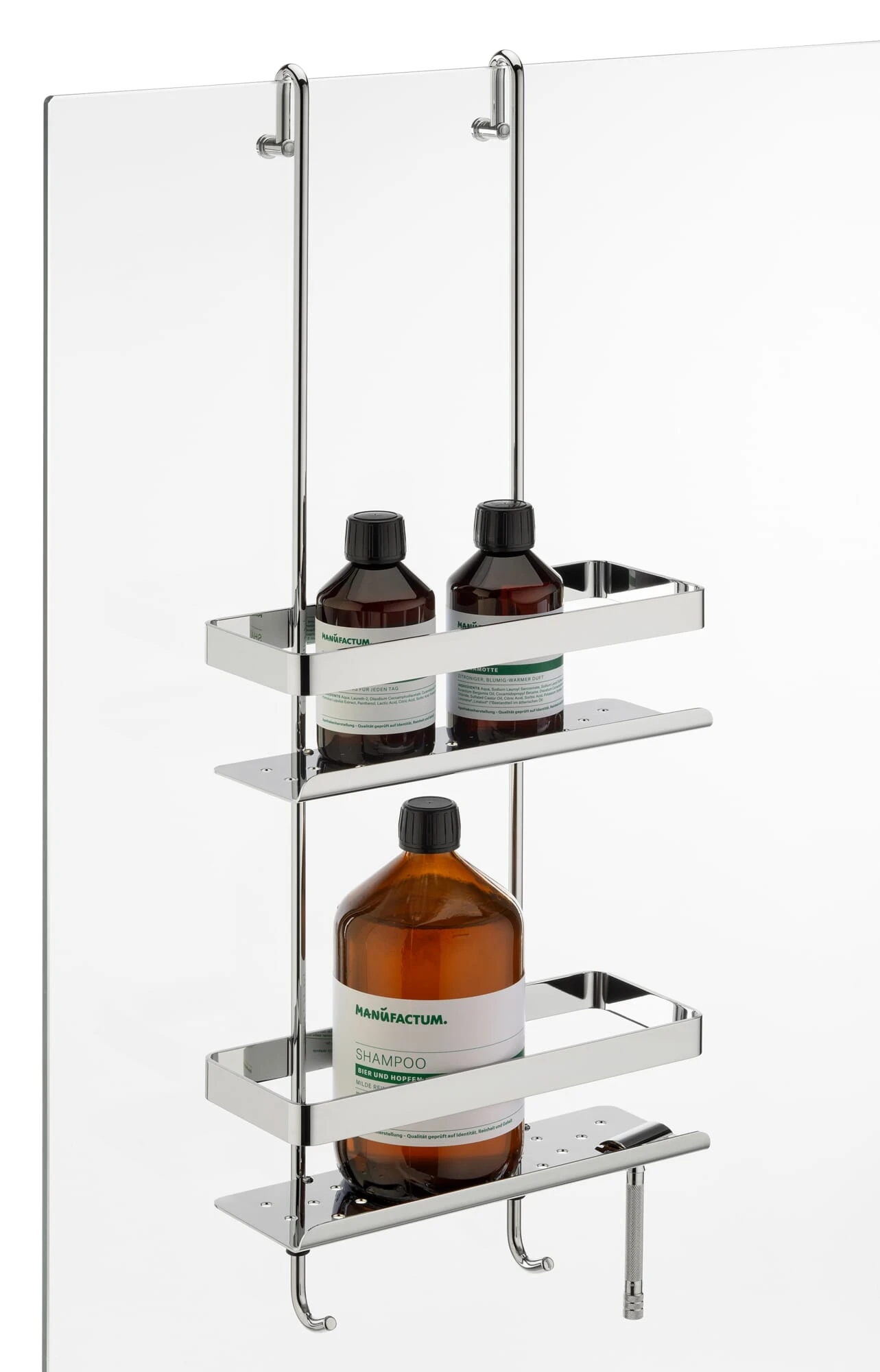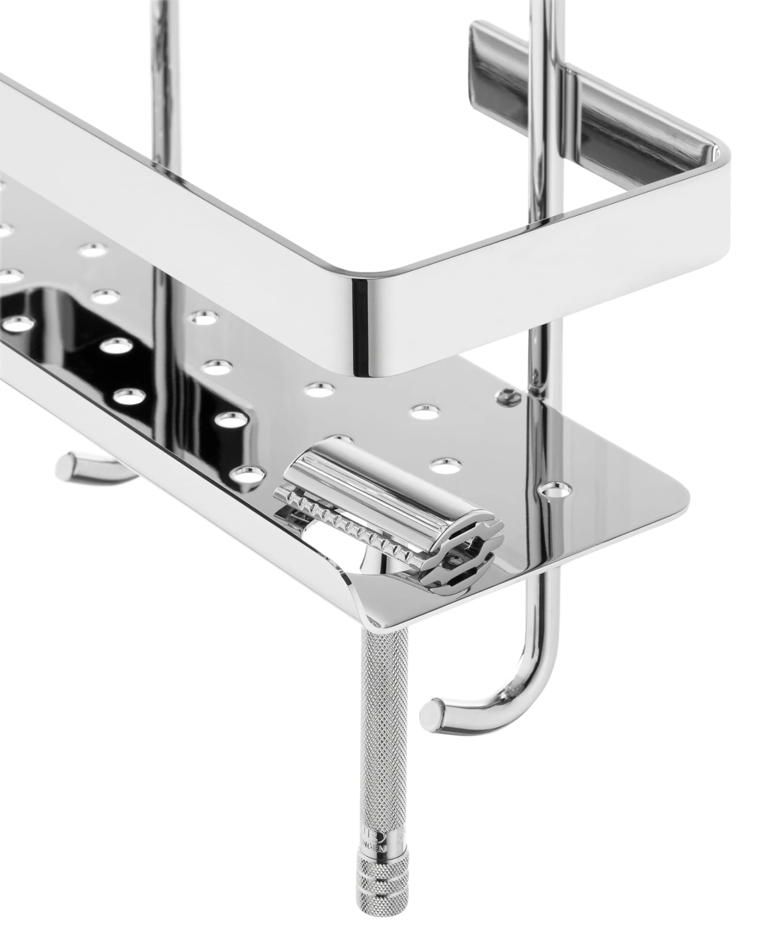 Die beiden Ablagen aus verchromtem Messing sind jeweils mit Abflusslöchern (Ø 5 mm) versehen und – überaus praktisch – einem größeren Loch von 2,8 cm Durchmesser, in das ein Rasierer eingehängt werden kann. Eine breite, umlaufende „Reling“ und die vorn hochgebogene Kante der Ablage halten Pflegeprodukte & Co. an Ort und Stelle. Zwei Haken an der unteren Etage nehmen zudem Waschlappen, Sisalsäckchen und Badeschwamm oder den Abzieher für die Glaswand auf. Eine passende Duschablage (zum Bohren oder Kleben) finden Sie ebenfalls bei uns im Sortiment.