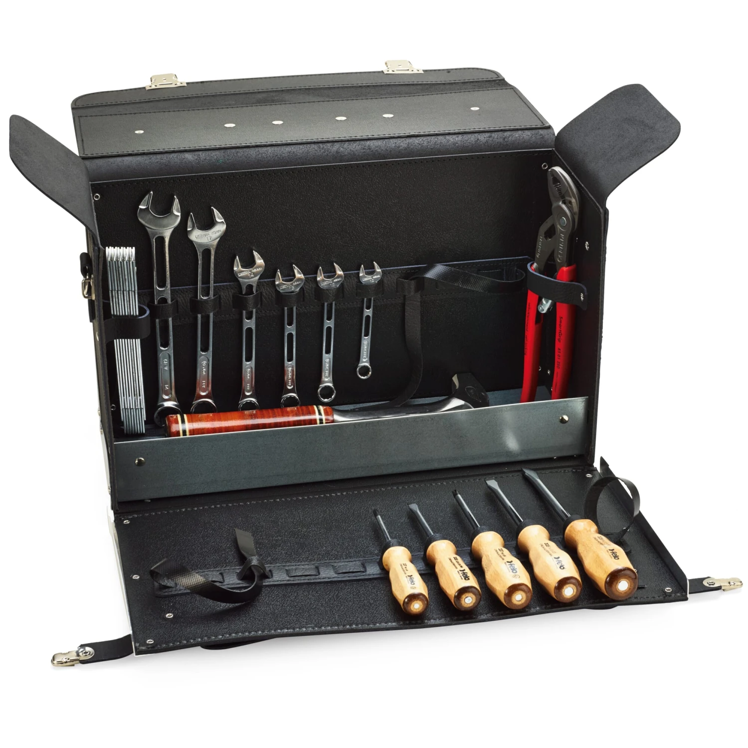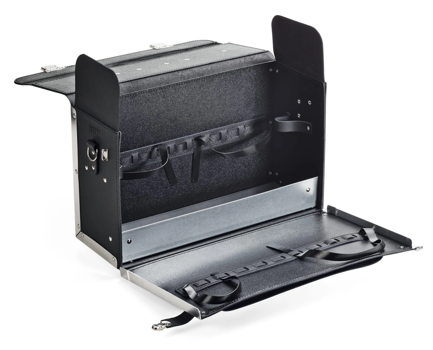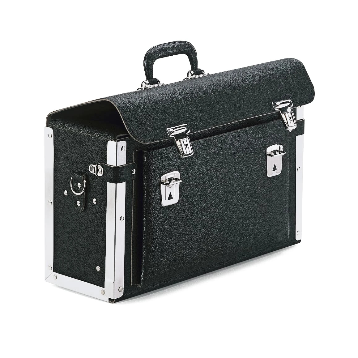 Die umlaufende Aluminiumkante schützt das innen teilweise mit Hartpappe verstärkte Rindspaltleder dieses robusten, seit 1938 im Thüringer Wald gefertigten Werkzeugkoffers auch bei hartem Einsatz. Die gesamte Konstruktion ruht auf einer Bodenwanne aus verzinktem Stahlblech. Ein innen an den Längsseiten entlanggeführtes Band nimmt Werkzeuge auf, Anleitungen lassen sich in der Vortasche aufbewahren.