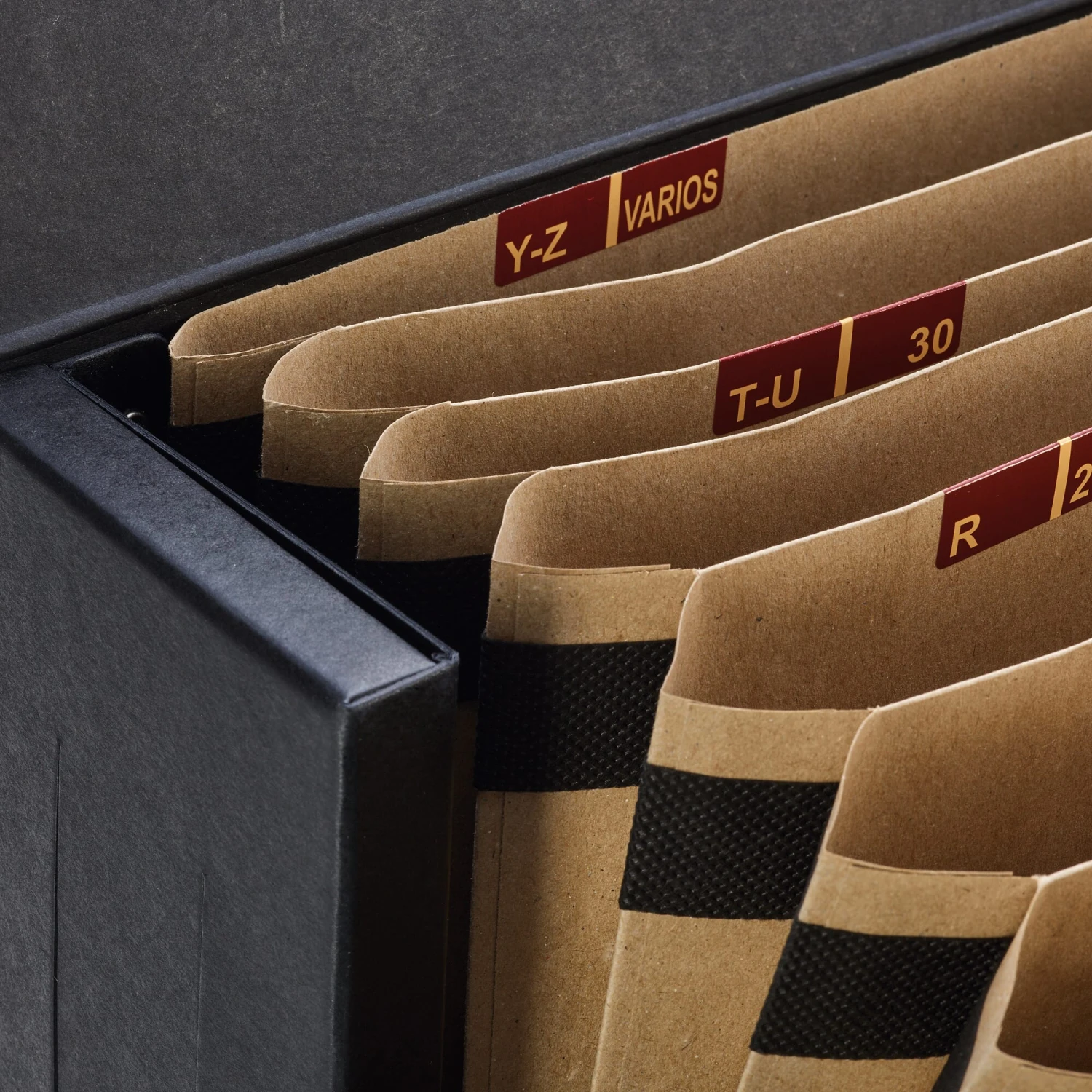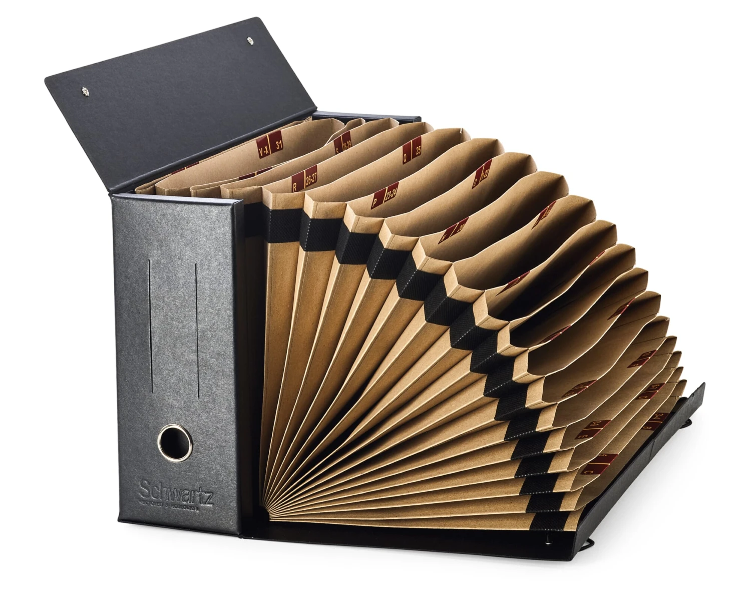 Er verbindet die Funktionen eines Pultordners mit denen einer Archivbox – damit ist der Fächerordner eine auch mobil nutzbare Ablage, die sowohl im Regal als auch auf Reisen ihren Zweck erfüllt. Mit seinen 20 Fächern, die zum Viertelkreis aufgefächert werden können, bietet er ausreichend unterteilten Raum, um sämtliche relevanten Unterlagen einer Kleinfamilie zu bergen; insofern ist er auch als sogenannte Notfallmappe von (hoffentlich nur hypothetischem) Nutzen.