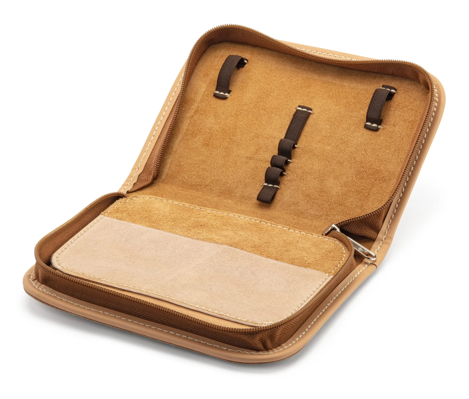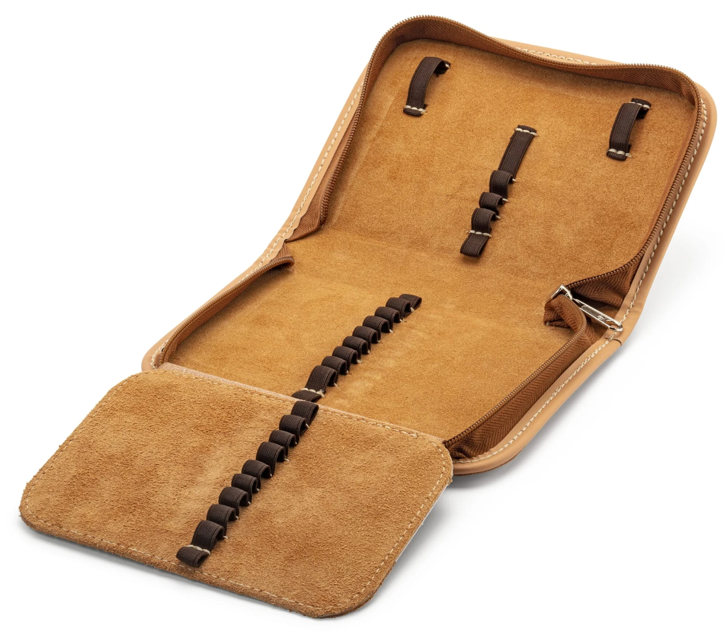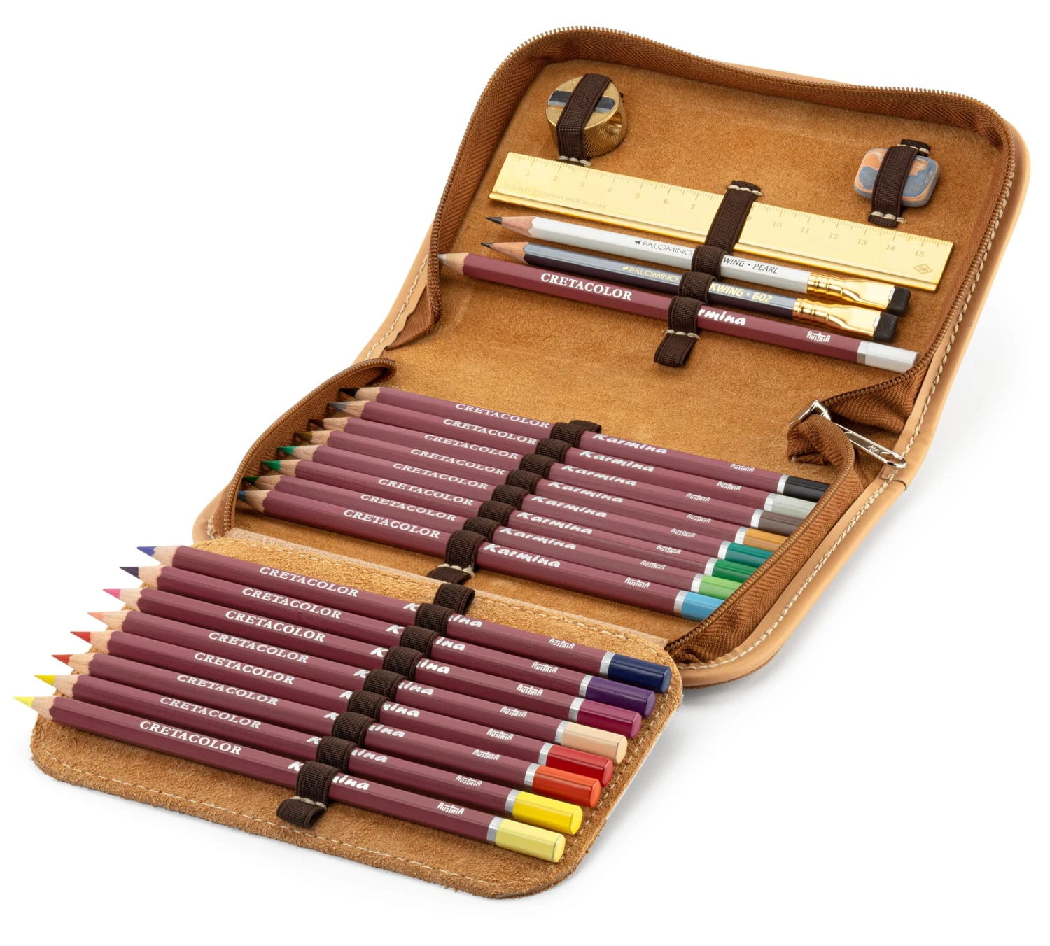 Ein Schreibetui, das über Jahre hinweg die Utensilien eines Schülerlebens sicher verwahrt. Das vegetabil gegerbte Rindleder vermittelt eine geschmeidig-samtige Haptik, zugleich ist es dermaßen kräftig, dass ihm die teils energischen Umgangsformen eines trubeligen Schulalltags nichts ausmachen, und die mit Leder gekederten Kanten nehmen selbst einen weniger zielsicheren Wurf zurück in die Schultasche langmütig hin. Solide Stiftschlaufen halten dauerhaft die erforderlichen Schreibgeräte sowie Anspitzer, Lineal und Radiergummi vor, das ausklappbare Stundenplanfach sorgt für einen schnellen Überblick.