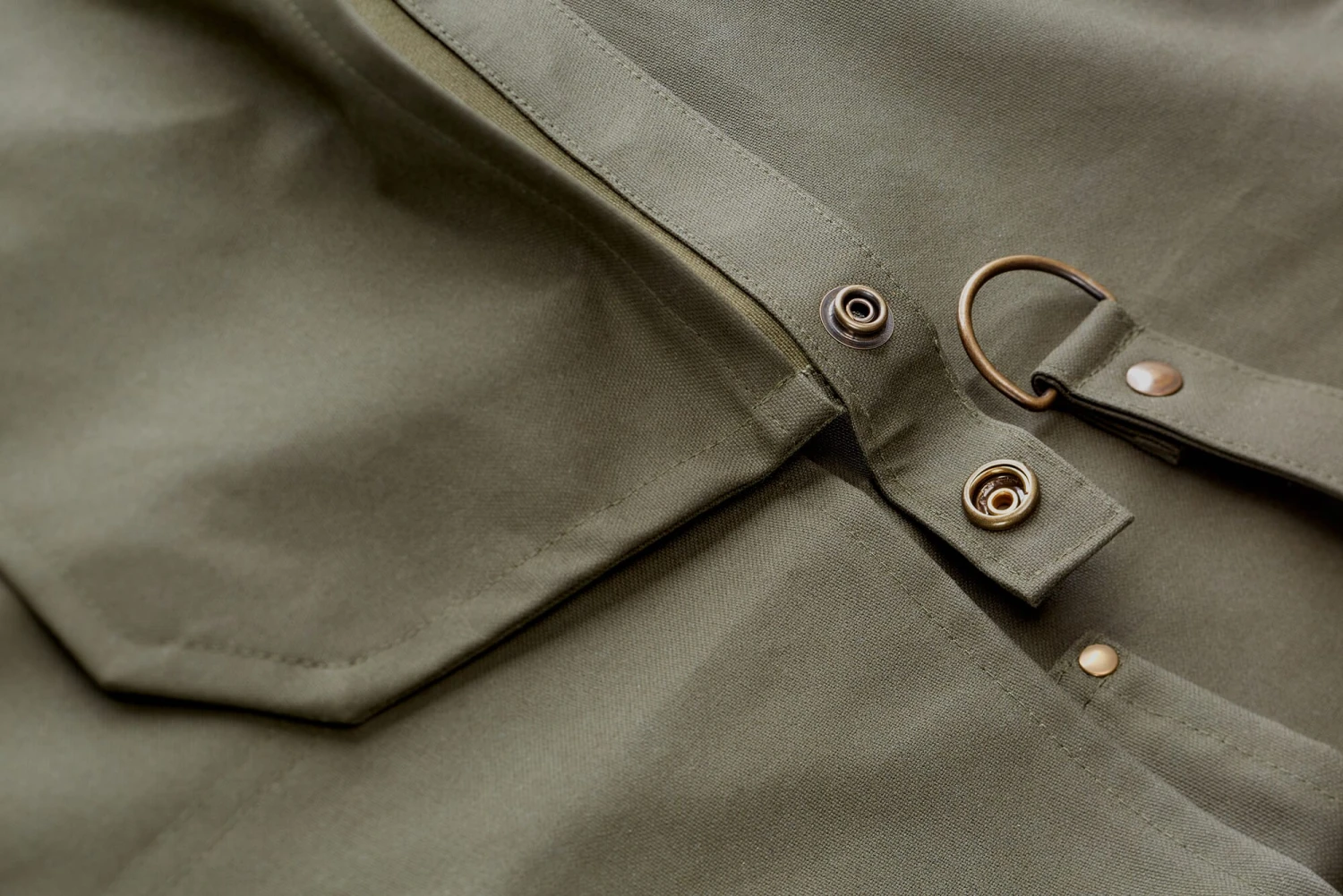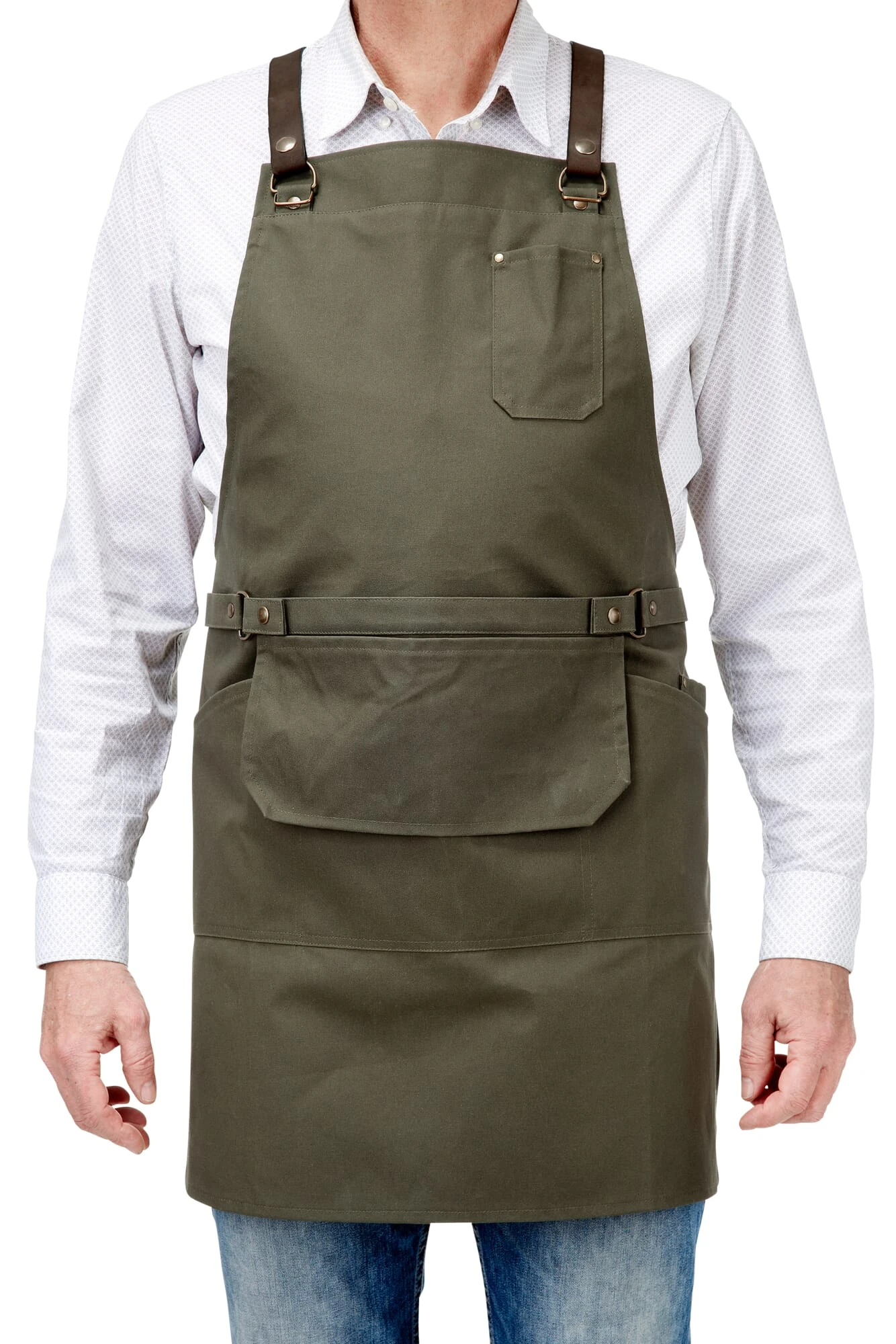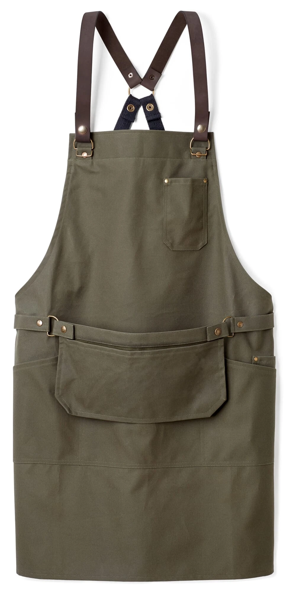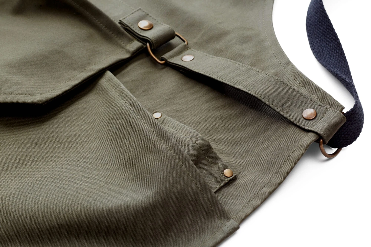 Hineinschlüpfen, Schleife binden – passt! Aus zwei Gründen wollen wir keine andere Gartenschürze mehr als diese. Grund Nummer eins: die Anordnung ihrer beiden sehr geschmeidigen Schulterträger. Aus vegetabil gegerbtem, griffigem Rindleder gemacht, finden sie sich im Rücken zu einem (beweglichen) Kreuz zusammen und sind an dieser Stelle mit Bindebändern aus gewebter Baumwolle verbunden. Diese Bindebänder wiederum werden nun zusätzlich durch je eine seitlich im Schürzenstoff fixierte Öse geführt. Stellen Sie sich es vor wie eine Art Geschirr, das Sie sich einfach überstreifen – und mit einem Zug an den Bindebändern passt sich die Schürze Ihrem Körper an. Kein Zuppeln und Zurechtschieben des Latzes am Oberkörper, kein Ziehen an der unteren Schürze. Passt, wackelt und hat Luft, sagte man früher dazu. Und Grund Nummer zwei? Der gewachste Baumwollstoff, den die Berliner Erfinderinnen dieser exzellenten Gärtnerschürze aus England beziehen. Wenn nicht dort, wo sonst kennt man sich mit gewachster Baumwolle aus? Das Material ist schmutz- und feuchtigkeitsabweisend (jedenfalls bis zu einem gewissen Grad) und daher ideal, um erdverbundene Gartenarbeit zu erledigen. In den zahlreichen Taschen – deren größte sich sogar abknöpfen lässt – bringen Sie Blumenschere, Bindeband, Gärtnermesser & Co. unter und haben so das Wichtigste stets zur Hand.