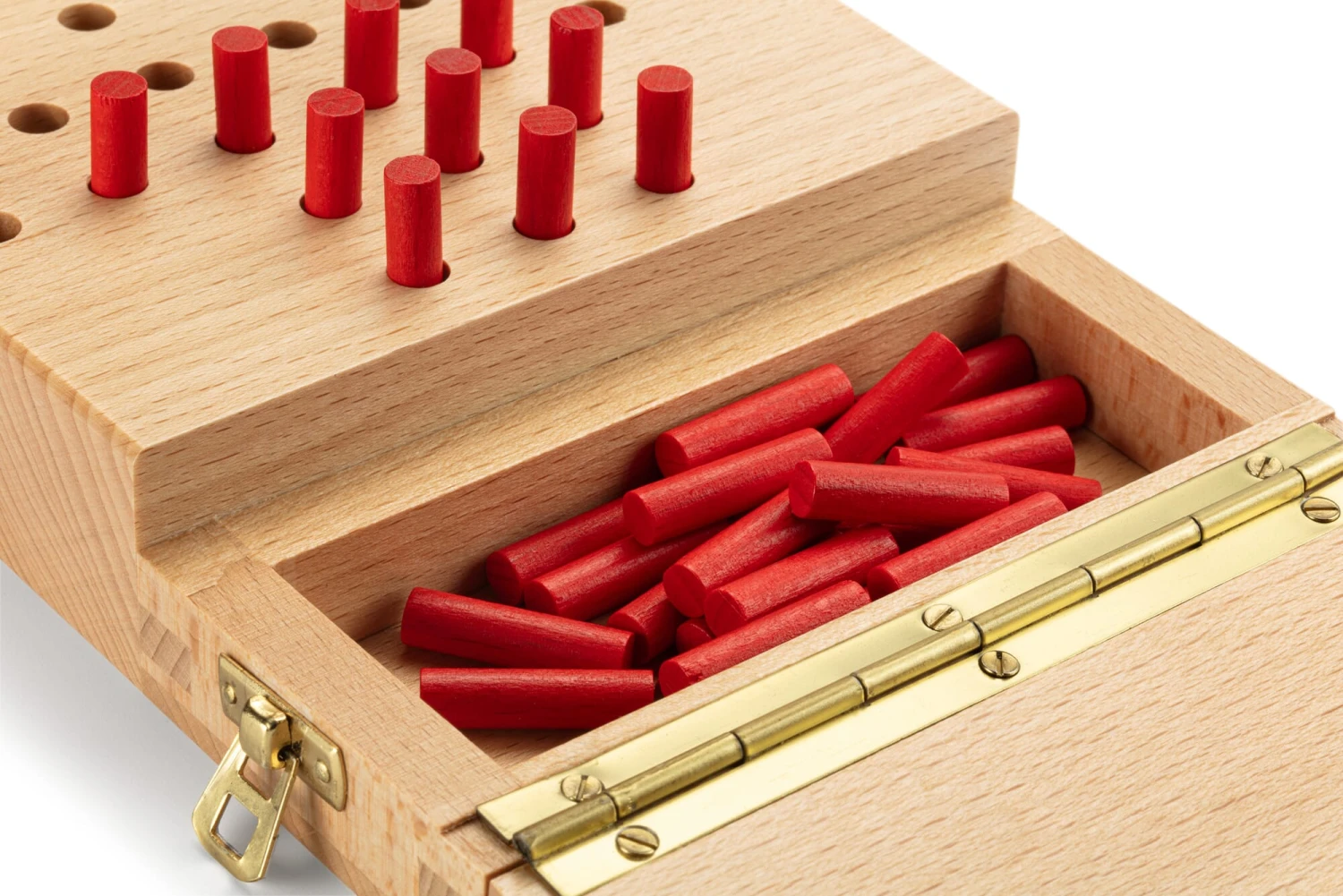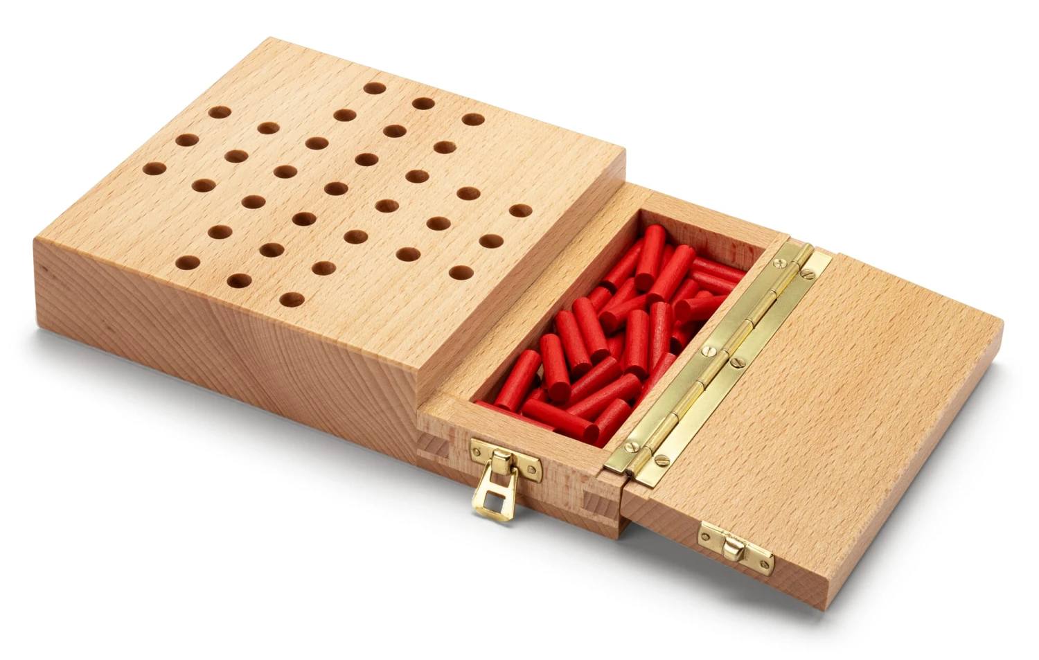 Diese Spielausführung nimmt es ohnehin nicht krumm, wenn mehrere Personen mitdenken, zugreifen und Züge ausprobieren: Spielfeld und Stäbchen sind aus massivem Buchenholz gefertigt, damit ist das Spiel definitiv solider als mancher Geduldsfaden. Neben der klassischen englischen Startaufstellung von 32 Stäbchen mit dem freien Feld in der Mitte gibt es verschiedenste weitere Aufstellungsvarianten, die auf unterschiedliche Ergebnisse zielen können. Auch wenn Sie den Lösungsweg der Standardaufstellung gefunden haben (und ihn im Schlaf herbeten könnten), stehen Ihnen also unzählige weitere Spielmöglichkeiten offen, anhand derer Sie Ihre kleinen grauen Zellen trainieren können. Der Philosoph und Mathematiker Gottfried Wilhelm Leibniz war übrigens ebenfalls begeistert vom Solitärspiel und erfand sogar eine eigene Spielweise, in der er nicht die Stäbchen, sondern die Löcher „springen“ ließ. Sollten auch Sie schließlich vom Solitär-Fieber erfasst worden sein, so begleitet Sie diese handliche, robuste Ausführung, die die Stäbchen in einem integrierten, verschließbaren Fach verstaut, geduldig auf all Ihren Wegen.