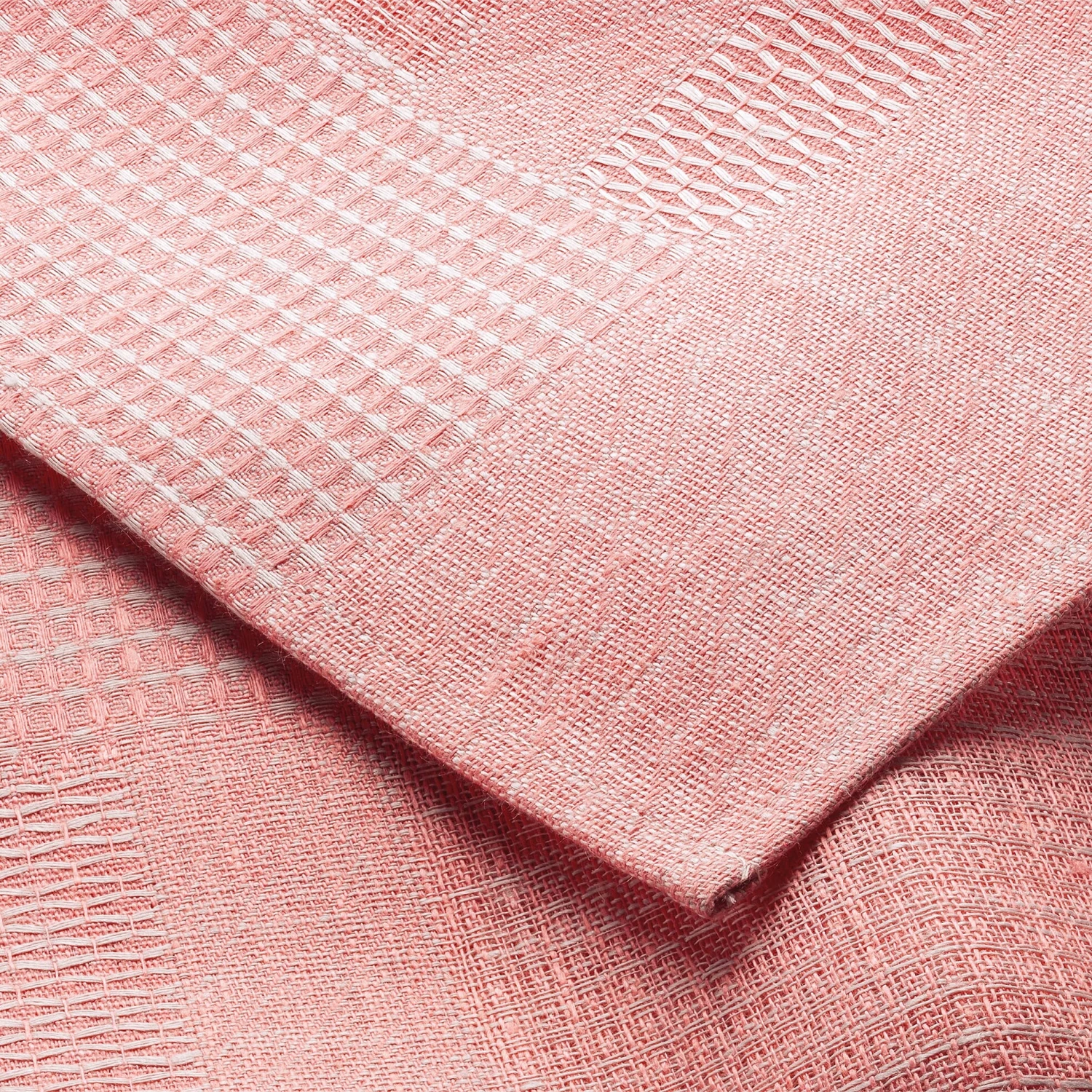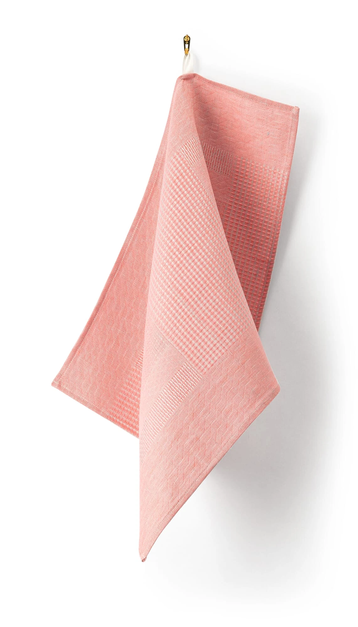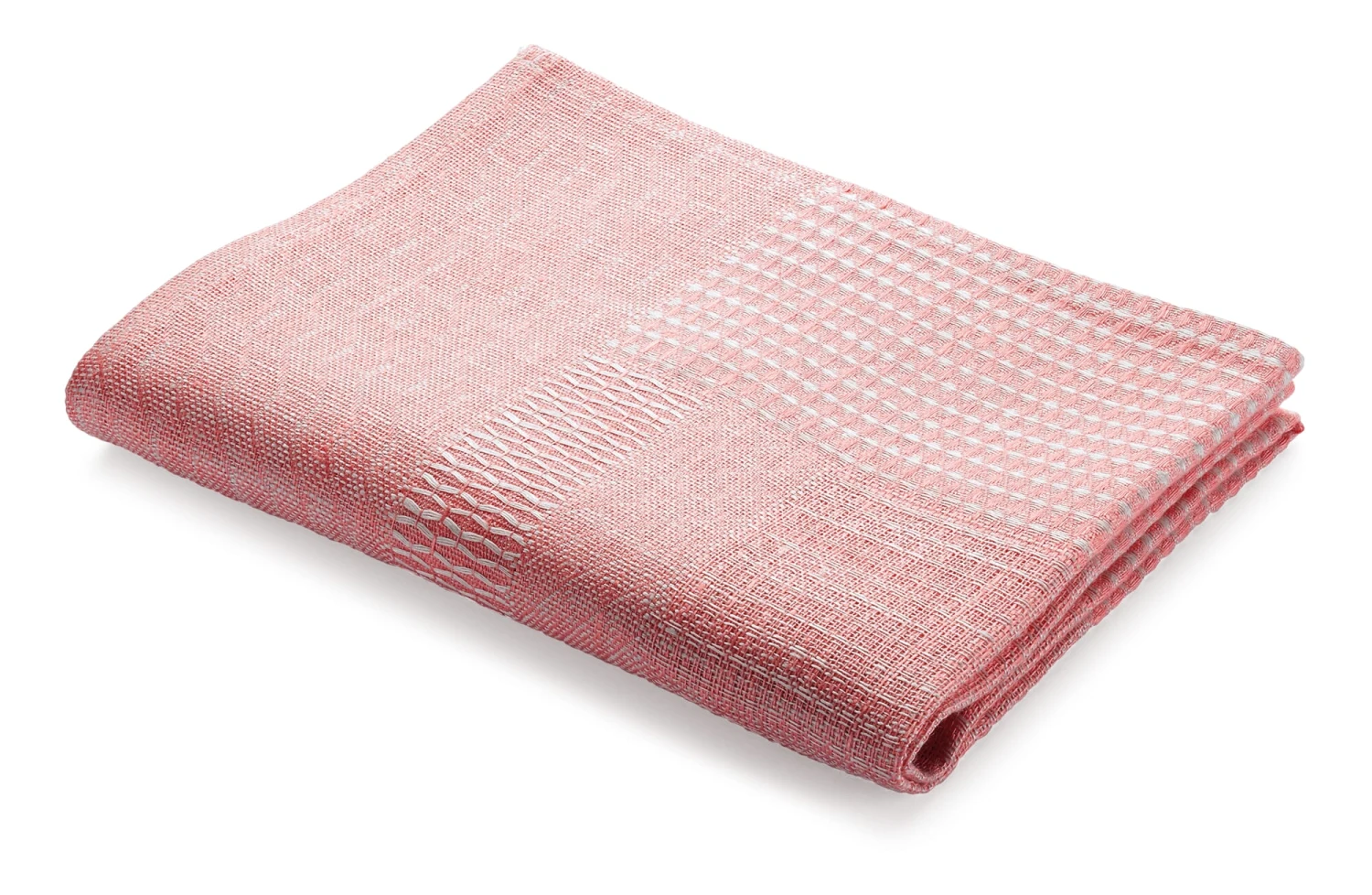 Dieses Geschirrtuch aus kräftigem, saugfähigem Leinen zeigt verschiedene Webtechniken und erhält dadurch eine besondere Haptik und Optik, die sich nach dem Waschen noch deutlich verstärkt. Das Gewebe springt dabei insgesamt um etwa 5% ein, die verschiedenen Bindungen laufen dabei jedoch unterschiedlich ein: Das Waffelgewebe zum Beispiel erhält erst nach der ersten Wäsche seine plastische Struktur, das leinwandbindige Gewebe hingegen verändert sich kaum.