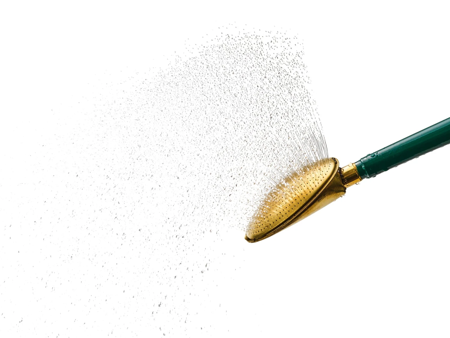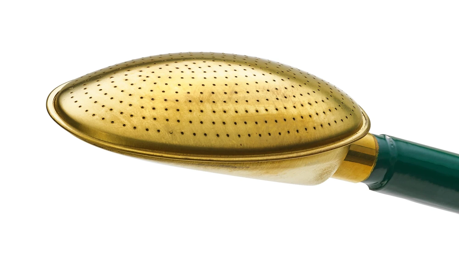 Dank ihrer speziellen Geometrie haben diese Kannen eine beeindruckende Balance und lassen sich leicht tragen. Beim Gießen verhindert der hohe Rand um die Öffnung ein Überlaufen. Aufgrund des langen Ausgusses kann die Gießtülle ohne Bücken dicht über den Boden gehalten werden, sodass die Wasserstrahlen aus den 360 (!) feinen Düsen der ovalen, aufsteckbaren Messingbrause reichlich, aber sanft herausströmen. Ein vor dem Auslauf befestigtes Sieb verhindert das Durchrutschen gröberer Wasserverunreinigungen und das Verstopfen der Tülle.