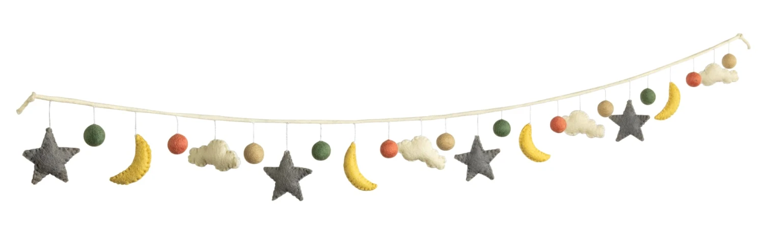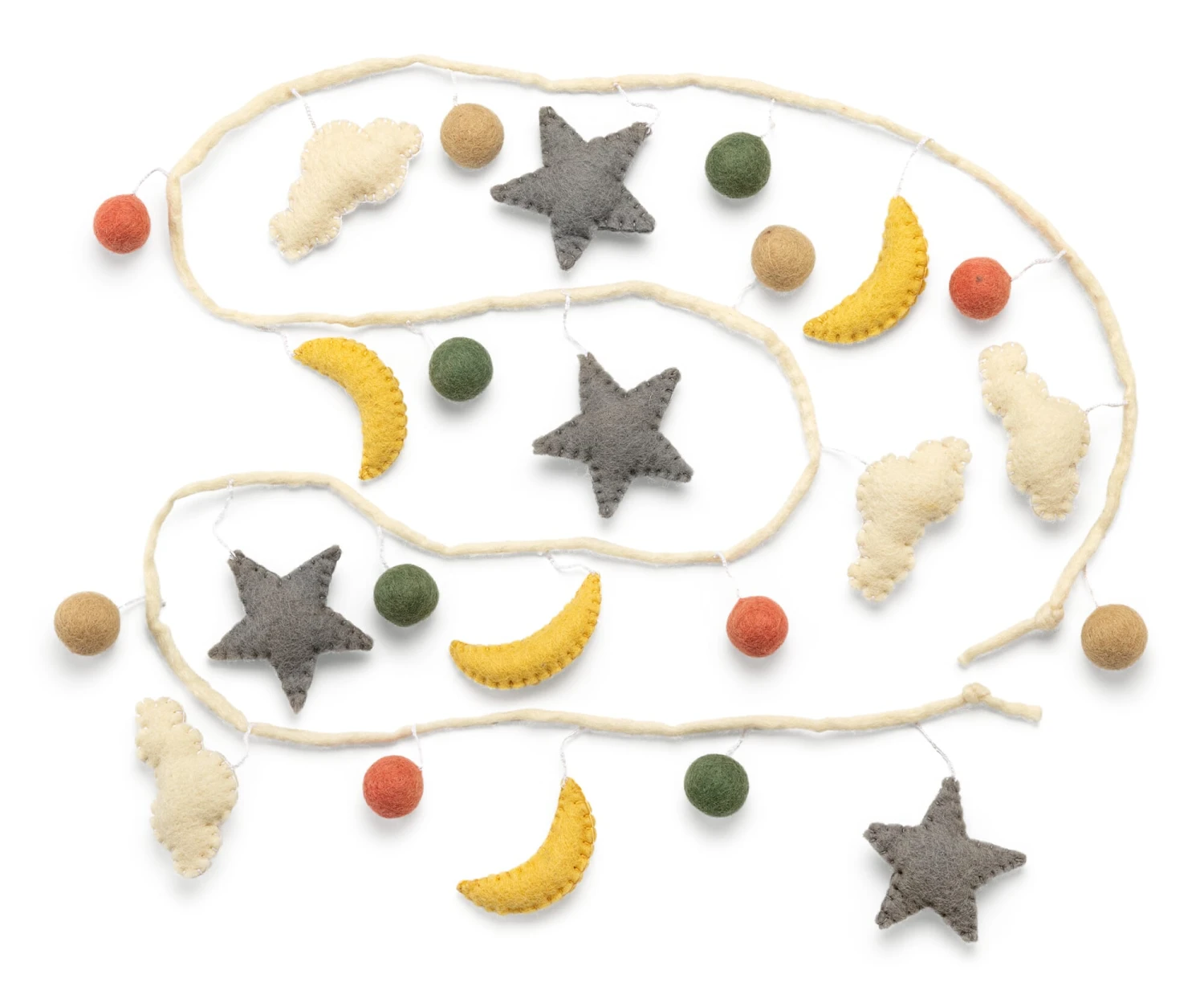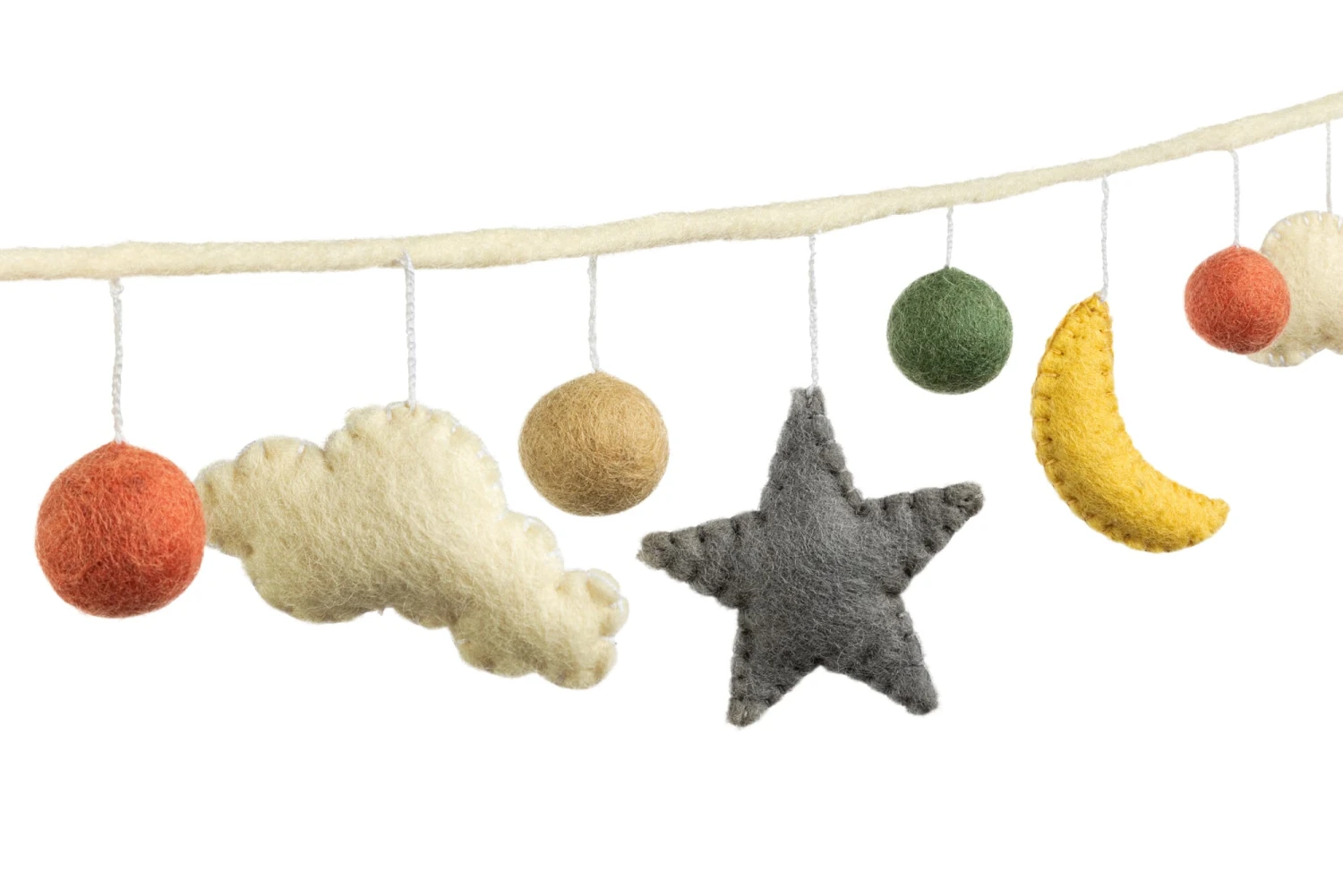 Über Wiege, Kinderbett oder Wickelkommode drapiert, erschafft diese bunte Girlande sogleich eine Atmosphäre der Geborgenheit, von märchenhafter Phantasie und dem Versprechen auf sanfte Träume erfüllt. Unweigerlich zieht der Himmel voller Mondsicheln, Sterne, Wolken und Planeten die Aufmerksamkeit Ihres Babys oder Kleinkindes auf sich – und fördert dabei ganz von selbst dessen kognitive und körperliche Entwicklung. Denn Ihr Nachwuchs lernt dabei, den Blick gezielt zu fixieren und Farben und Formen voneinander zu unterscheiden. Wenn das Kind dem faszinierenden (und natürlich außerhalb seiner Reichweite aufgehängten) Himmelsspiel dann auch noch entgegenstrampelt und danach greift, schult es zugleich seine motorischen Fähigkeiten. Dieses natürliche Training darf Ihr Sprössling gern über längere Zeit einlegen, denn auch der Girlande wurde eine lange Lebenserwartung in die Wiege gelegt: Sämtliche Elemente werden von Hand aus neuseeländischer Schurwolle gefilzt. Sterne, Mondsicheln und Wolken sind zudem mit der gleichen Wolle gefüllt und feinsäuberlich mit einem Baumwollgarn im Langettenstich umsäumt – so behalten sie dauerhaft ihre Form.