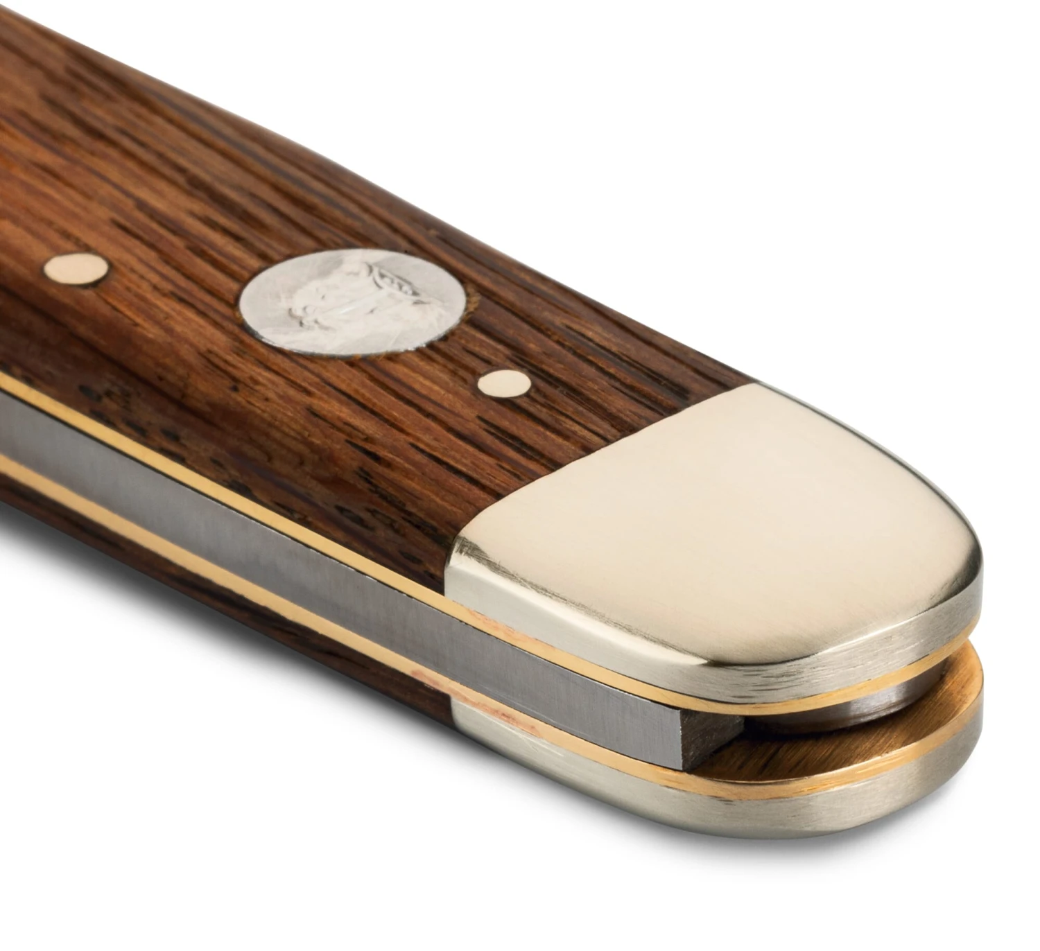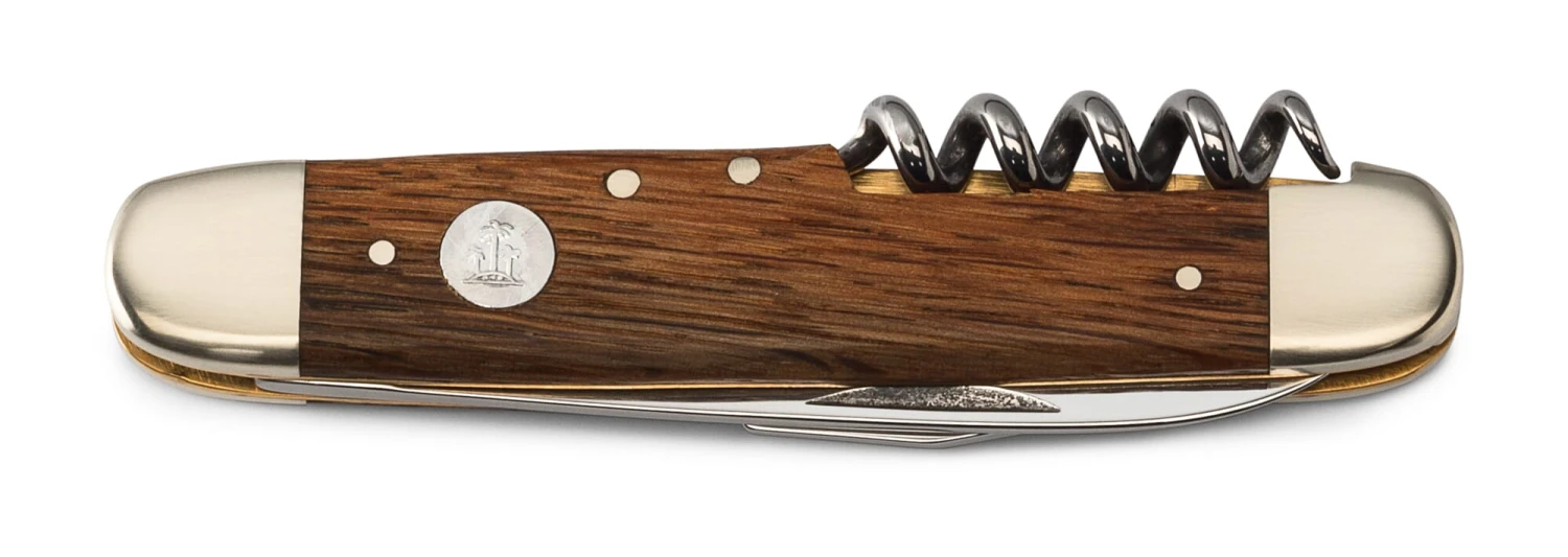 Das Herrenmesser birgt die gattungstypisch vorgesehenen Werkzeuge – eine geschmiedete und in Handarbeit gepließtete Edelstahlklinge, einen Korkenzieher aus gehärtetem Stahl, einen Kapselheber und einen (Schlitz-) Schraubendreher. Jedes Taschenmesser wird einzeln von Hand ausgemacht und qualitätskontrolliert. Die Heftschalen werden aus dem Holz gebrauchter Eichenfässer gefertigt. Je nachdem, welche Seite des Materials zu sehen ist – die vom Wein gefärbte Innenseite oder die angewitterte äußere –, fallen Ton und Maserung unterschiedlich aus. Kein Messer gleicht dem anderen.