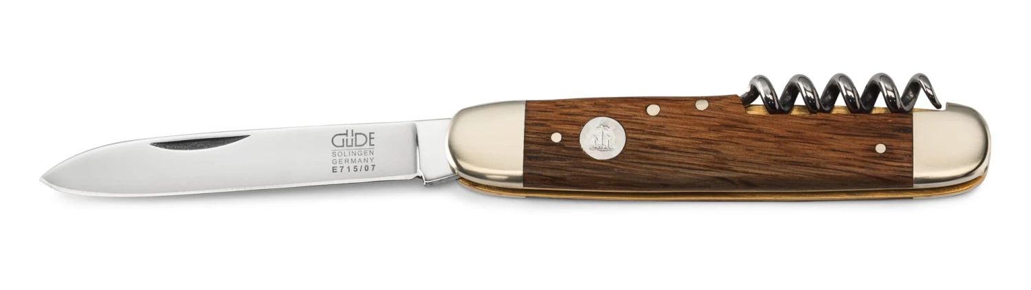 Bei Franz Güde in Solingen entstehen sonst geschmiedete Küchenmesser. Für dieses Herrenmesser genannte Taschenmesser hat man sich dort mit einem benachbarten Betrieb zusammengetan, dessen Spezialität Taschenmesser seit Generationen sind. Die Vorlage für dieses stammt von 1914.