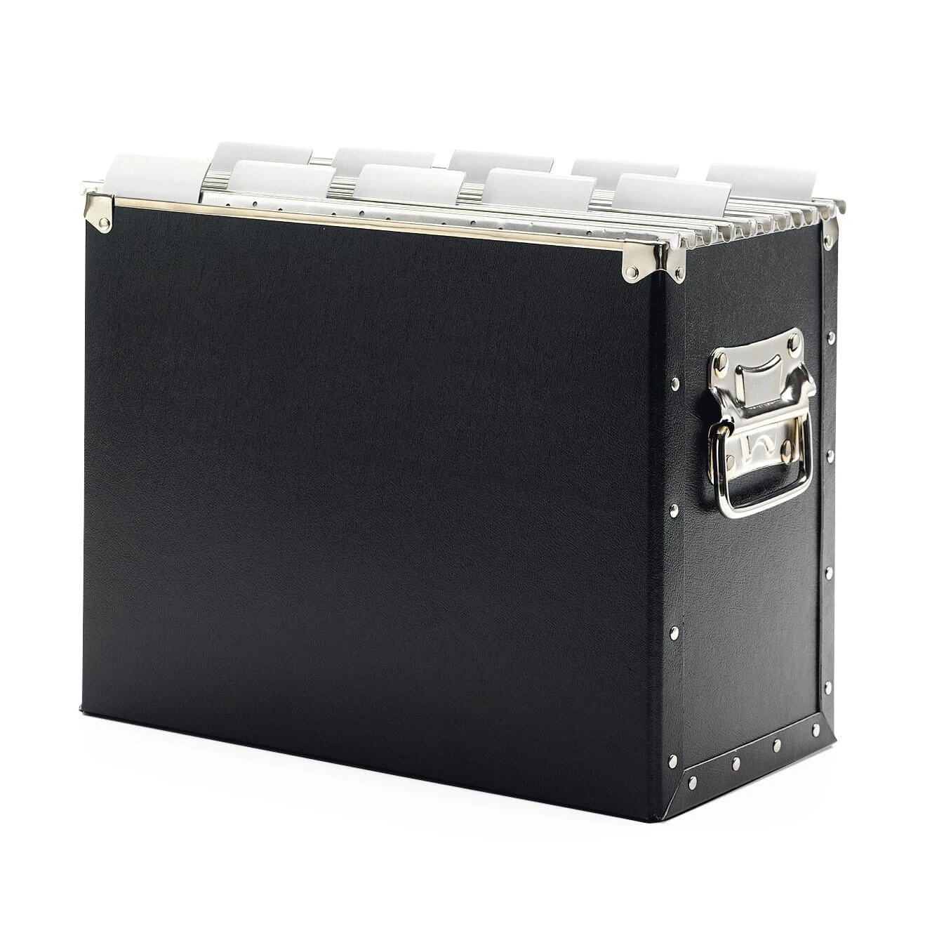 Aus dem gleichen „Holz“ wie unsere preisgünstigen, aber überaus robusten Koffer ist diese Hängemappenbox geschnitzt, aus Pappe nämlich: 1,3 mm stark, schwarz durchgefärbt und matt lackiert. Zur Stabilisierung sind die offenen Kanten einfach, die Ecken zweifach stahlblechverstärkt. Die Box nimmt bis zu 15 Hängeregistraturmappen auf – etwa die normalen Alpha-Mappen von Leitz und genauso gut unsere aus Manilakarton. Für den Transport und einfaches Handling ist die Hängemappenbox mit Kistengriffen aus vernickeltem Stahlblech versehen.