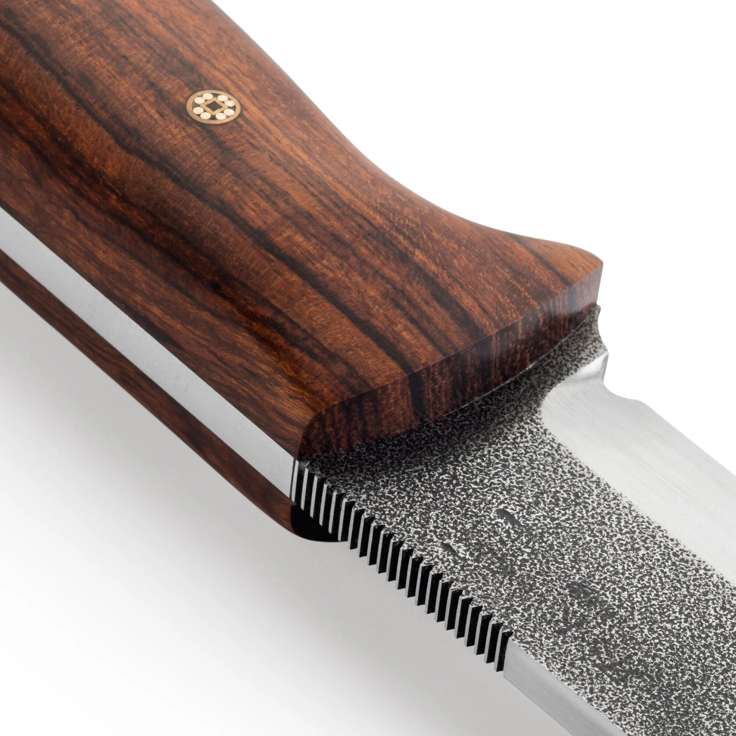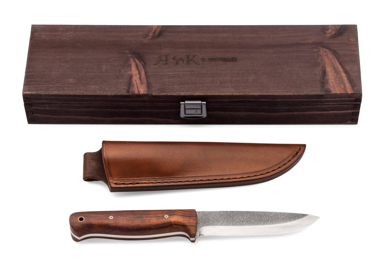 Der Aufbau besteht aus einem durchgehenden Klingenstück mit aufgesetzten und gegen seitliche Scherkräfte mit stabilen Nieten (aus Messing und Neusilber) gesicherten Griffbacken aus Wüsteneisenholz. Die Einsatzmöglichkeiten sind wirklich alltagstauglich: Das Messer muss etwas aushalten, daher wurde auf Stabilität geachtet. Mit 3,7 mm ist die Klinge nicht zu stark, durch ihren besonderen Skandischliff ist sie aber hart im Nehmen, und das bis in die Spitze. Die Klinge hat eine skandinavische Form und bleibt unter der in Deutschland gültigen Grenze von 12 cm, sie ist aber groß genug für die meisten Arbeiten vom Zurichten von Feuerholz bis zum Aufschneiden der Brotzeit. Der Klingenrücken ist scharfkantig ausgeführt und eignet sich deshalb bestens zum Feuermachen mit einem Zündstein. Ein geriffelter Bereich ermöglicht durch Auflage des Daumens ein festeres Schneiden, falls das einmal notwendig ist. Beim Walzen des Stahls hat sich eine Zunderschicht gebildet, die nicht entfernt, sondern nur sandgestrahlt und leicht abgeschliffen wurde. Im Bereich des Klingenschliffs wurde diese Oberfläche abgetragen, weshalb dort das blanke Material sichtbar wird. Der verwendete Stahl ist rostfrei, aber von beeindruckender Schärfe und Schnitthaltigkeit. Die auf exakte Passung gearbeitete Messerscheide besteht aus vegetabil gegerbtem Rindleder, das erst nach dem Zusammenbau eingefärbt und schließlich mit Lederfett behandelt wurde. Zum Schutz der Naht ist ein Lederstreifen mit eingearbeitet, an den die Klinge anstoßen kann, ohne die Naht zu erreichen.