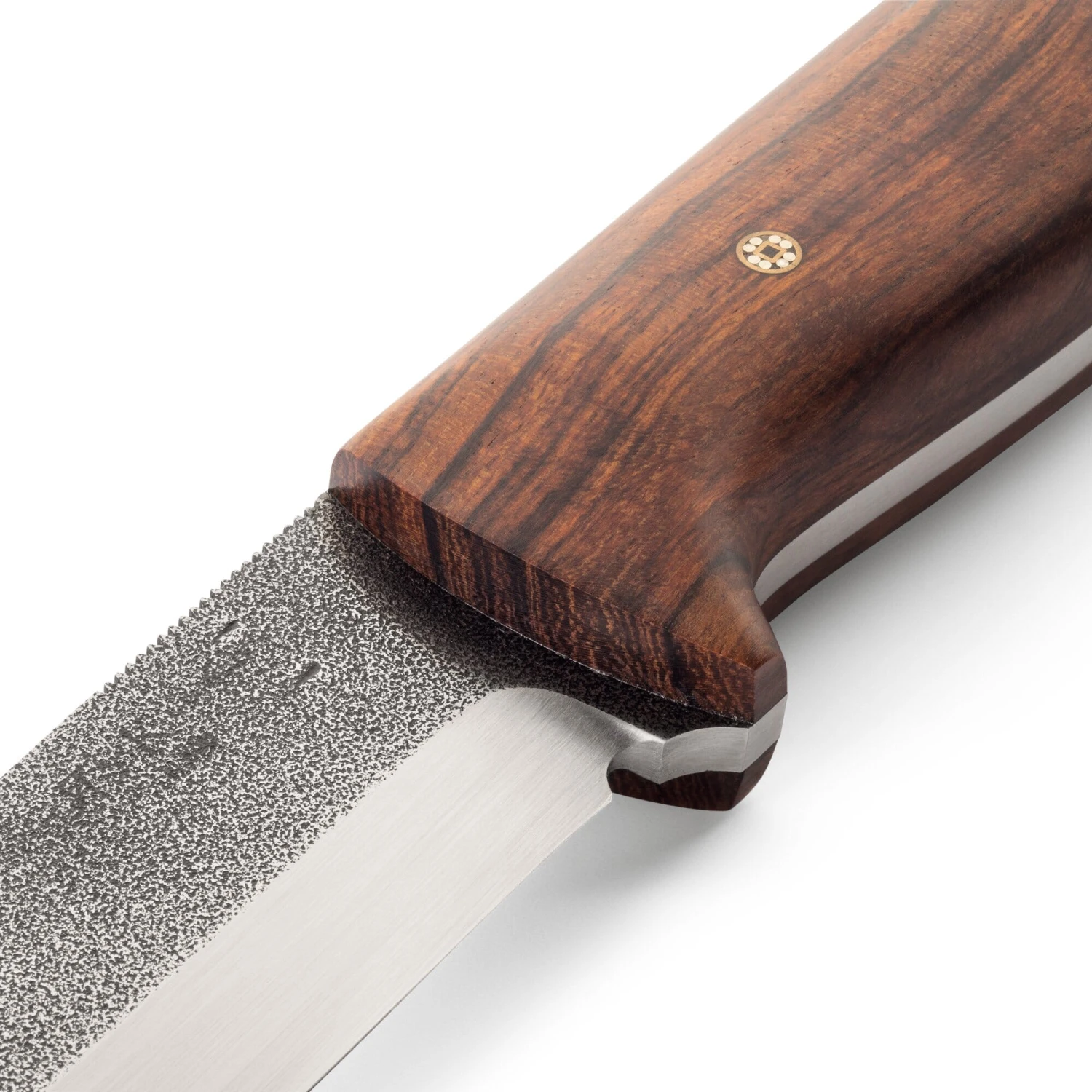 – Der Schliff geht nur über die halbe Klingenbreite, dadurch bleibt das Messer so robust, dass man zum Beispiel beim Holzspalten mit einem Klotz auf den Messerrücken schlagen kann;