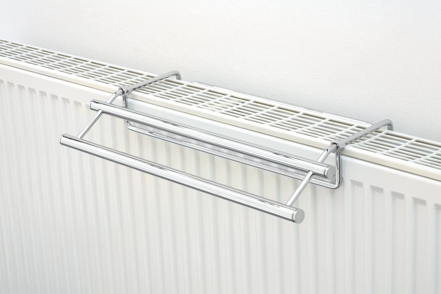 Über den Heizkörper im Badezimmer oder in der Küche gehängt, bietet dieses Gestell eine praktische Möglichkeit zum Aufhängen und Trocknen von Handtüchern (oder auch handgewaschenen Kleintextilien, Küchentüchern …). Mittels des stufenlos verstellbaren Bügels kann es Heizkörpern bis 11 cm Tiefe angepaßt werden.