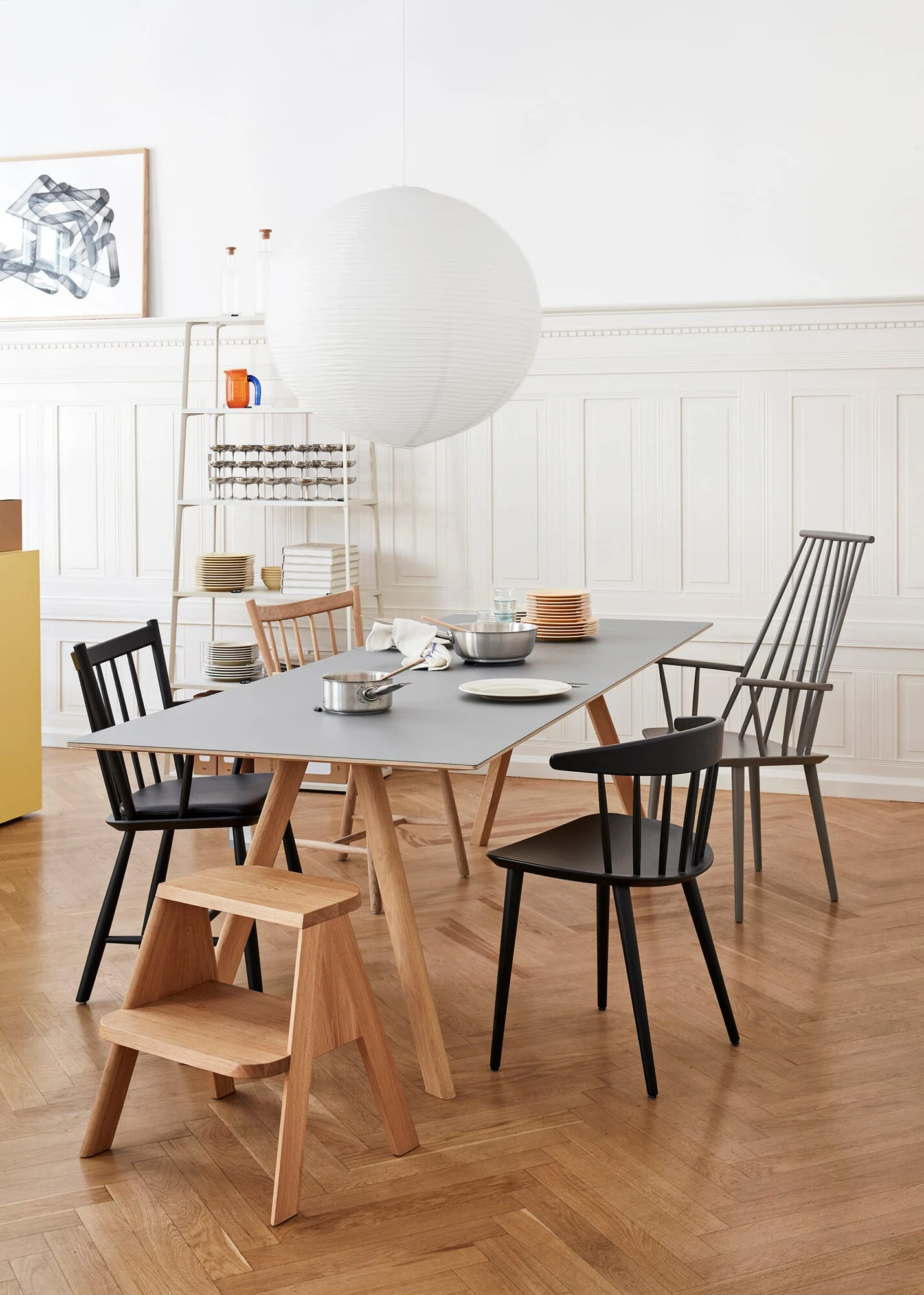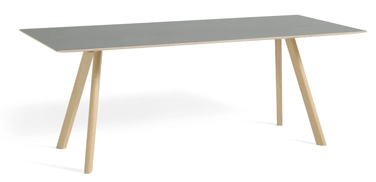 Ein großer Tisch, dessen in grauem Linoleum ausgeführte Tischplatte einen schönen Kontrast zum Eichenholz der übrigen Konstruktion schafft. In den MAGAZIN-Läden auch in anderen Formaten, einer runden Version sowie weiteren Farben lieferbar.