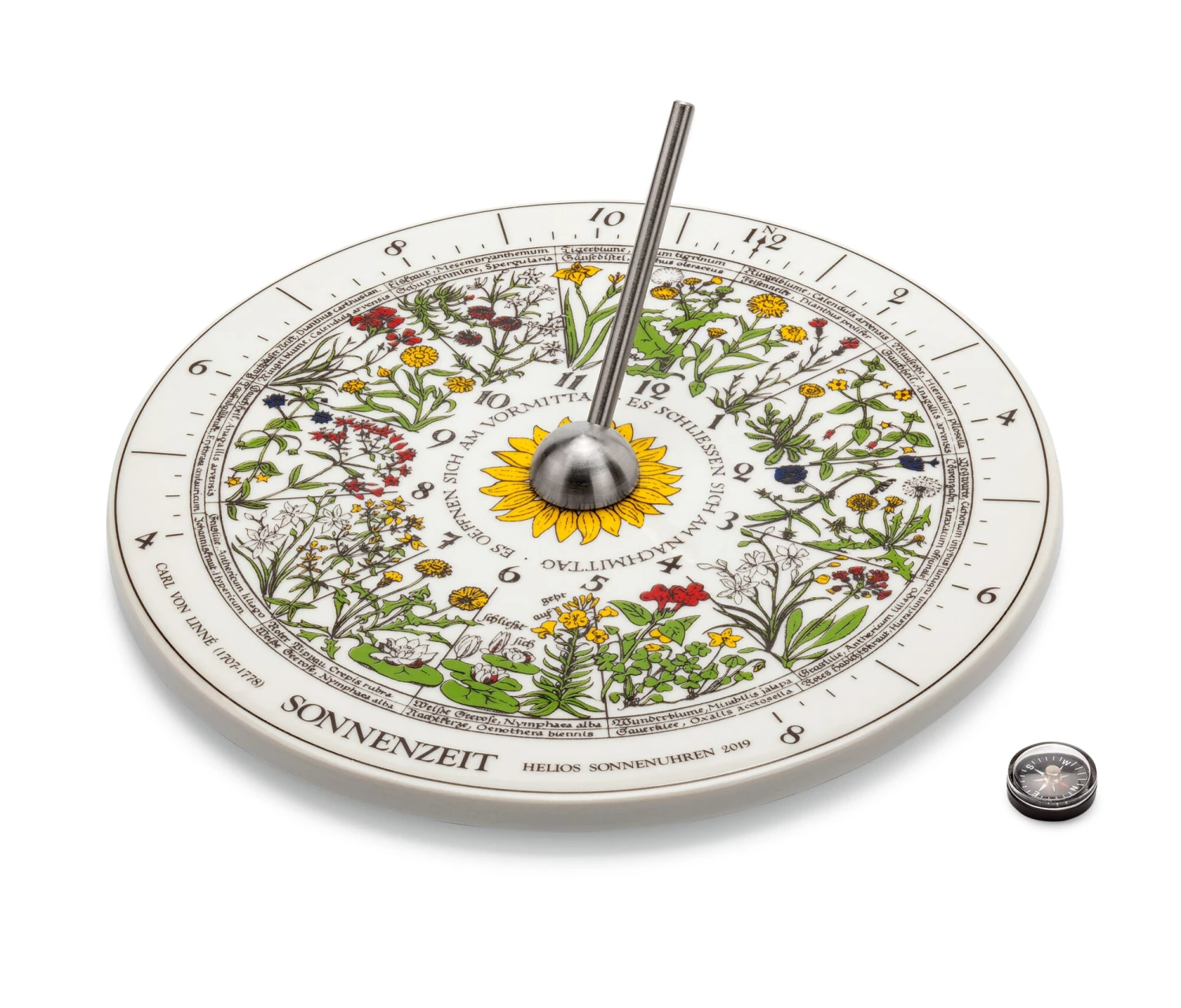 Der berühmte schwedische Naturforscher Carl von Linné war der erste, der dieses Phänomen genauer unter die Lupe nahm. Im botanischen Garten von Uppsala in Schweden ließ er 1745 eine Blumenuhr anlegen, und man sagt ihm bis heute nach, dass er die Uhrzeit mit ihrer Hilfe stets bis auf fünf Minuten genau ansagen konnte. Ähnlich präzise zeigt auch unsere Sonnenuhr mit historischem Blumenuhrmotiv die Zeit an. So wird die eine Naturuhr aufs Schönste mit der anderen vereint: Der Uhrenteller entsteht in Handarbeit aus weißem Porzellan, das mehrfarbige Dekor wird dabei im Siebdruckverfahren aufgebracht und später bei 800 °C im Brennofen in die Glasur eingebrannt. Das zentrale Element jeder Sonnenuhr ist der Schattenwerfer, der in diesem Fall ganz aus Edelstahl besteht.