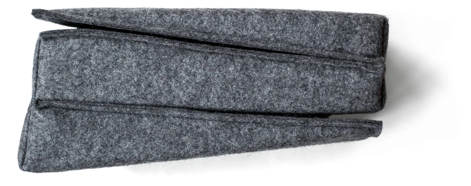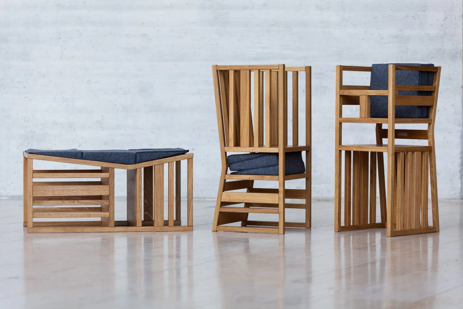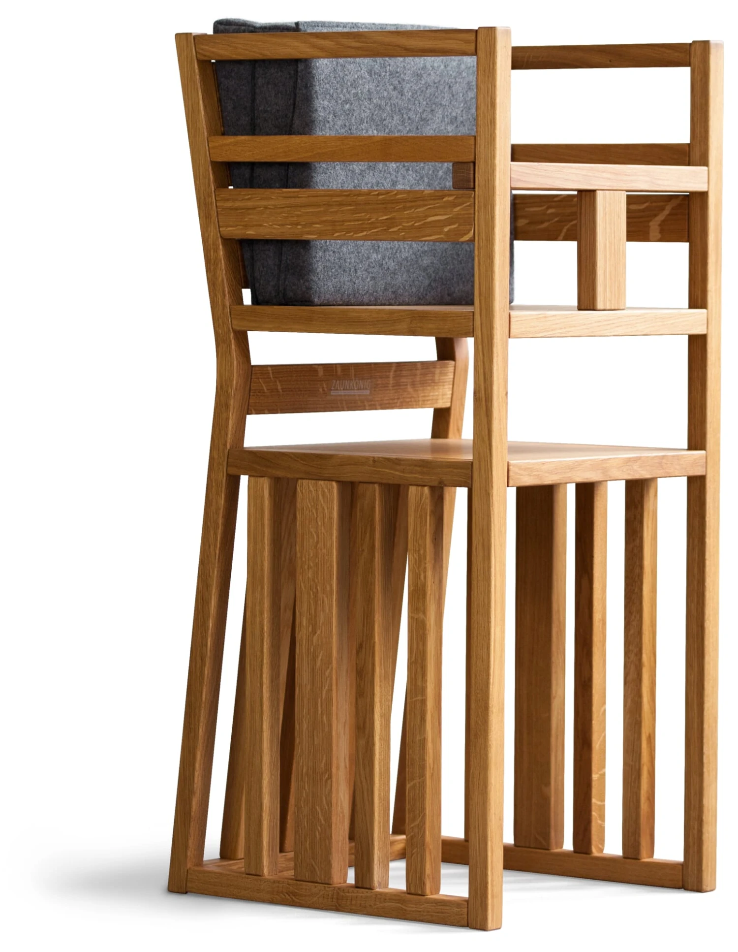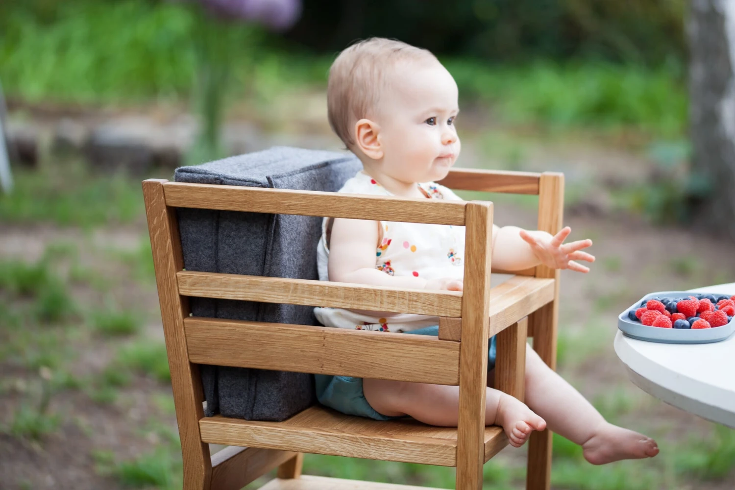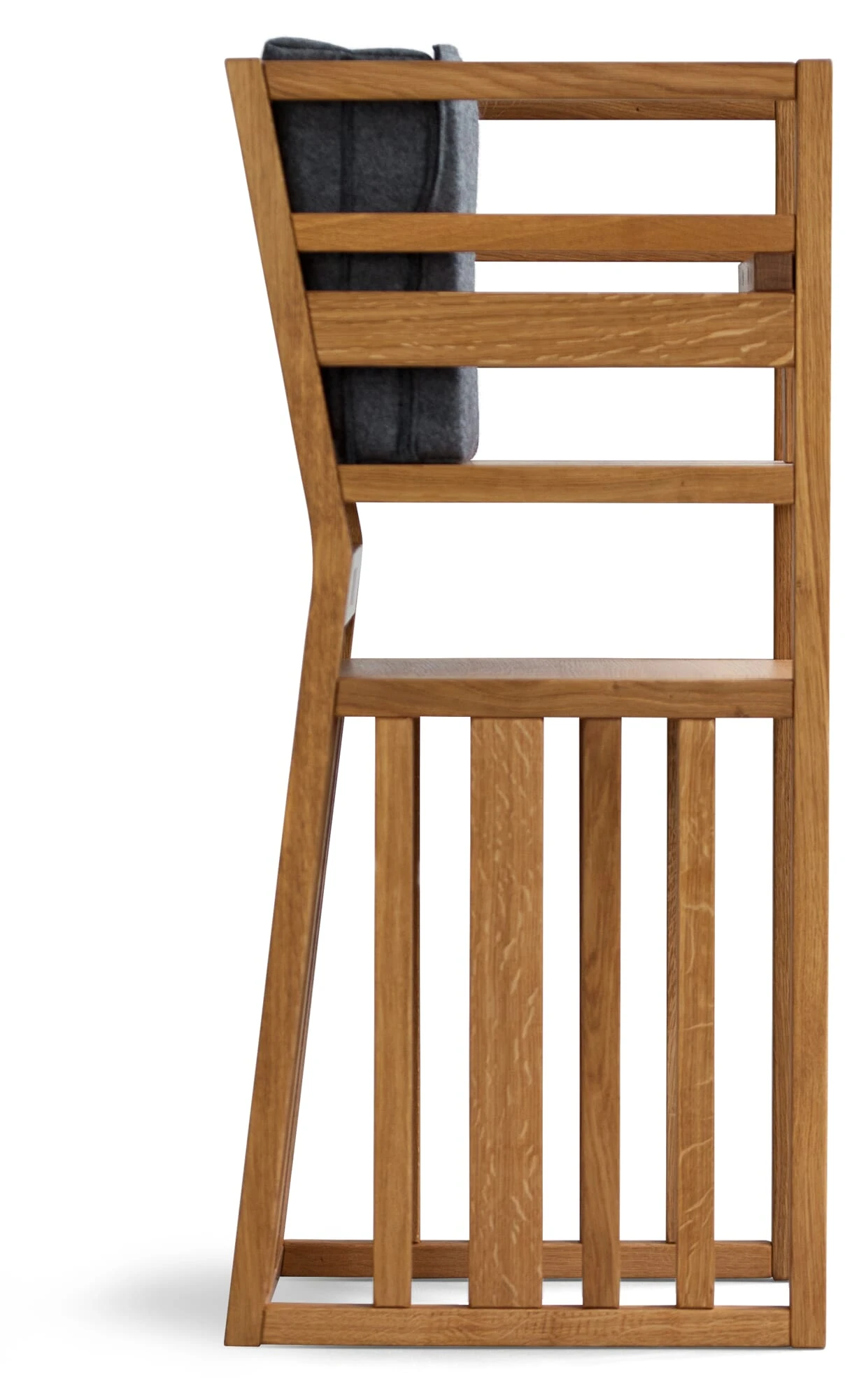 Die Verarbeitung des massiven, aus nachhaltiger Forstwirtschaft stammenden Eichenholzes lässt sich besser kaum wünschen. In einer kleinen erzgebirgischen Stuhlmanufaktur geschreinert, zeigt sich hier bis in die Holzverbindungen hinein hohe Handwerkskunst, die jeden einzelnen Hochstuhl zu einem soliden, stabilen Einzelstück formt. Sein puristisch klares Design, in dem jede Strebe und Leiste ihre Funktion erfüllt, erhebt den Hochstuhl zu einem ansehnlichen Blickfang der Raumgestaltung. Selbst die Rückenlehnen neigen sich nicht allein der optischen Wirkung willen leicht zurück, sondern optimieren die Statik zugunsten eines ausbalancierten, kippsicheren Standes. Schlicht und hochfunktional: Die dreifach verschraubte Sitzsicherung in T-Form kann je nach Bedarf zügig ein- und ausgebaut werden. Das aus Wollfilz gearbeitete Faltpolster dient als Rückenlehne in der Stuhlfunktion oder auch als komfortable Sitz- und Liegematte für die Bank – und wird es einmal nicht benötigt, findet es zwischen Sitz- und Standfläche seinen passenden Stauraum.