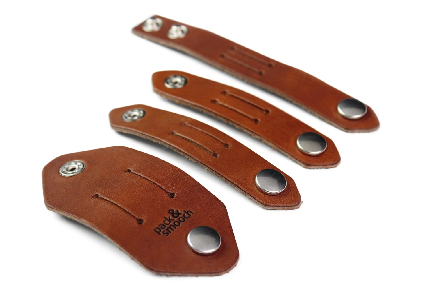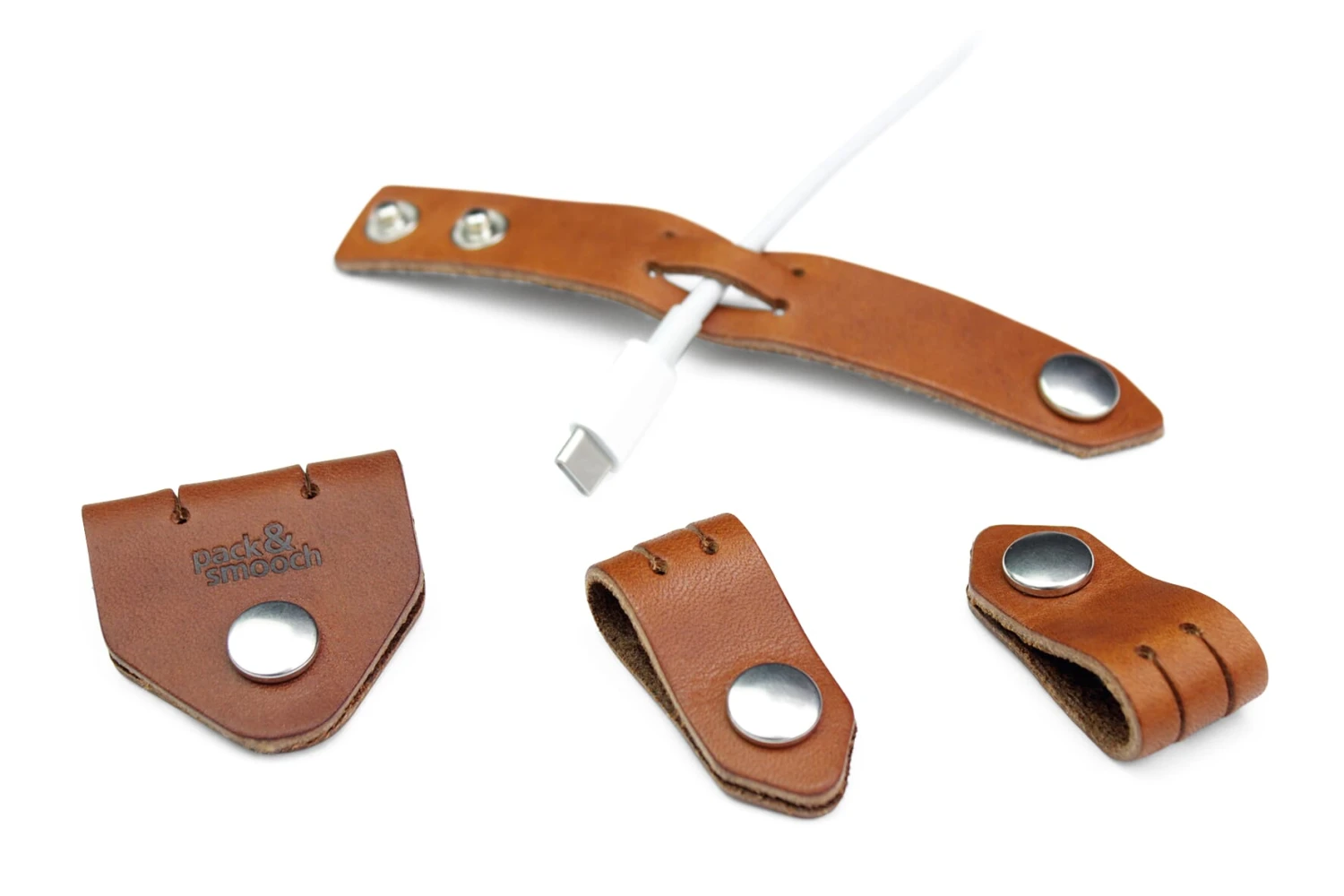 Vierteiliges Set von Kabelbindern aus naturfarbenem Leder: räumt auf mit Verknoten und Verheddern und nimmt verschiedenste Kabel sicher in den Griff. Dabei wird ein Kabelende durch zwei Schlitze des jeweiligen Lederbands geführt, um beim nächsten absehbaren Bedarf gleich wieder griffbereit zu sein.