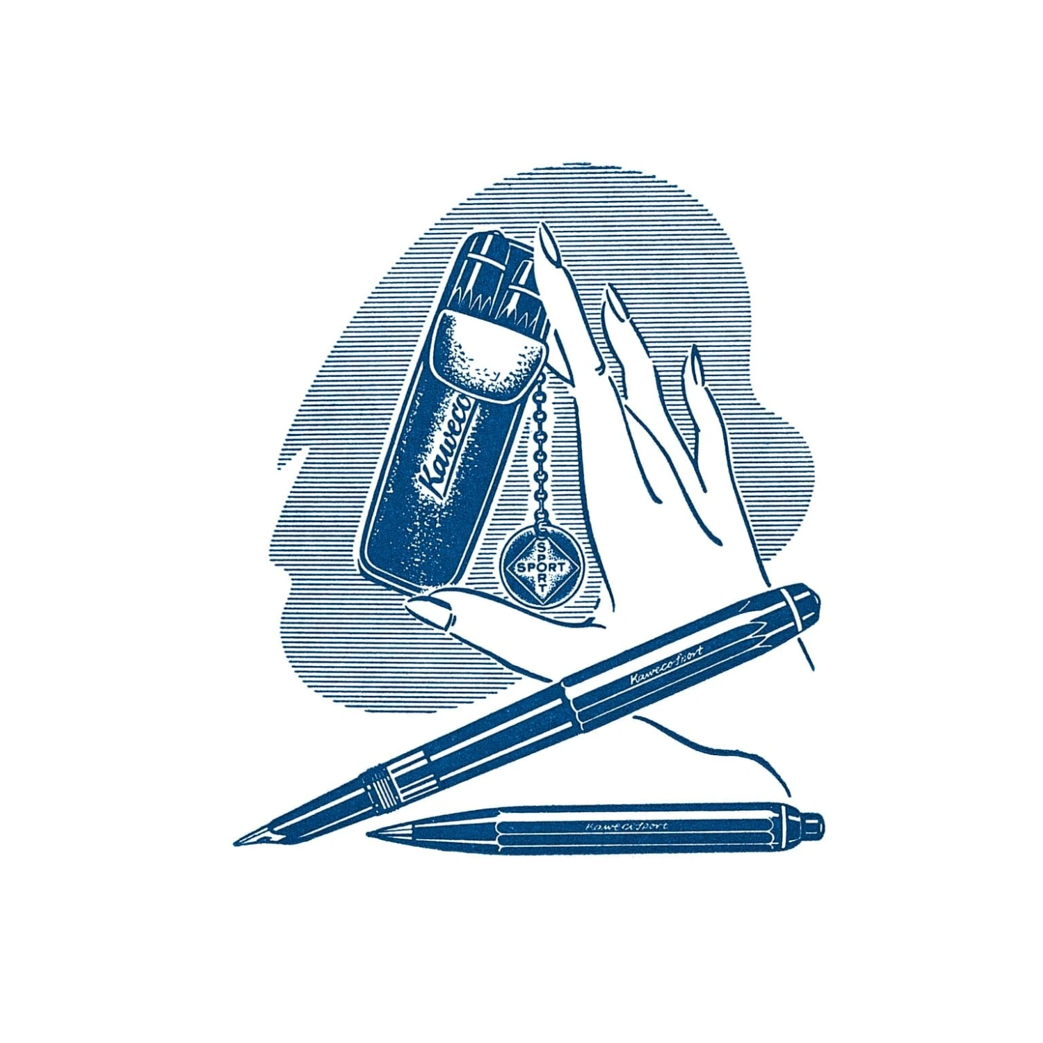 Die 1883 in Heidelberg gegründete Federhalterfabrik Koch, Weber & Co. war zeitweilig einer der bedeutendsten deutschen Hersteller von Füllfederhaltern und Zubehör, und einer der findigsten dazu: Der erste wirklich auslaufsichere „Sicherheitsfüller“ deutscher Produktion etwa stammte von dort. 1911 wurde das Modell Sport entwickelt, ein kleiner Füllfederhalter, der (in später leicht veränderter Form) bis 1970 erfolgreich im Programm war – was nicht verwundert, denn einerseits ist der geschlossene Füllfederhalter mit 10,5 cm Länge überaus kompakt, andererseits liegt er mit aufgestecktem Verschluss gut in der Hand – der ideale Reisefüllhalter also. Wir lassen ihn, angelehnt an das Design von 1935, wieder herstellen. Er hat – wie sein Vorbild – eine vergoldete Stahlfeder mit einem Schreibkorn aus Iridium. Und wie es auch Kaweco in späteren Jahren tat, stellen wir ihm mit Kugelschreiber, Druckbleistift und Fallminenstift weitere reise- und hemdtaschentaugliche Schreibgeräte an die Seite. In dieser Ausführung – mit schwarzem Gehäuse und guillochiert – gibt es sie nur bei uns.