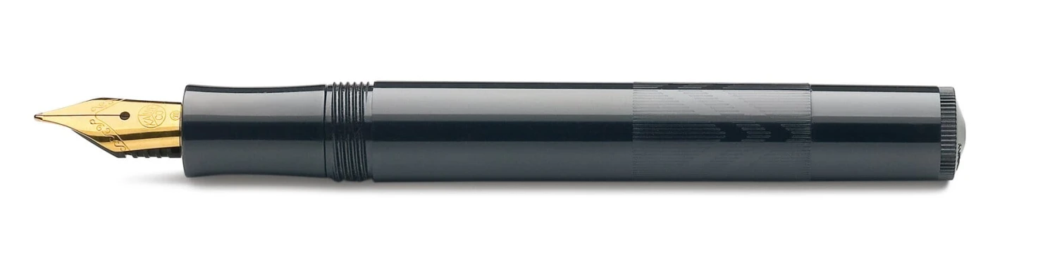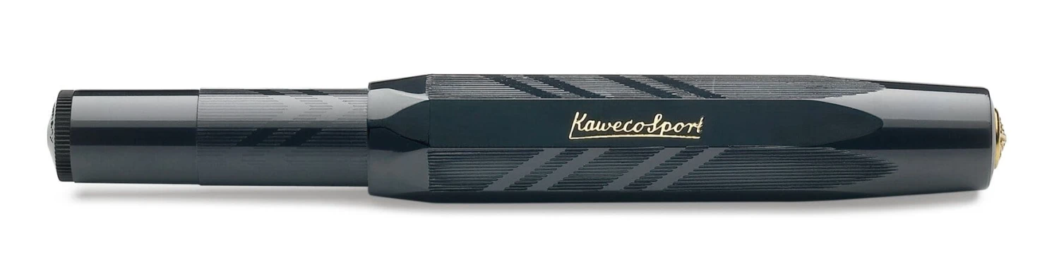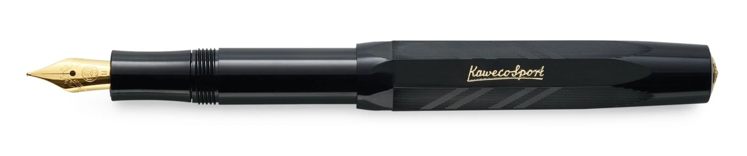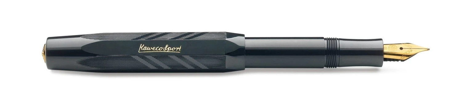 Die 1883 in Heidelberg gegründete Federhalterfabrik Koch, Weber & Co. war zeitweilig einer der bedeutendsten deutschen Hersteller von Füllfederhaltern und Zubehör, und einer der findigsten dazu: Der erste wirklich auslaufsichere „Sicherheitsfüller“ deutscher Produktion etwa stammte von dort. 1911 wurde das Modell Sport entwickelt, ein kleiner Füllfederhalter, der (in später leicht veränderter Form) bis 1970 erfolgreich im Programm war – was nicht verwundert, denn einerseits ist der geschlossene Füllfederhalter mit 10,5 cm Länge überaus kompakt, andererseits liegt er mit aufgestecktem Verschluss gut in der Hand – der ideale Reisefüllhalter also. Wir lassen ihn, angelehnt an das Design von 1935, wieder herstellen. Er hat – wie sein Vorbild – eine vergoldete Stahlfeder mit einem Schreibkorn aus Iridium. Und wie es auch Kaweco in späteren Jahren tat, stellen wir ihm mit Kugelschreiber, Druckbleistift und Fallminenstift weitere reise- und hemdtaschentaugliche Schreibgeräte an die Seite. In dieser Ausführung – mit schwarzem Gehäuse und guillochiert – gibt es sie nur bei uns.