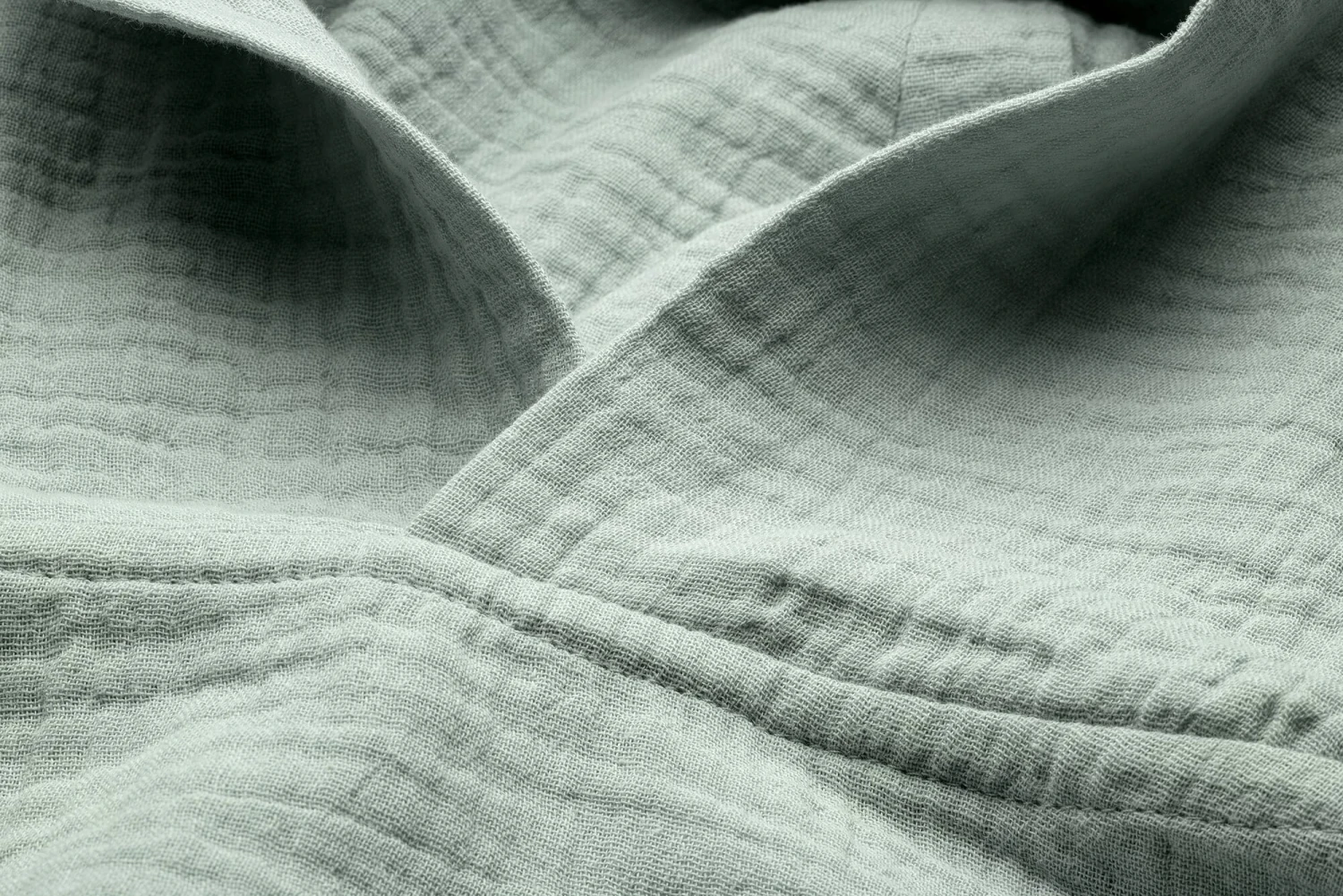 Musselin hat viele positive Trageeigenschaften, die ihn zum Material der Wahl für sommerliche Kinderkleidung machen. Zunächst einmal ist er leicht und luftig, da er aus nur leicht gedrehten Garnen in lockerer Leinwandbindung gewebt wird – was ihn zugleich besonders atmungsaktiv macht. Er wird gern mehrlagig getragen, da er dann weniger transparent ist und zudem seine temperaturausgleichenden Eigenschaften besonders gut ausspielen kann. Nicht zuletzt hat Musselin einen angenehm weichen Griff, der ihn auch für empfindliche Kinderhaut angenehm macht. Und schließlich: Der Musselin, den wir verarbeiten lassen, besteht aus kontrolliert biologisch angebauter Baumwolle.