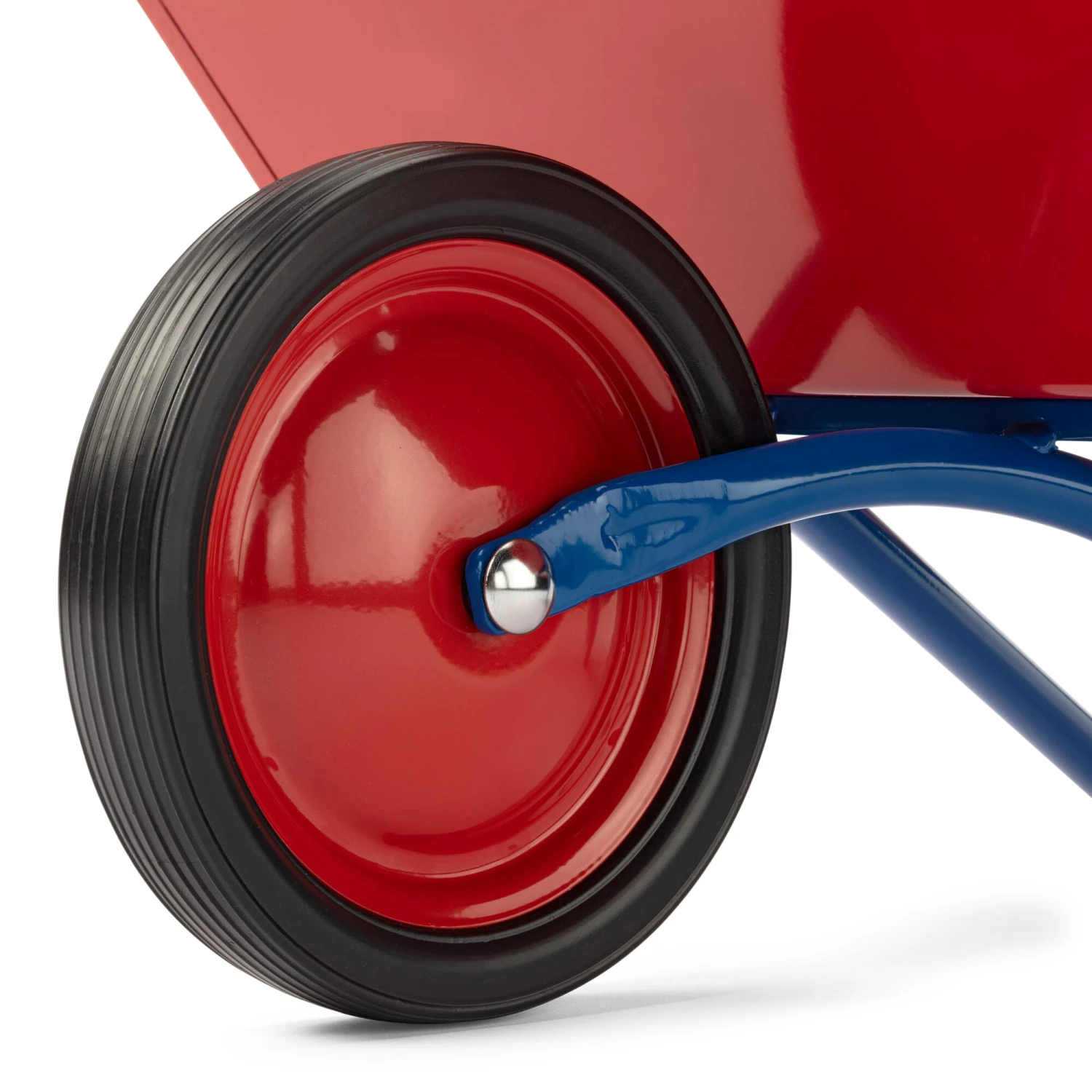 Auf dem stabilen Rahmen aus dunkelblau lackiertem Stahlrohr sitzt eine solide, flache Wanne aus rot pulverbeschichtetem Stahl. Das fällt als Erstes auf: Bis hin zu den Griffen aus robustem Leder ist kaum ein Teil dieser Kinderschubkarre aus Plastik. Einzige Ausnahme: Das große Rad besteht aus PVC; es fährt sicher auf einer Felge aus Metall. Der Hersteller gibt als maximales Belastungsgewicht für die kleine Schubkarre zehn Kilogramm an. Bemerkenswert außerdem: Das Gefährt wird komplett in Deutschland gefertigt, es kommt aus einer Werkstatt für Menschen mit Behinderung nahe dem Bodensee.