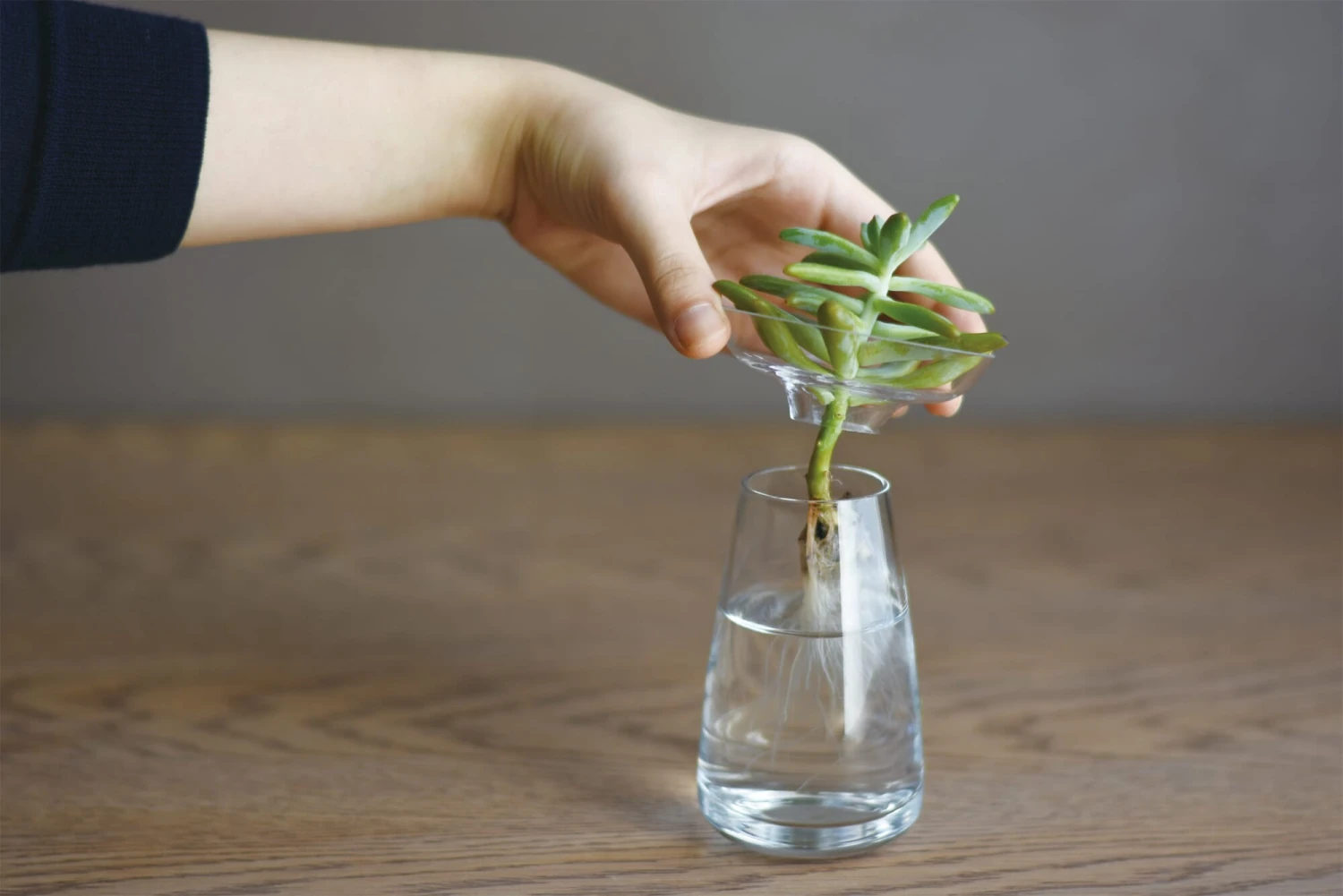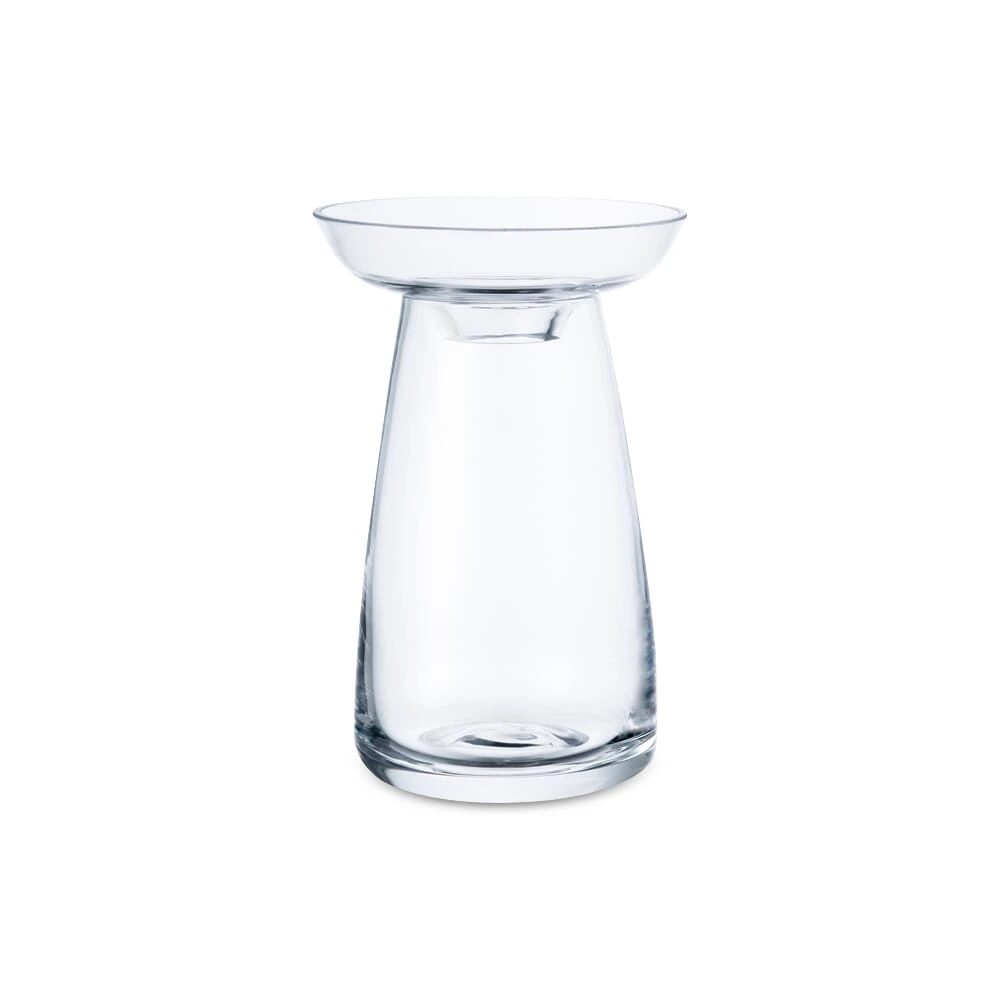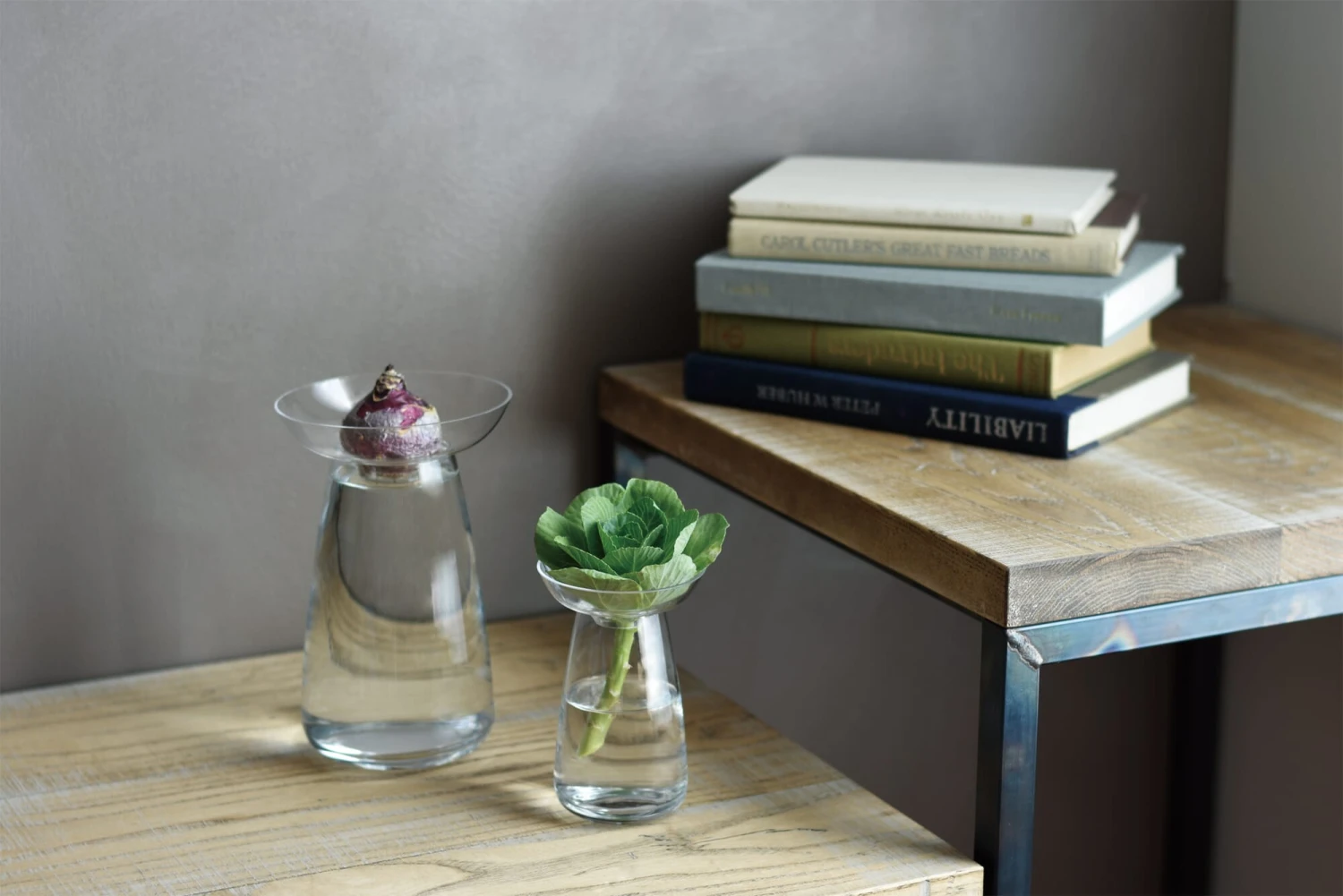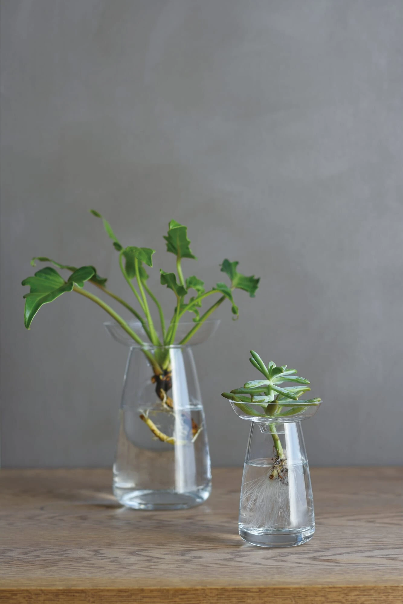Zweiteilige Vase aus Glas, bestehend aus einem Pflanzen tragenden Oberteil und einem Unterteil für Wasser. Als Vase mit oder ohne Oberteil einsetzbar. Auch zum Kultivieren von Pflanzen, deren Wurzelwerk – von Erde befreit – sich eindrucksvoll im unteren Glasbehälter entfalten kann. Wir liefern zwei verschiedene Farben.