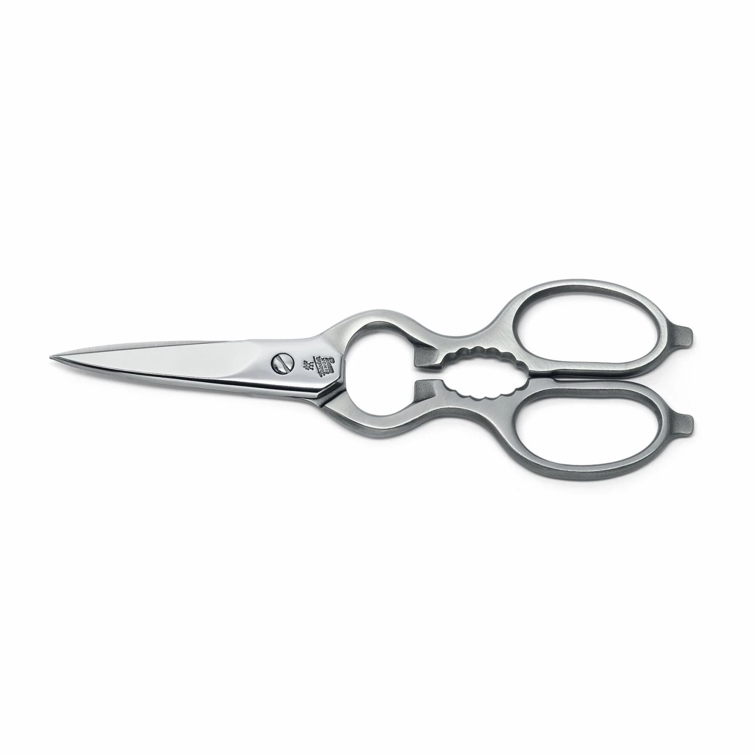 Die „Original Küchenhilfe“ wurde in den 1930er Jahren von der Solinger Traditionsschmiede Zwilling J. A. Henckels entwickelt und patentiert. Die ganz aus rostfreiem Spezialstahl geschmiedete und eisgehärtete Schere hat trotz ihrer ungewöhnlichen Stärke – die Blattstärke beträgt 3,5 mm – und ihrer massiven Körperlichkeit einen seidenweichen Gang und „singt“ dabei jenen feinen, sauberen, auch mit ungeübtem Ohr wahrnehmbaren Ton, mit dem sich jede gute Schere von ihrer klappernden Billigverwandtschaft abhebt. Mit ihren sehr fein gezahnten Blättern „fasst“ die Schere das Schneidgut sofort, der Scherengang ist mittels einer Stahlschraube justierbar.