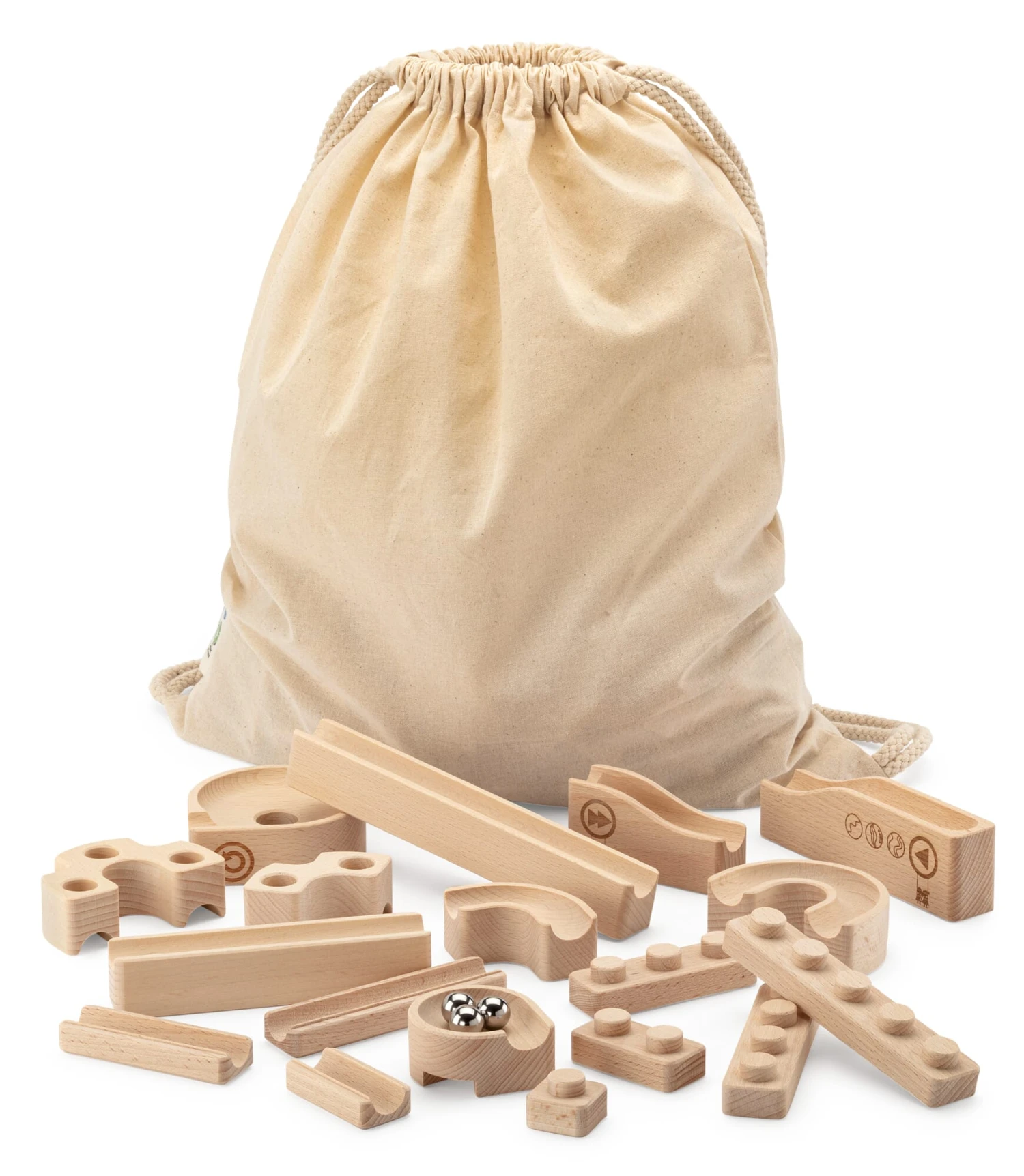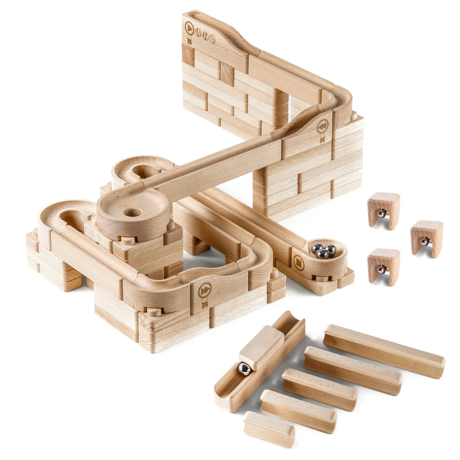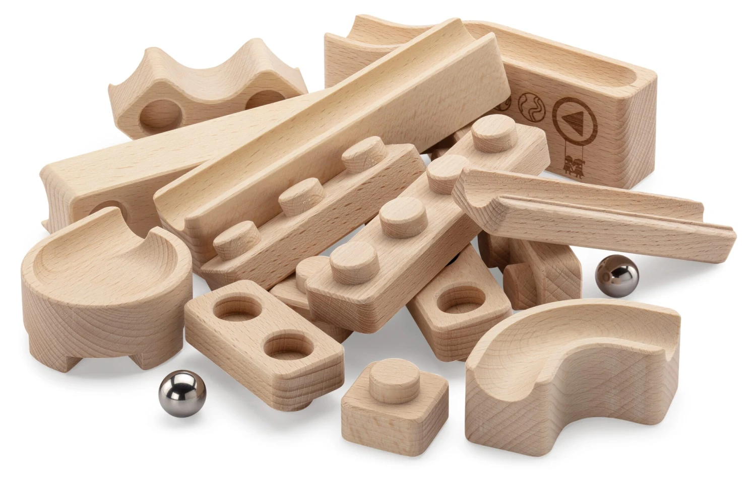 Und das i-Tüpfelchen: Jedes Bauelement ist passgenau aus massivem, festem Buchenholz gearbeitet, das Ihrem Kind die samtig-warme Haptik des natürlichen Materials und dessen Robustheit und Langlebigkeit bietet. Bis hin zur eigentlichen Kugelbahn ist jedes Element sauber geschliffen, sodass alle Bausteine sicher zueinanderfinden und die Edelstahlkugeln reibungslos durch ihre Bahn rollen können.