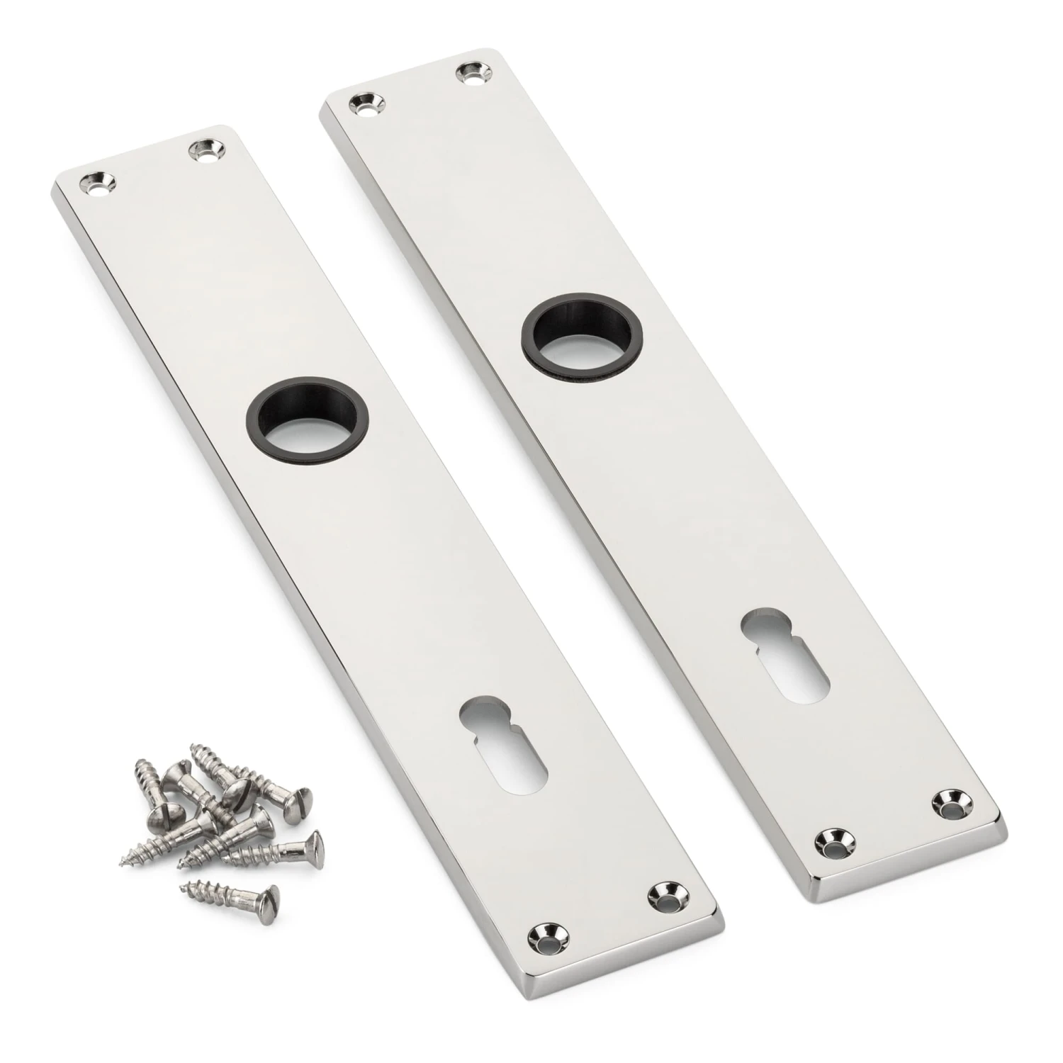 Bitte beachten Sie: Bei allen unseren Türdrückern haben Sie die Wahl und müssen daher, sofern nicht anders beschrieben, alle gewünschten Abdeckungen separat bestellen: entweder Langschilder (passend für Zimmertüren mit dem in Deutschland üblichen Normabstand von 72 mm zwischen Schlüssel- und Grifflochmitte) oder ein Set aus Griff- und Schlüsselrosetten, bei denen der Normabstand keine Rolle spielt. Wir bieten Ihnen hier die Abdeckungen für Buntbart-Schlösser (normaler Zimmerschlüssel) an. Die Türgriffe haben einen Vierkant von 8 × 8 mm, die Fenstergriffe einen von 7 × 7 mm. Das sind die Normgrößen für heutige Innentüren und Fenster.