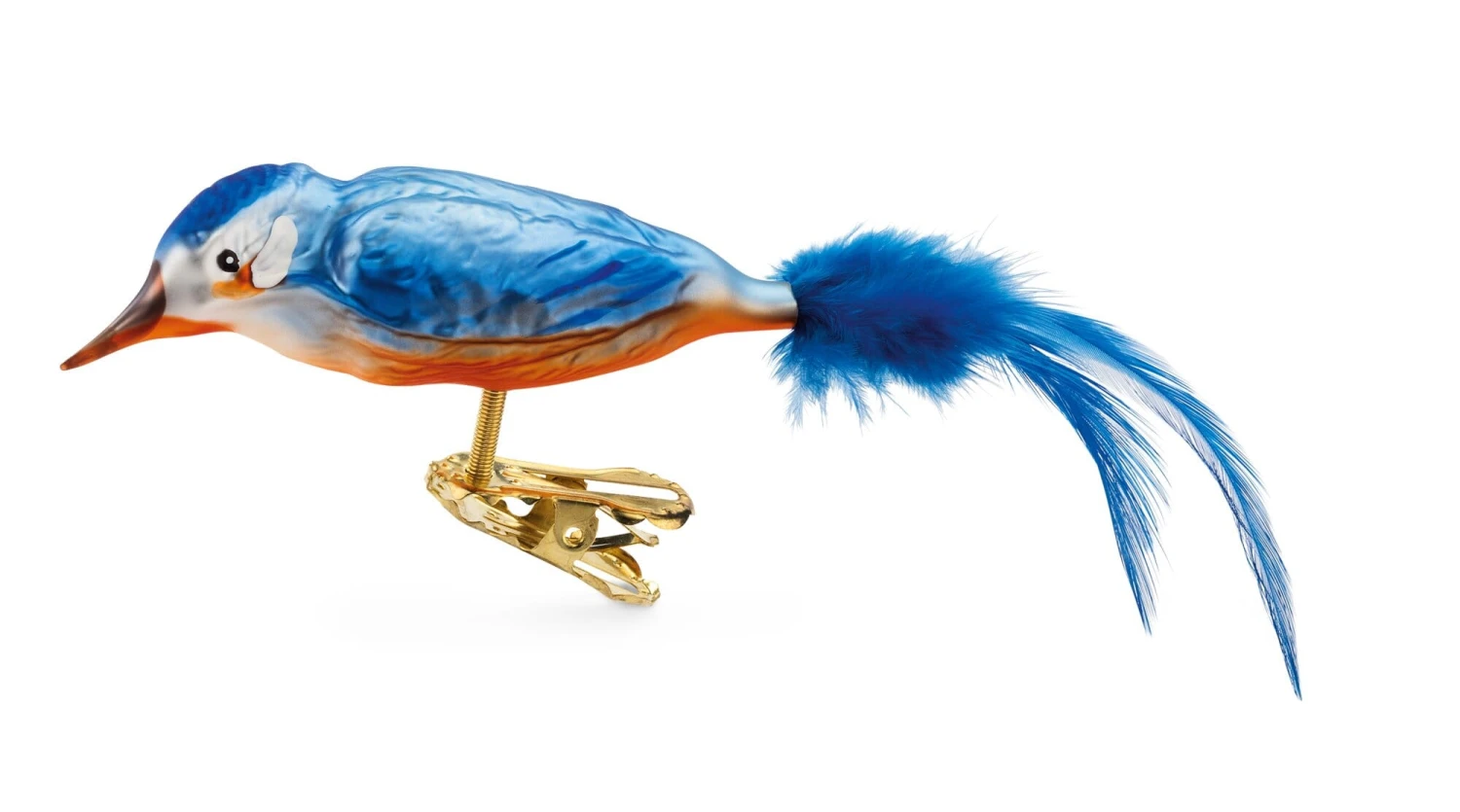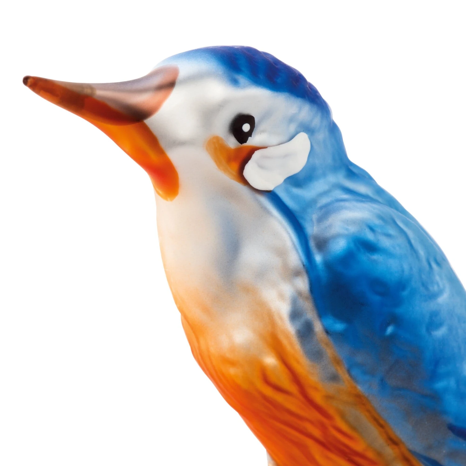 Der Lauschaer Eisvogel aus Glas wird in eine zweiteilige Negativform aus Keramik geblasen, in naturgetreuen Farben kunstvoll bemalt und mit einer echten Hühnerfeder verziert. Der Eisvogel wippt auf einer Metallfeder.
