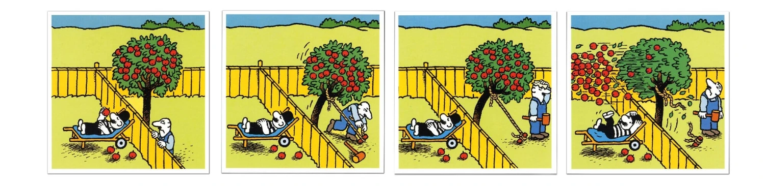 So kurz die Abenteuer auch sind – sie werden jeweils auf nur vier Einzelkarten dargestellt –, jede kommt ohne ein Wort, ohne eine Sprechblase aus. Der Reiz des Spiels liegt also zuerst darin, die auf den Karten dargestellten Szenen in die richtige Reihenfolge zu bringen, damit sich überhaupt erst eine zusammenhängende Handlung ergibt. Alsdann folgt das Schmunzeln über selbige: wenn im Kreis schwimmende Goldfische aus ihrem Aquarium in den Fluss freigelassen werden, nur um dort wieder im Kreis um sich selbst zu schwimmen; oder wenn Herr Jakob eine Eiswaffelverlängerung in Form von noch mehr Eiswaffeln findet, damit die Giraffe im Zoo sich nicht den Hals verbiegen muss, will sie am Eis schlecken; oder wenn ihn sein findiger Hund hinters Licht führt, damit er Jakobs Sessel okkupieren kann. Der Schwierigkeitsgrad der Geschichten ist unterschiedlich, ihr Handlungsablauf aber immer eindeutig; so eignen sie sich beispielsweise auch gut, ihren Verlauf oder die letzte Szene zu erraten.