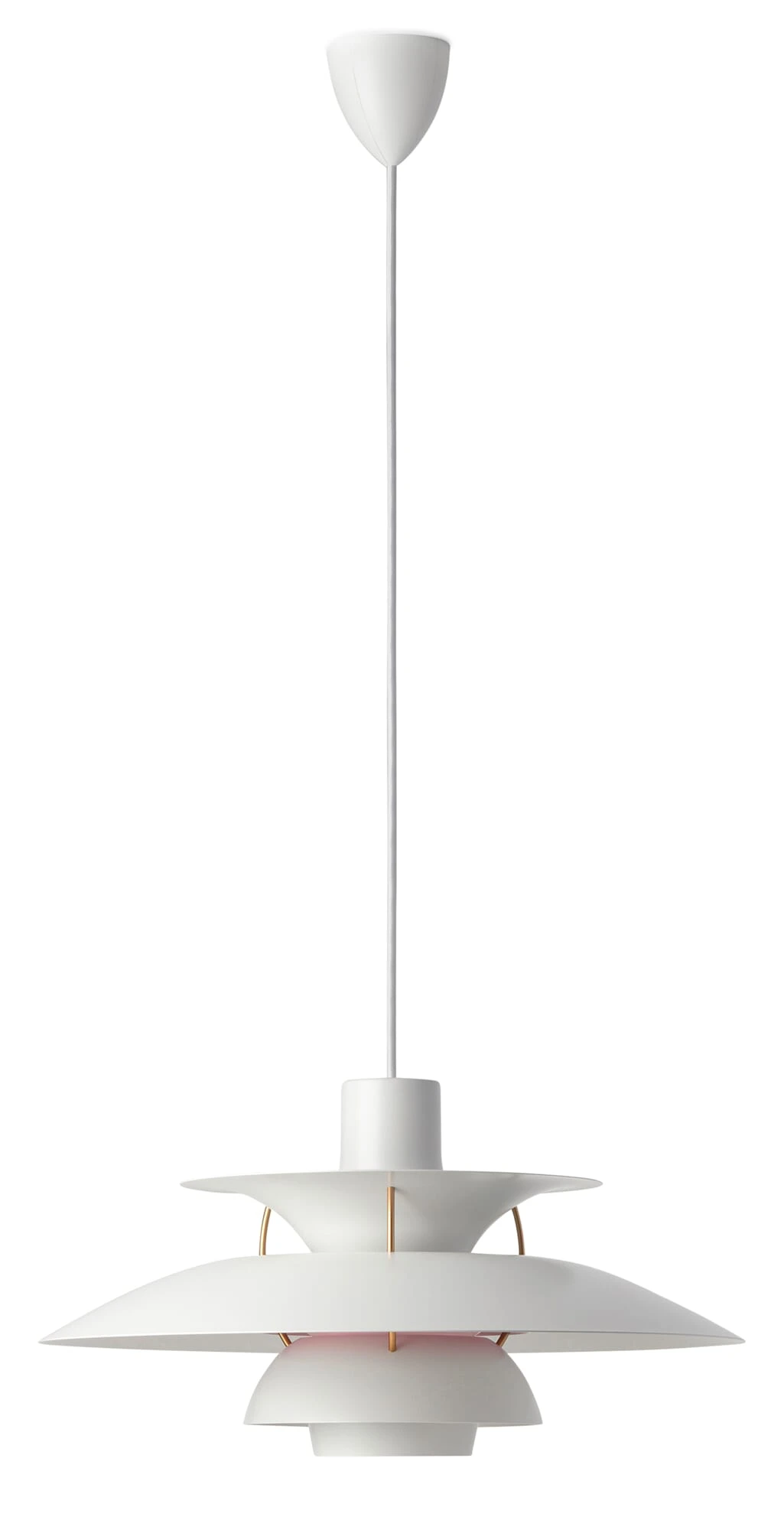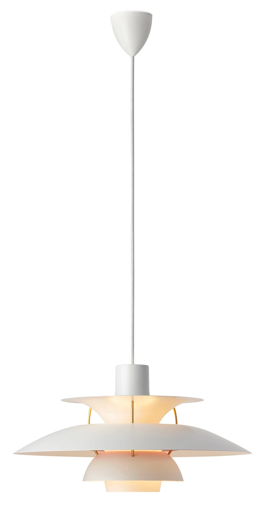 Beispielhaft umgesetzt ist Poul Henningsens Lichtsystem bei der 1958 eingeführten Pendelleuchte PH 5. Ganz gleich ob sie hoch im Raum oder niedrig über einem Tisch hängt, blenden wird sie nie – und zwar unabhängig von der gewählten Lichtquelle. Die Leuchte ist in ihrem Ursprungsland so ubiquitär verbreitet, dass man sie gefühlt in jedem Haushalt wähnt – wobei das ursprünglich weiße Original längst um diverse farbige Varianten ergänzt wurde. Ihren Namen verdankt die PH 5 übrigens dem größten Schirmsegment, dessen Durchmesser beeindruckende 50 Zentimeter misst. Die PH 5 richtet den größten Teil des abgestrahlten Lichts nach unten; das trompetenförmige obere Segment strahlt einen Teil des Lichts jedoch auch zu den Seiten ab, wodurch die Umgebung zusätzlich indirekt beleuchtet wird.