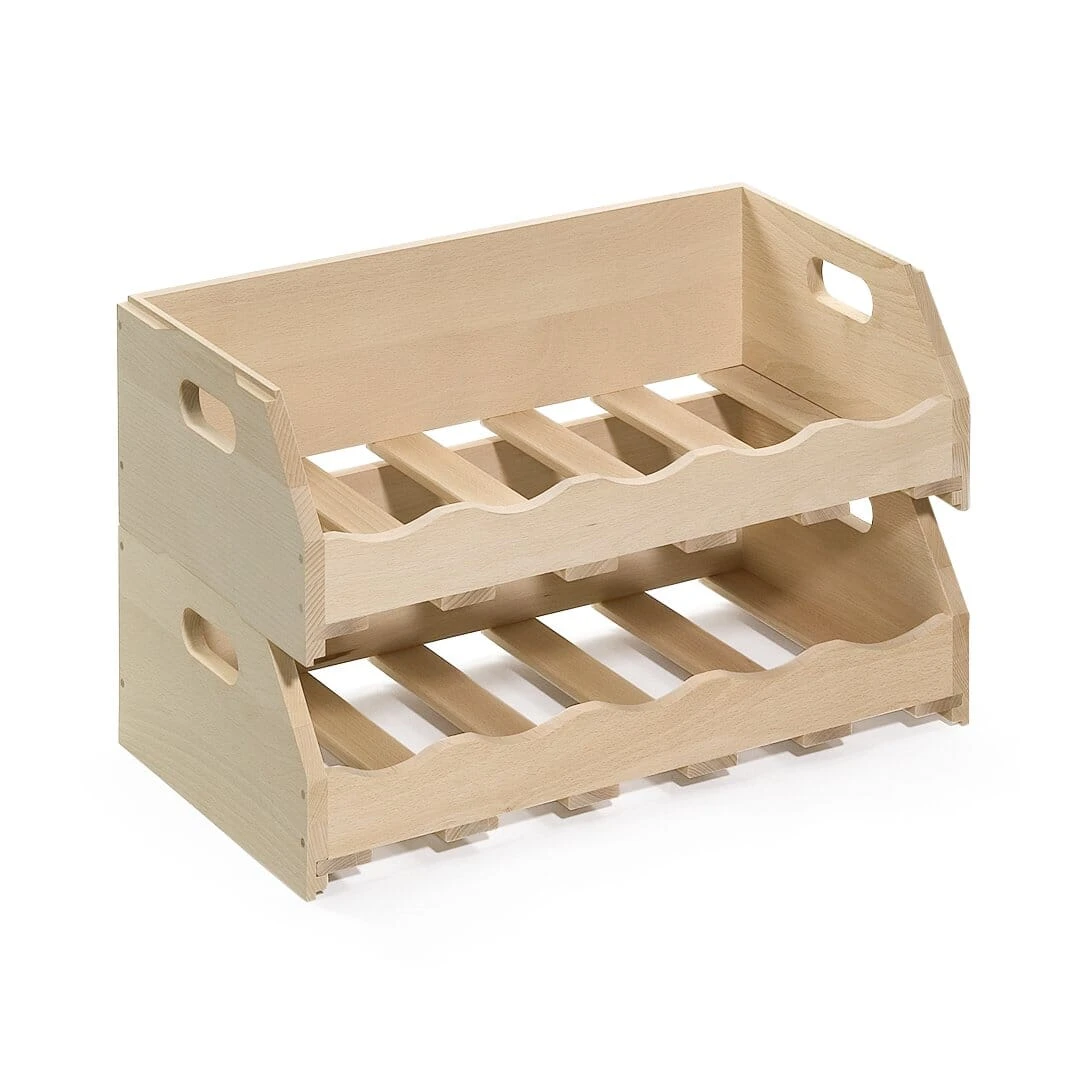 Diese großen Vorratskisten aus Buchenholz haben ein praktisches Querformat; so können sie nicht nur bequem getragen werden, da ein ganzes Vorratsregal aus gestapelten Kisten ja sogar weniger raumgreifend ist. Die Obst- oder Gemüsekiste dient der Lagerung von Äpfeln, Zwiebeln, Kartoffeln und Anderem (bitte sortiert und nicht unmittelbar benachbart), die Flaschenkiste der Aufbewahrung von Wein- oder Saftflaschen. Vorn ist eine breite Öffnung, die die Entnahme des gelagerten Gutes erleichtert; die seitlichen Eingriffe vereinfachen das Tragen. Durch eine seitlich eingearbeitete Ausbuchtung stehen die Kisten fest und sicher aufeinander; gefertigt sind sie aus massiver, unbehandelter Buche. (Lieferung jeweils ohne Inhalt.)