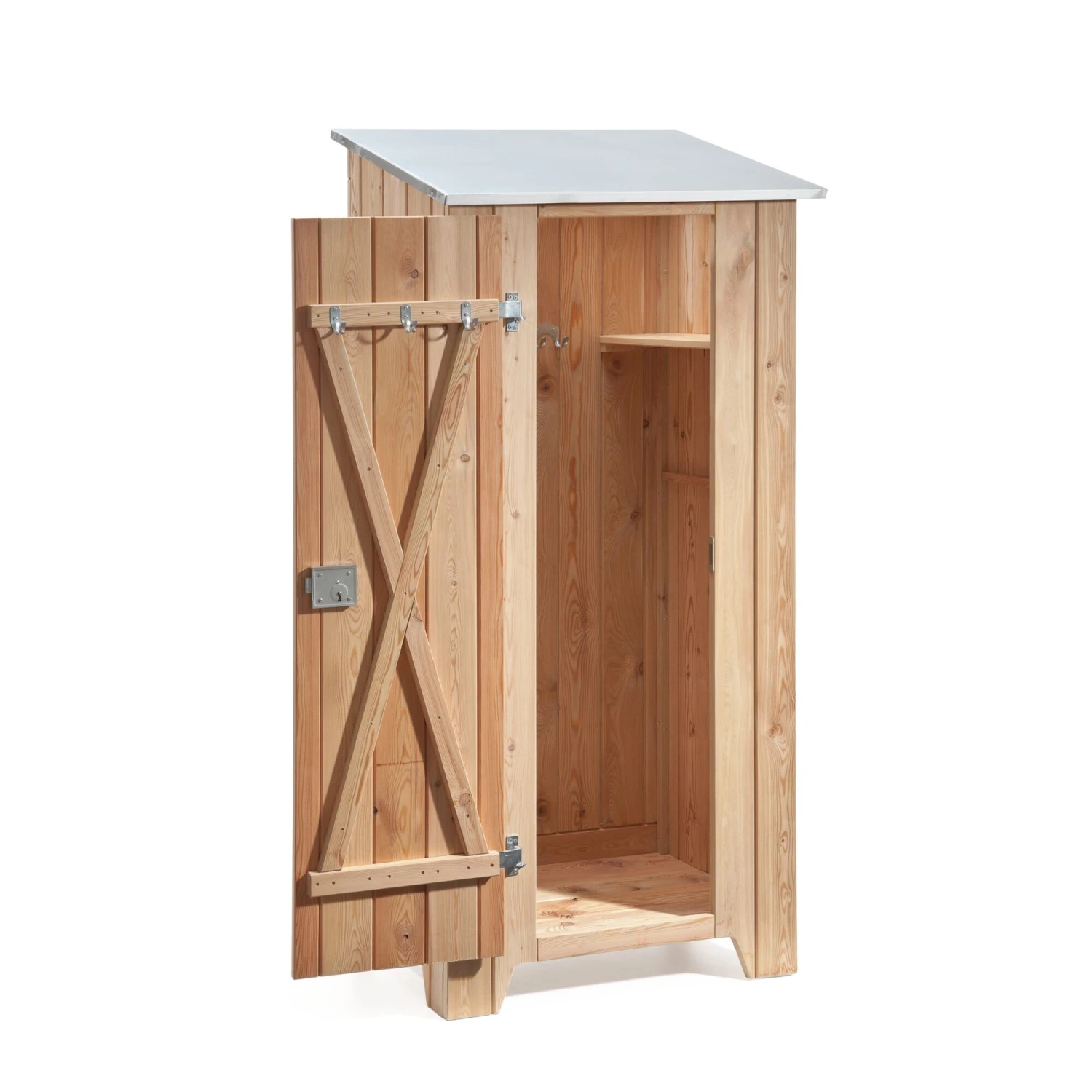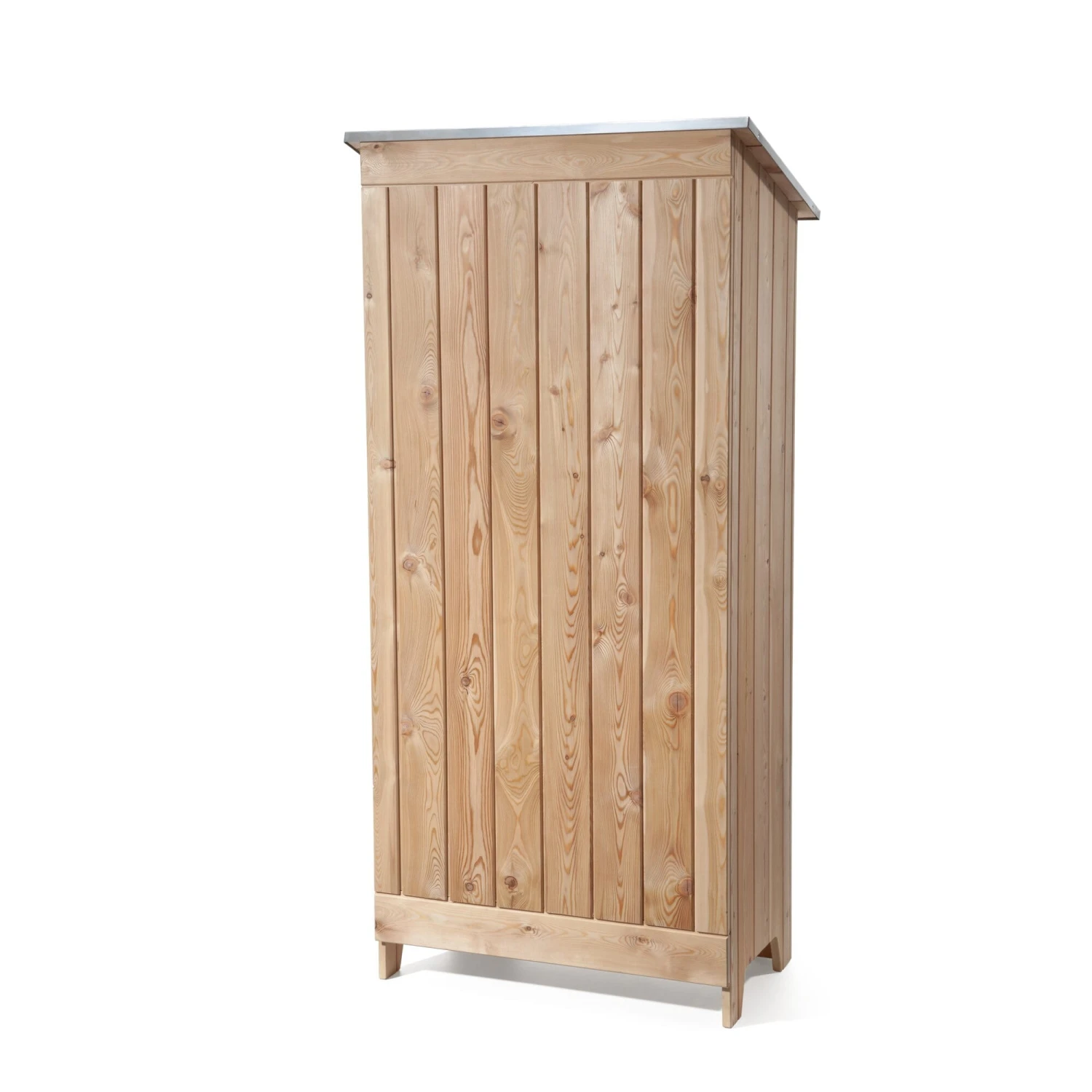 Als Alternative zu aus öldruckimprägniertem Billigholz gemachten Fertigteilen hier ein in Lüneburg aus witterungsbeständigem Lärchenholz gefertigtes und mit einem Dach aus Zinkblech versehenes Möbel, das man wahlweise „Gartenschrank“ oder „Gartenhäuschen“ nennen könnte. Der Korpus ist aus Brettern mit einer Stärke von 20 mm zusammengefügt, die durch Nut und Feder miteinander verbunden sind. Im Innern bieten fünf Regalbretter (vier auf der linken und eines auf der rechten Seite) genügend Ablagefläche, zwei Doppelhaken an der Rückwand nehmen langstielige Geräte und drei Einfachhaken innen an der Tür die Schürze oder andere Utensilien auf. Das hochwertige Kastenschloss ist ebenso wie die Beschläge aus massivem verzinktem Stahl. Insgesamt ein Möbel, das seinen Platz durchaus auch auf der Terrasse finden kann.
