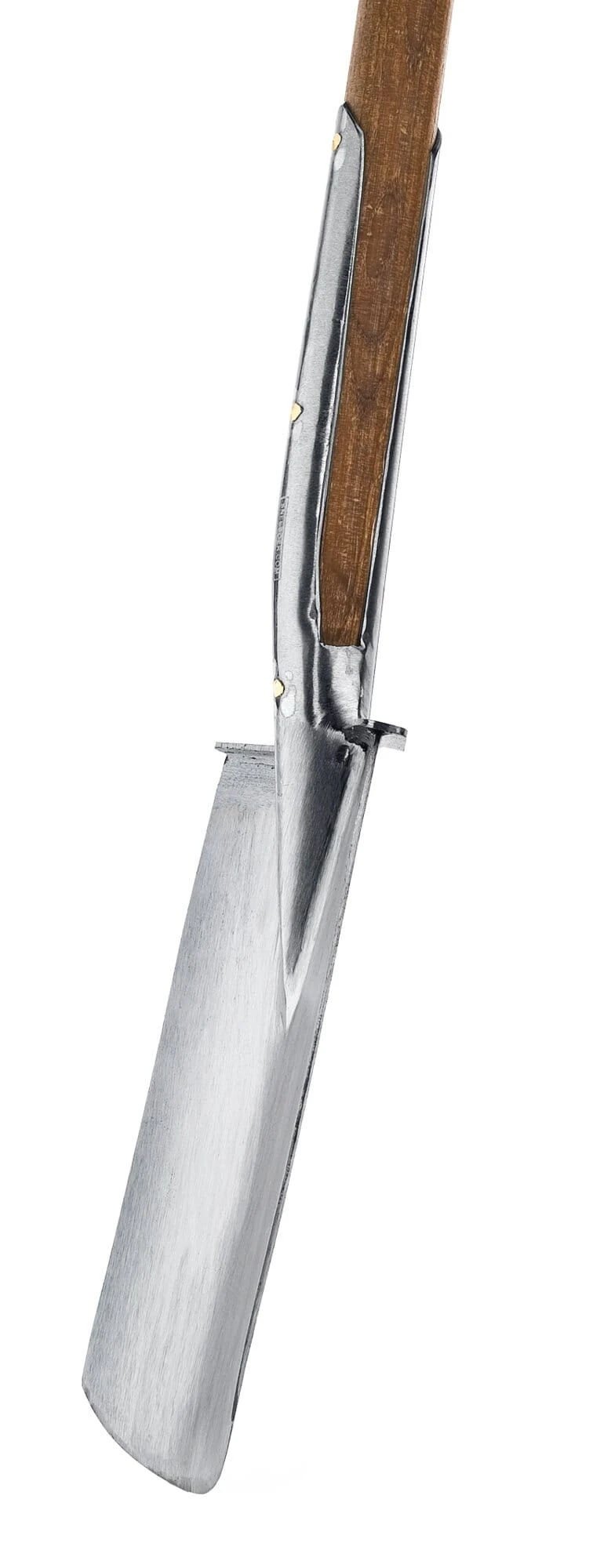 Wir lassen zwei unterschiedliche Edelstähle bei Sneeboer in Nordholland verarbeiten: einen höher legierten, zäheren für die Federn und Tüllen der Stielhalterungen und einen niedriger legierten, besser schmiedbaren für die Funktionsteile. Bei allen Geräten haben wir die Federn und Tüllen verlängern lassen, was eine höhere Stabilität bei der Arbeit und geringere Bruchgefahr für den makellosen Stiel garantiert. Die Tüllen werden mit Messingnieten dauerhaft und sicher befestigt.