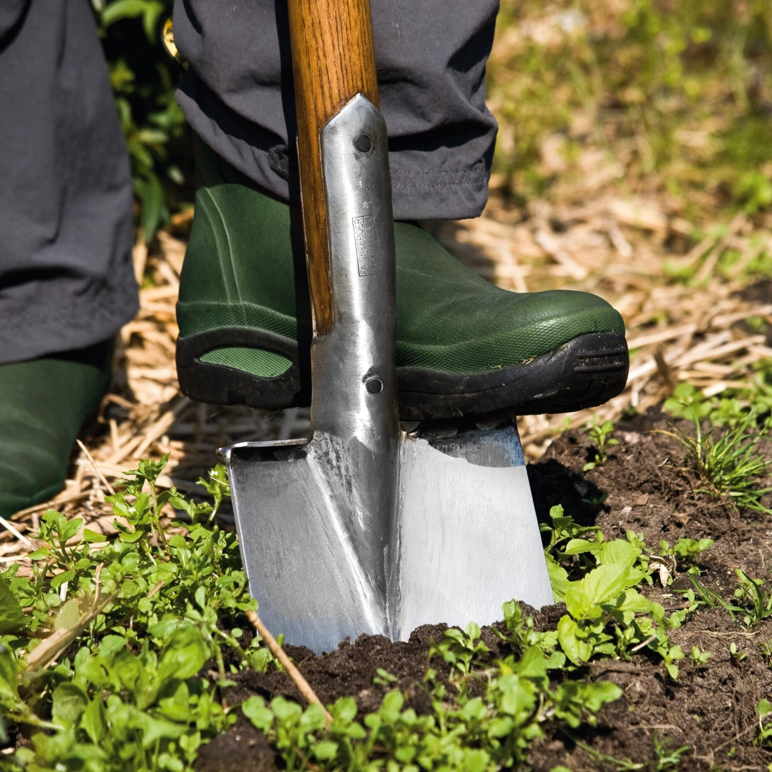 In der klassischen Form des „englischen Gartenspatens“. Neben vielen anderen Nutzungsmöglichkeiten ist der Spaten unersetzlich, um Stauden zu teilen, große Pflanzlöcher auszuheben, Beetkanten abzustechen oder bisher ungenutzte Flächen urbar zu machen.