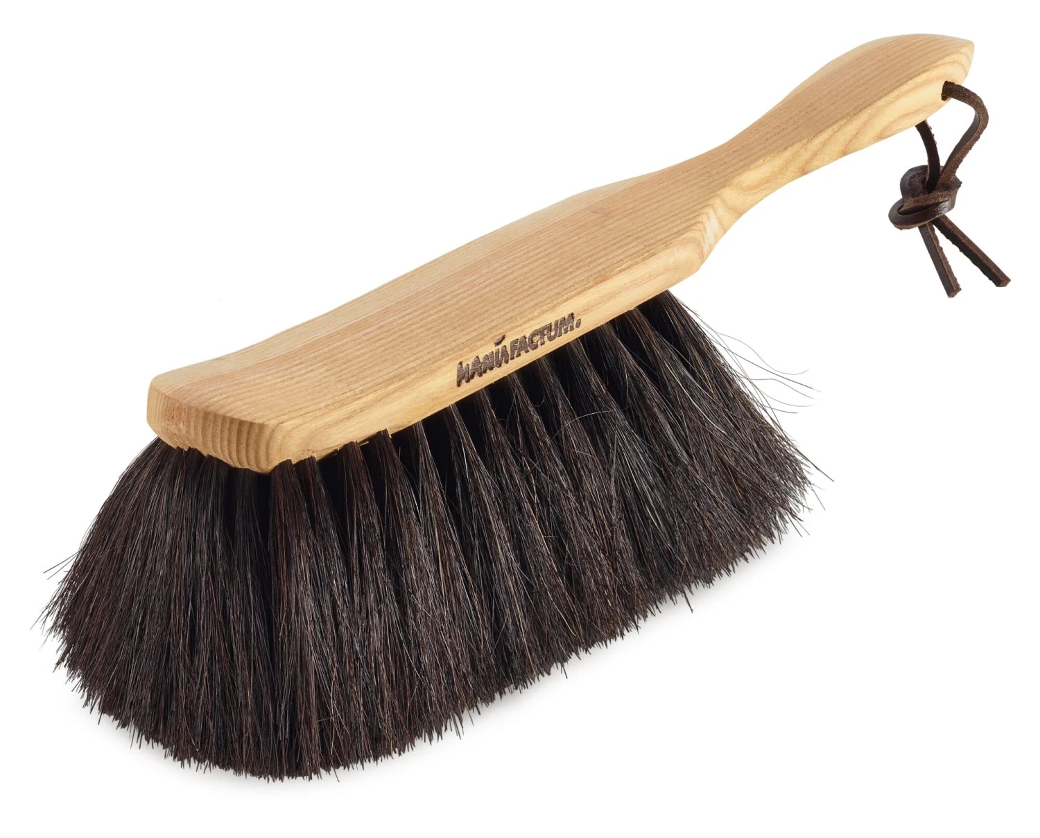 Unseren Handfeger lassen wir eigens aus natürlichen Materialien machen: Der Korpus wird aus Eschenholz gefertigt, für den Besatz wird Rosshaar verwendet.