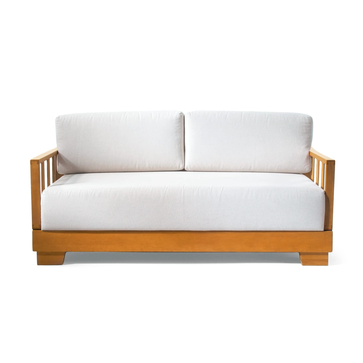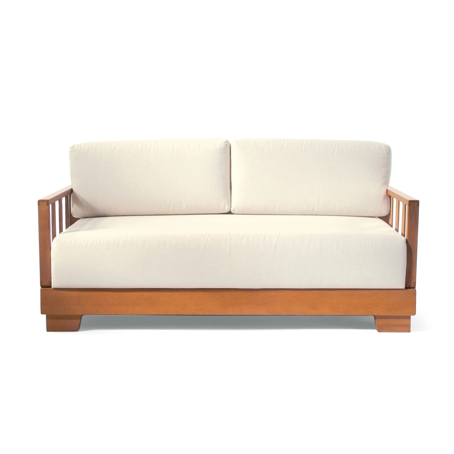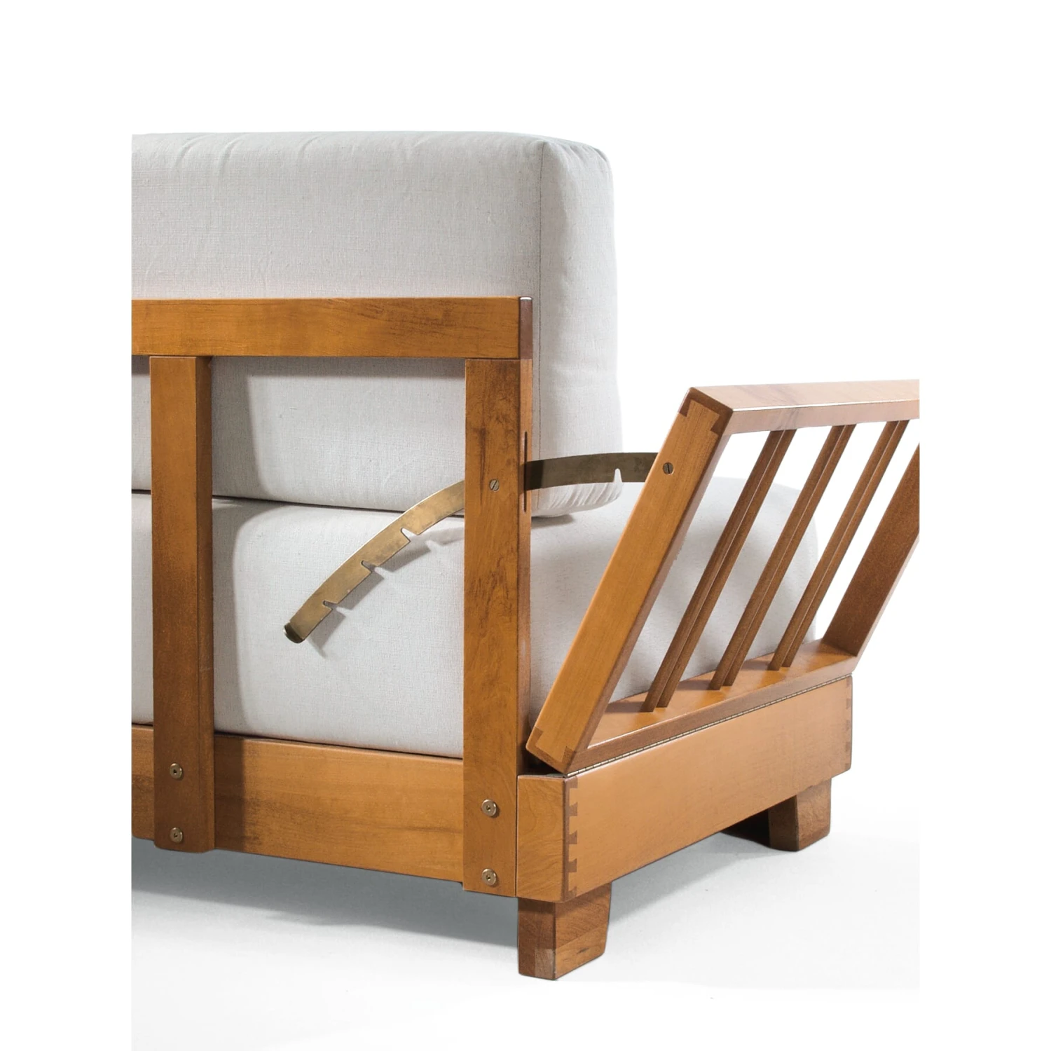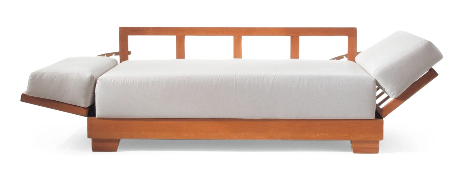 Die alte Form des zur Liege veränderbaren Sofas: Beide Seitenteile sind über einen soliden Mechanismus aus Messing in fünf Stufen (bis 90°) abklappbar. Die beiden Rückenpolster verlängern den Zweisitzer auf Bettlänge (Liegefläche ca. 215 × 73 cm). Das Polster bietet einen mittelharten, federnden Sitzkomfort. Das Hauptpolster hat einen Holzrahmen mit Federholzleisten aus Buche, darauf einen Federkern, der mit einem Polsterfilz abgedeckt ist. Insgesamt ist die Matratze 23 cm stark. Die Rückenkissen sind aus wassergeschäumtem Schaumstoff.