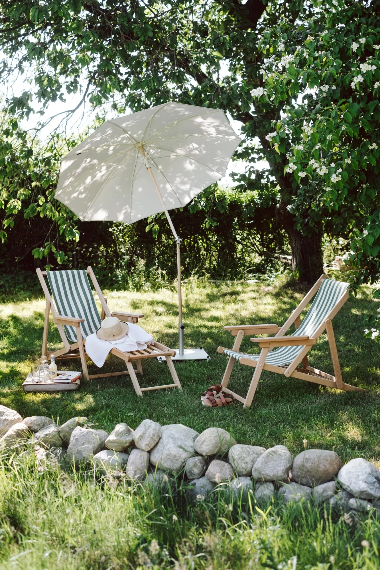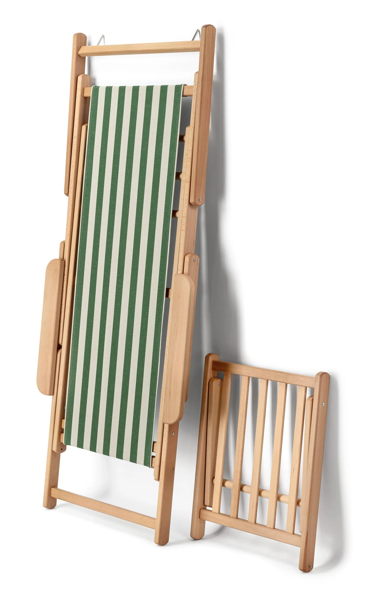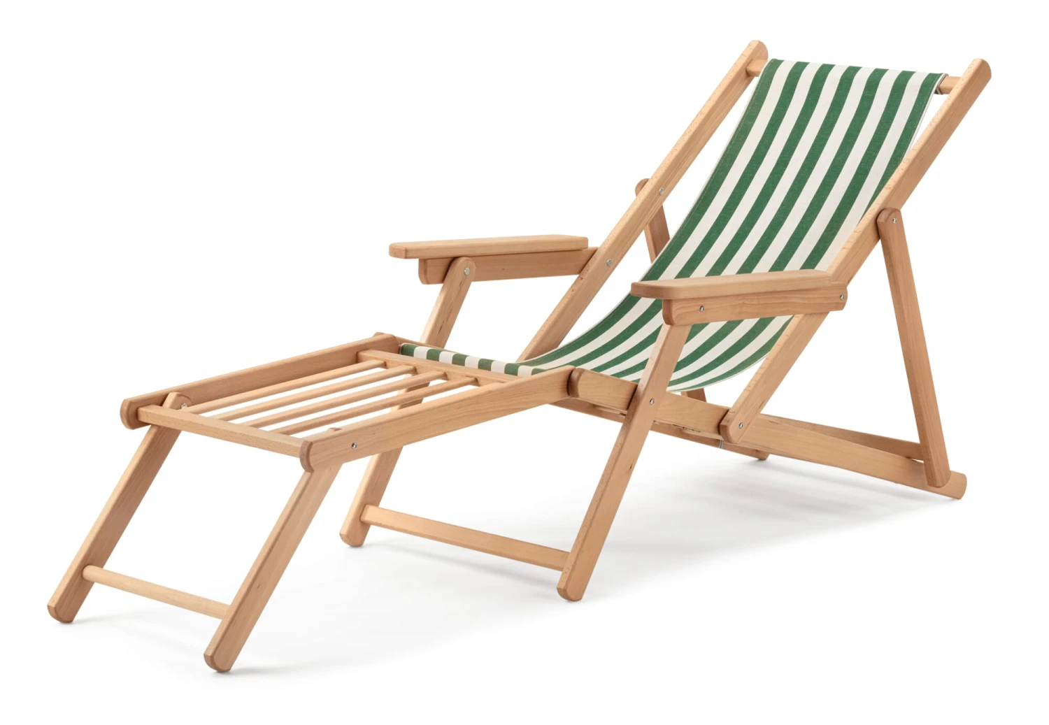 Mit dem opulenten Gestell aus heimischer Buche und der Bespannung aus festem Segeltuch ist unser Liegestuhl gleichermaßen bequem wie belastbar – nicht zuletzt dank der Sitzgurte aus Jute, die entspanntes Liegen (und Sitzen) ermöglichen und das Aufstehen erheblich erleichtern. Das ist eine Ausstattung, wie sie anderswo heute kaum noch zu finden ist. Deswegen lassen wir den Liegestuhl eigens für uns fertigen, auch der Stoff wird extra für die Bespannung gewebt. Die Rückenlehne lässt sich dreifach in der Höhe verstellen, breite Armlehnen und das einfach ein- und auszuhängende Fußteil erhöhen den Komfort zusätzlich. Für das Gestell verwendet der Hersteller im sächsischen Döbeln Buchenholz aus der Umgebung seiner Werkstätten, das oberflächlich mit einem Holzöl auf Leinölbasis behandelt wird. Das grün-weiß gestreifte Tuch für die Bespannung wird in gewohnter Qualität und Reißfestigkeit bei der Schlitzer Leinen-Industrie Driessen gewebt. Der Bezug kann zur Reinigung abgenommen werden und lässt sich, da er über je einen Holzstab oben und unten sicher ins Gestell eingeklemmt ist, einfach abnehmen.
