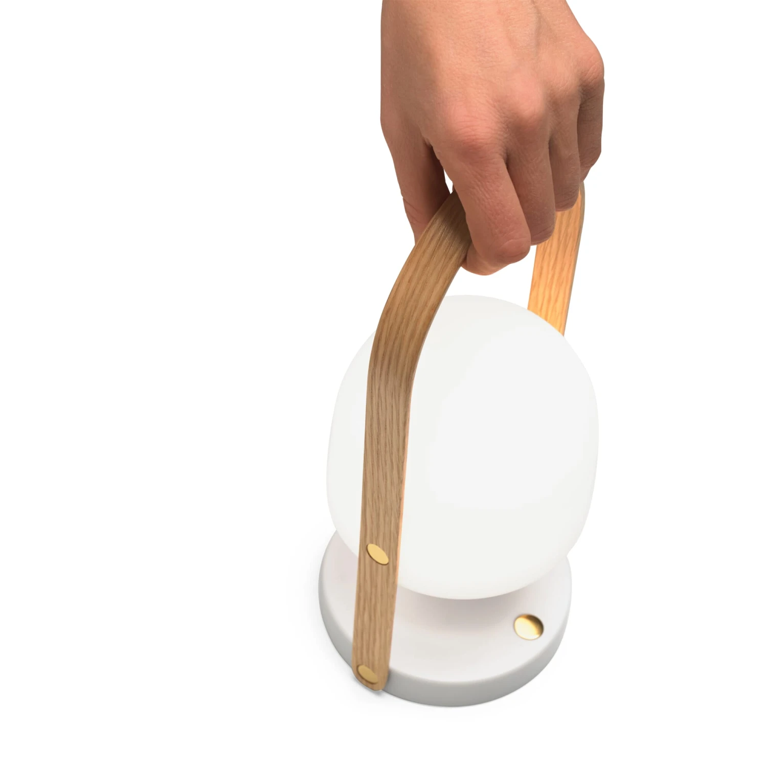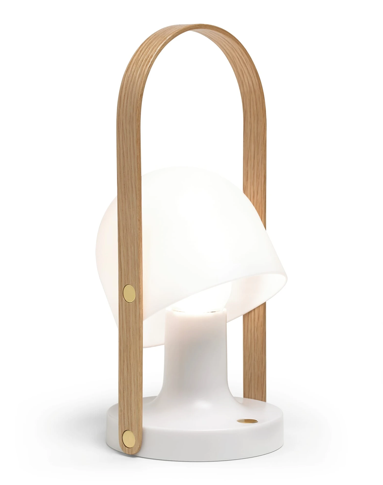 Auf dem Tisch, neben dem Bett, als Regalleuchte oder auf dem Fensterbrett – FOLLOW ME ist als mobile akkubetriebene Leuchte eine überall gern eingesetzte Lichtquelle. Dabei wirkt sie in ihrer kleinen Baugröße und mit dem charmanten hölzernen Henkel nicht wie ein kleines Hightech-Gerät. Der über eine Achse kippbare Schirm ermöglicht – in begrenztem Maße – das Ausrichten des Lichts. Ein integrierter Dimmschalter variiert das Licht in drei Helligkeitsstufen. Mit USB-Port. Die Leuchte enthält LED-Lampen. Lichtstrom: 240 lm, Farbtemperatur: 2.700 K, Nennleistung: 3,2 W.