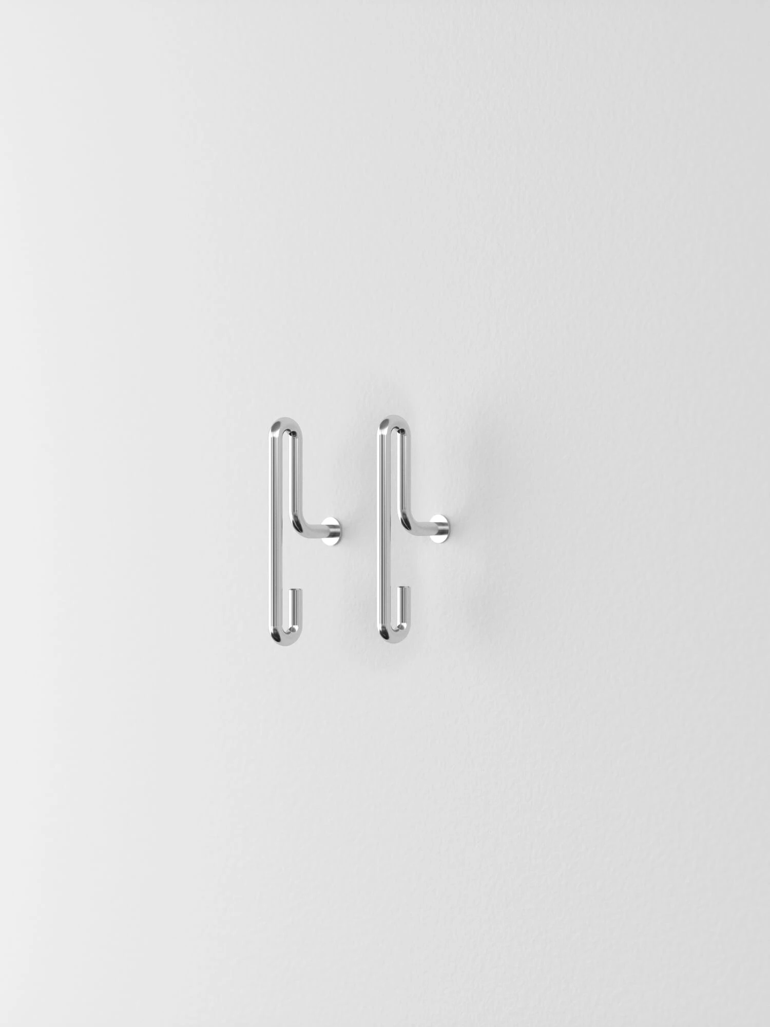 Formschöner Wandhaken – hier in seiner kleinen Form – in verschiedenen Materialien und Oberflächen. Die Form stellt eine zweifache Nutzung bereit: am unteren Ende und am oberen weich geformten Radius. Nutzbar für Kleidung in der Garderobe oder auch für Handtücher im Badezimmer.
