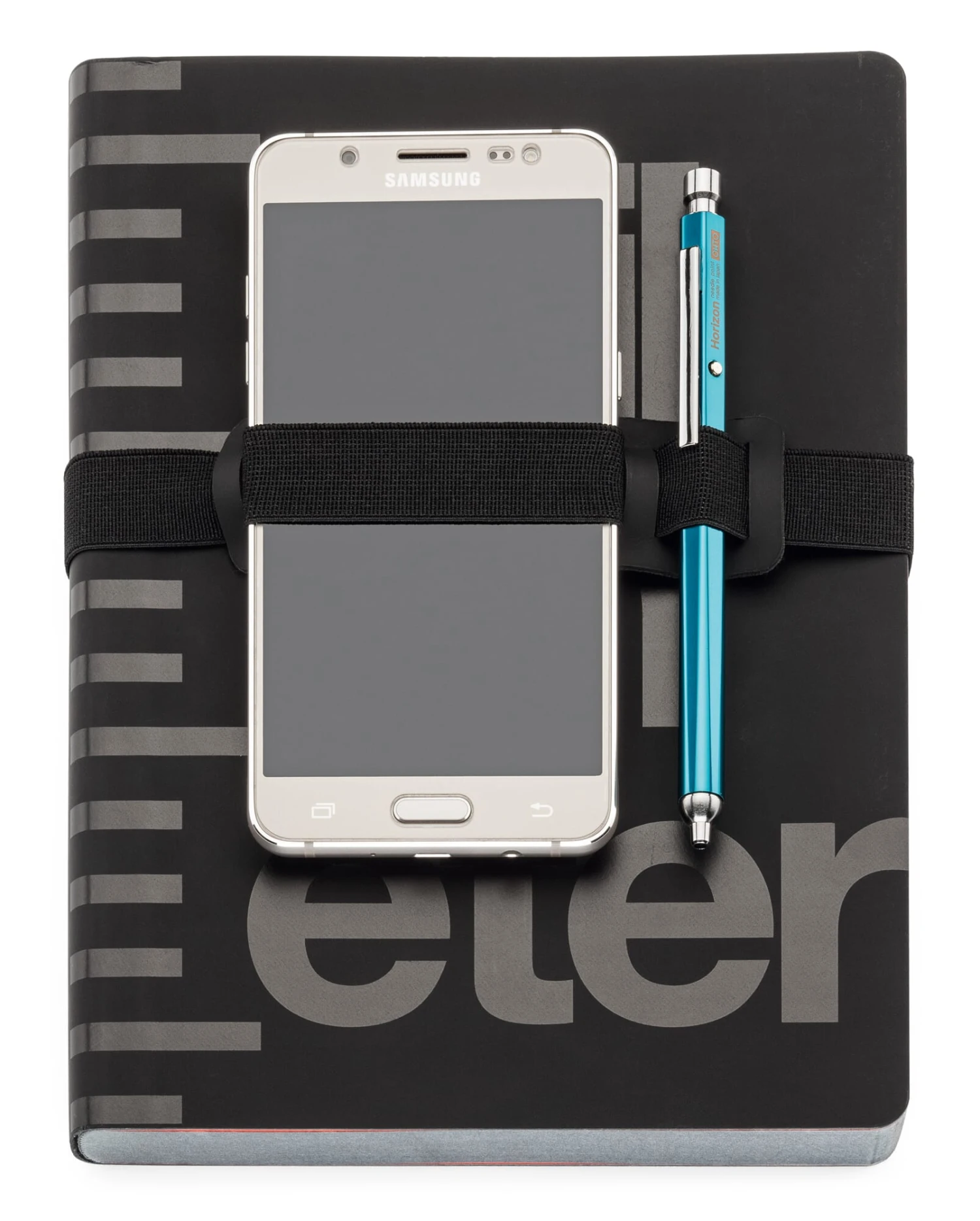 - Mit elastischem Textilgummiband für Stift, Smartphone u. a.