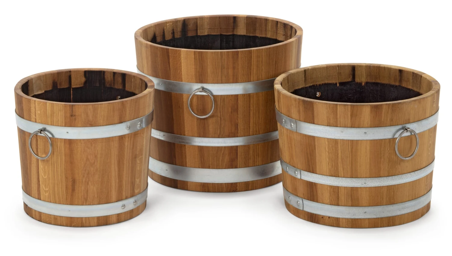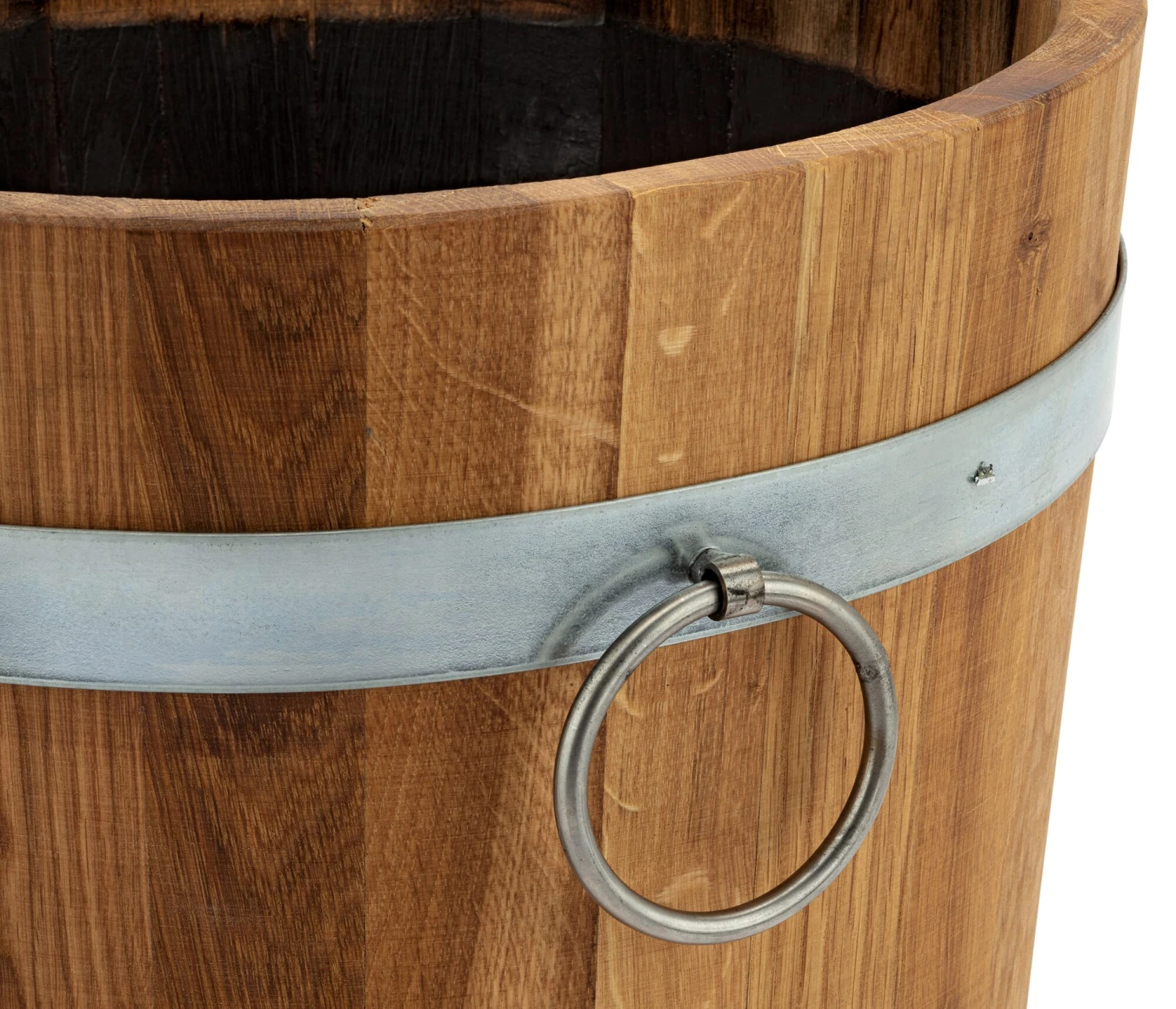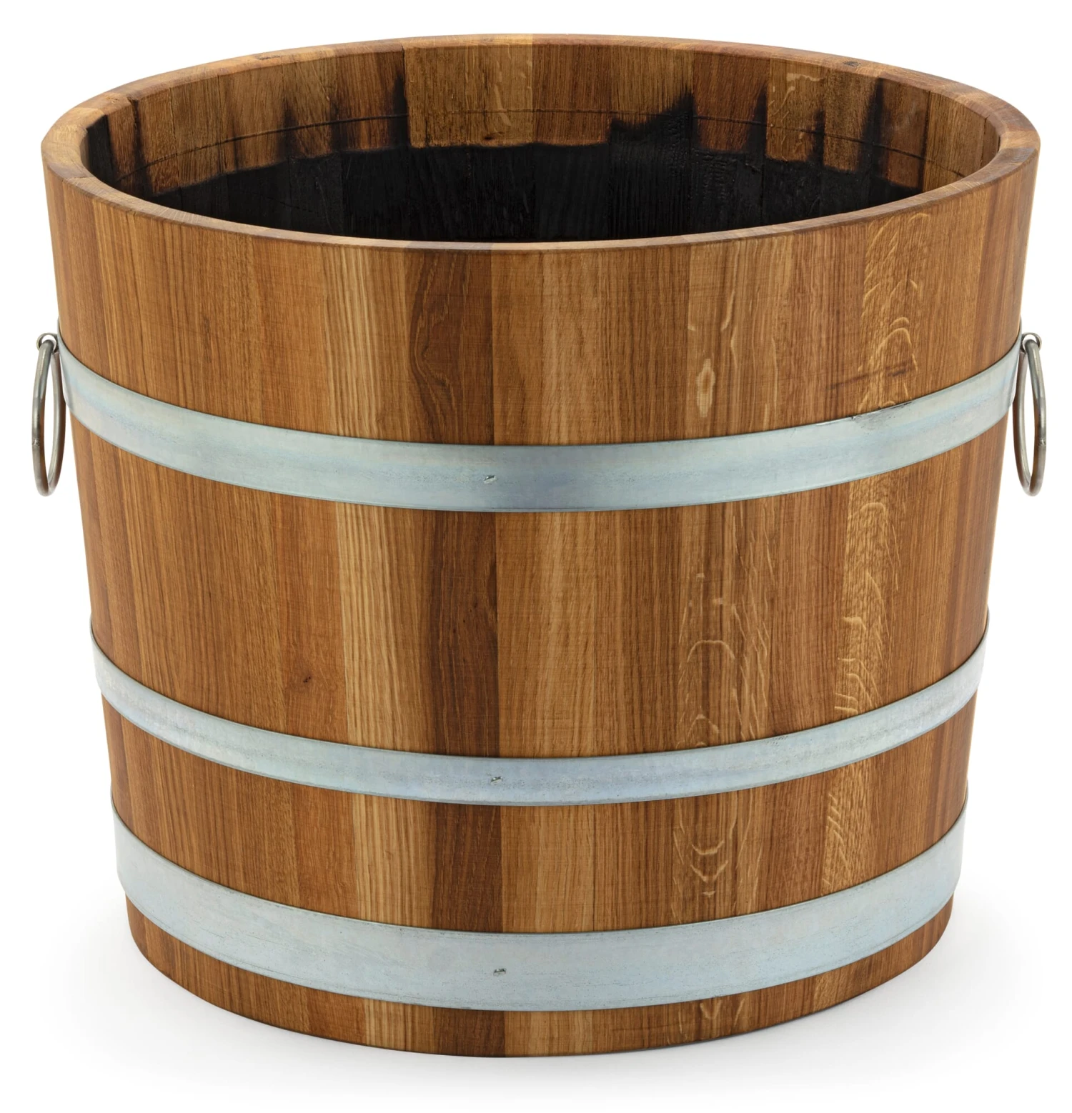 Kübel wie die folgenden aus Eichenholz kennen wir vor allem aus dem repräsentativen Zusammenhang von Schlossgärten, Parks und Orangerien. Sie werden dort hauptsächlich aus gärtnerischen Gründen eingesetzt, da die temperaturausgleichenden Eigenschaften des Holzes die Pflanzen in den Übergangszeiten besser schützen, als Gefäße aus Keramik dies könnten. Unsere Eichenholzkübel sind aus einzelnen Dauben zusammengesetzt, die in handwerklicher Küfertradition „abgerichtet“ und verleimt werden. Stählerne Fassreifen verleihen der robusten Gesamtkonstruktion zusätzlichen Halt. Zu ihrer Langlebigkeit trägt bei, dass die Bottiche von innen vollflächig ausgefeuert werden, denn so sind sie in besonderer Weise vor Fäulnis geschützt. Stabile Kastengriffe aus Edelstahl erleichern den Transport, und ein Wasserabzugsloch im Boden verhindert Staunässe. Derart gerüstet, machen unsere Pflanzkübel aus Eichenholz auf Ihrer Terrasse und in Ihrem (Winter-)Garten garantiert eine gute Figur. Der Hersteller in Bad Dürkheim bezieht übrigens das Rohmaterial aus nachhaltiger Waldwirtschaft im Pfälzer Wald – nachbarschaftflicher geht’s kaum.